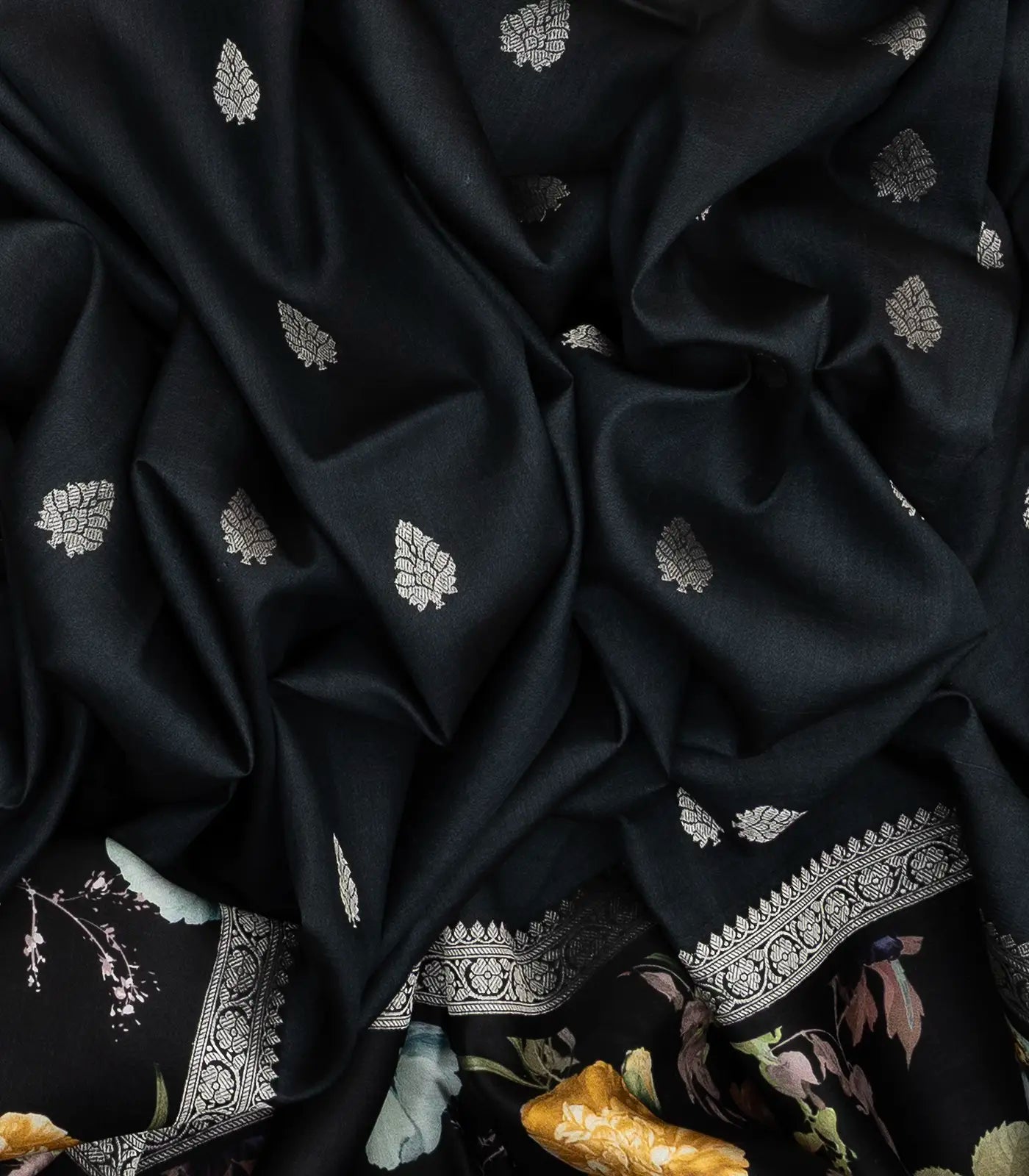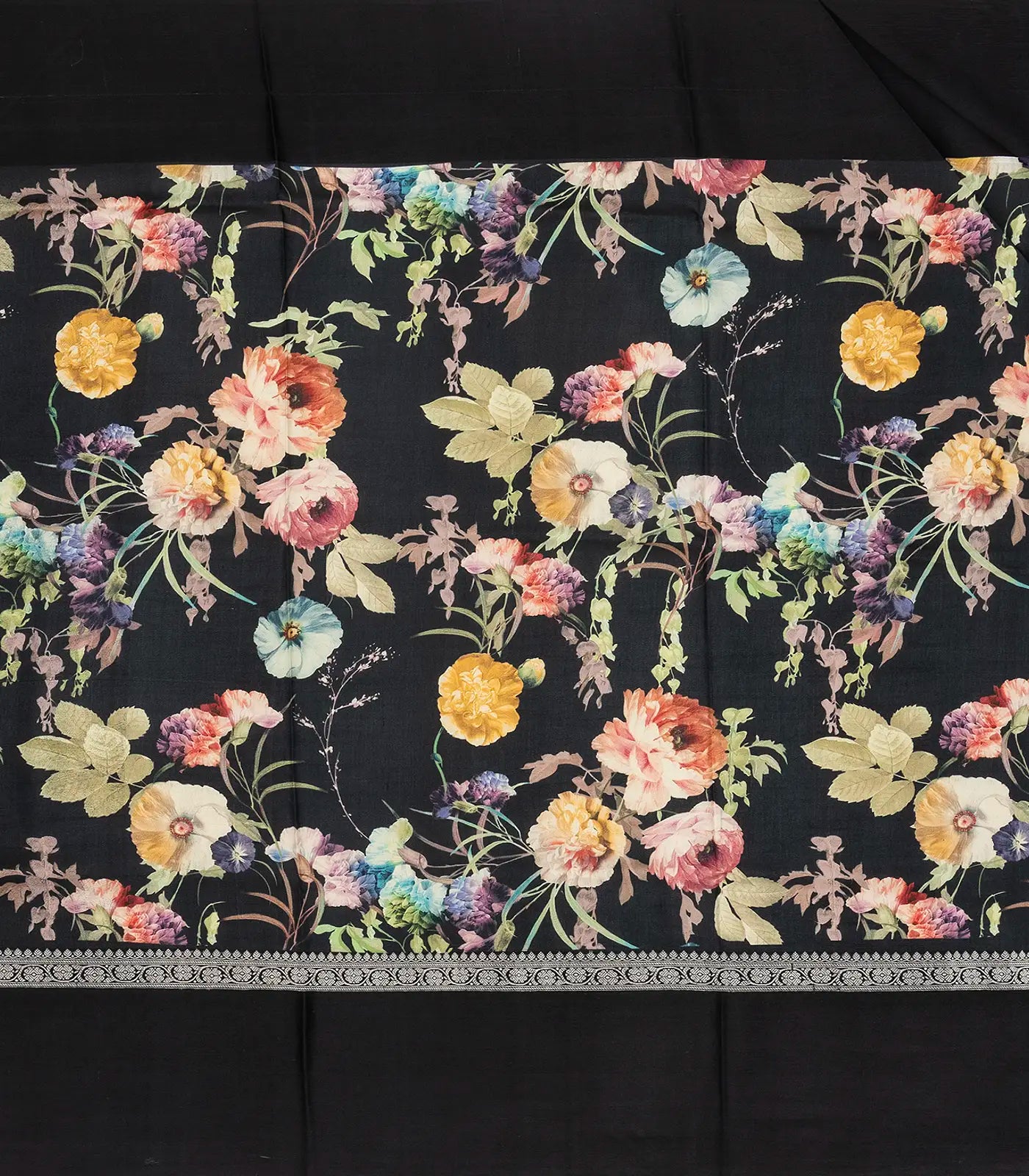 Black Handloom Tussar Silk Saree With Printed Floral Border