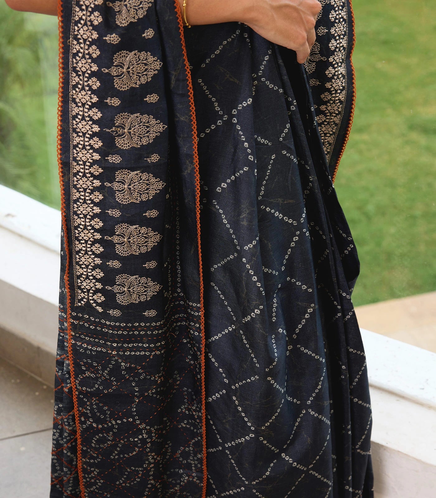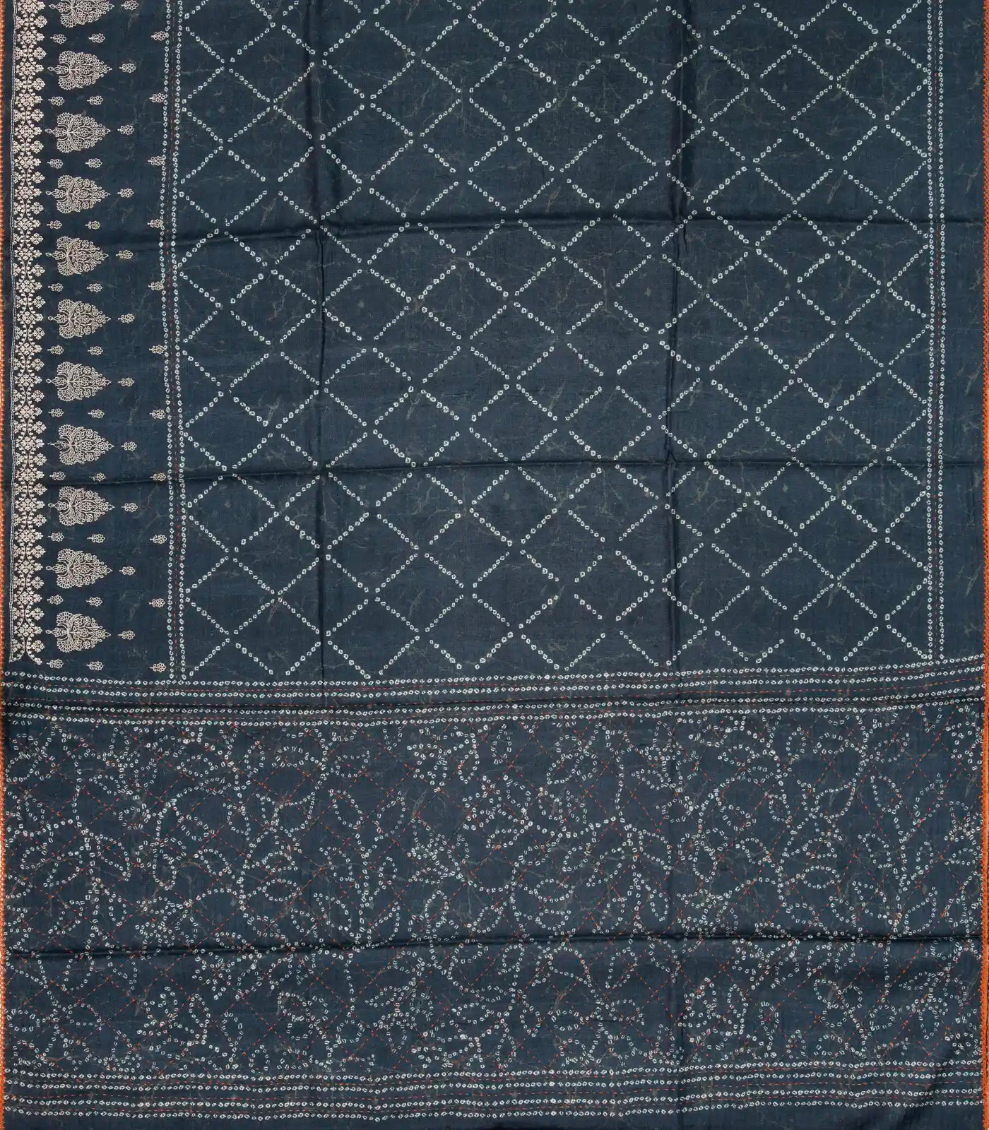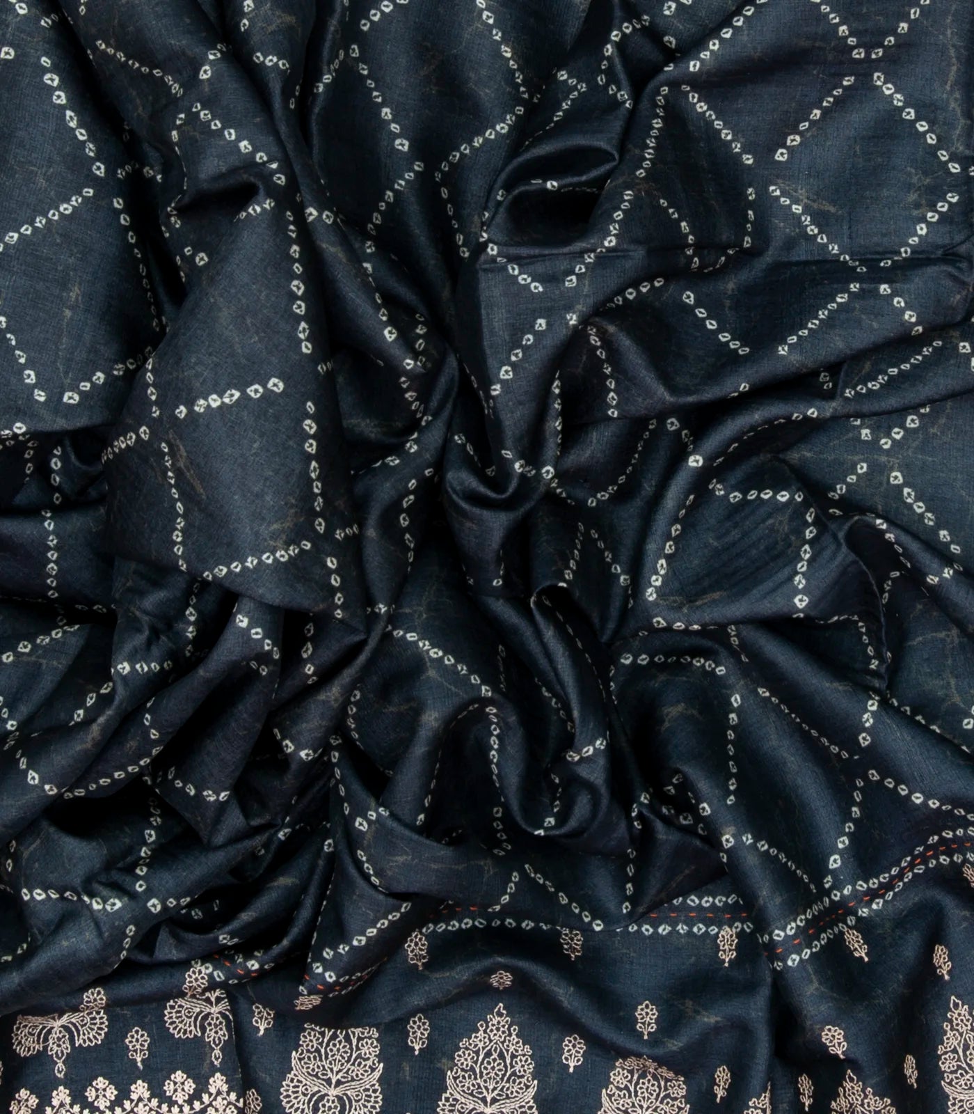This handwoven tussar silk saree is filled with printed shibori floral motifs in black body along with border and pallu