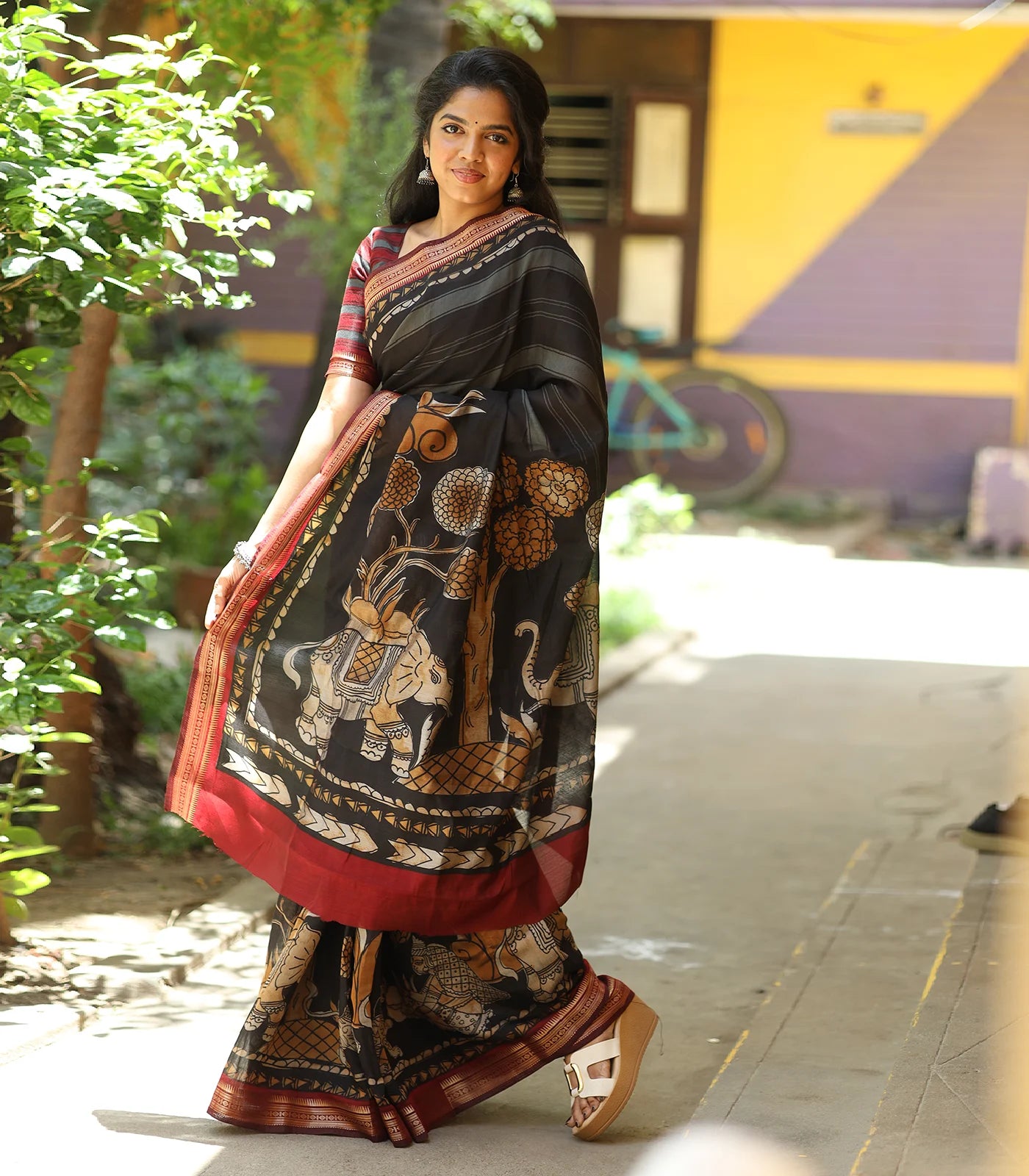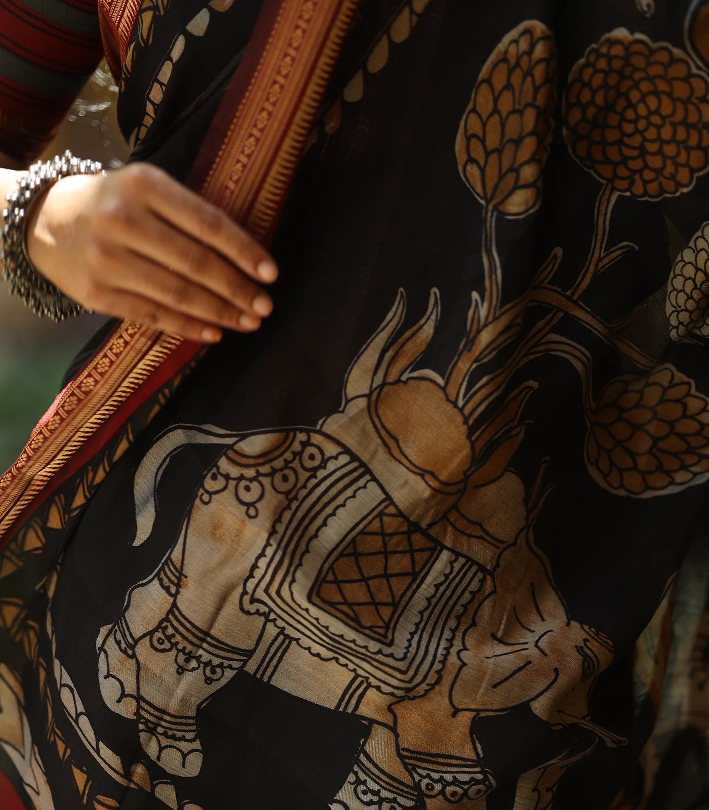 This woven art chanderi saree is printed with elephant motifs in black body along with contrast border and pallu