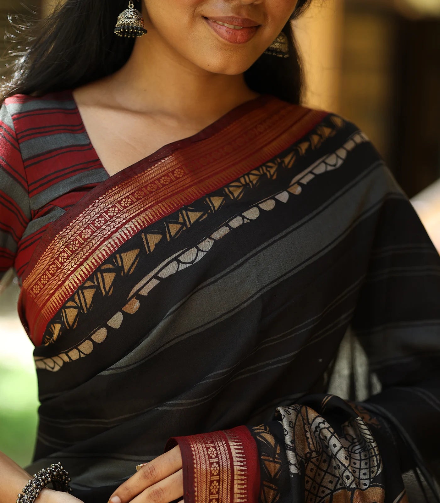 Black Woven Art Chanderi Saree With Printed Elephant Motifs-BL3537