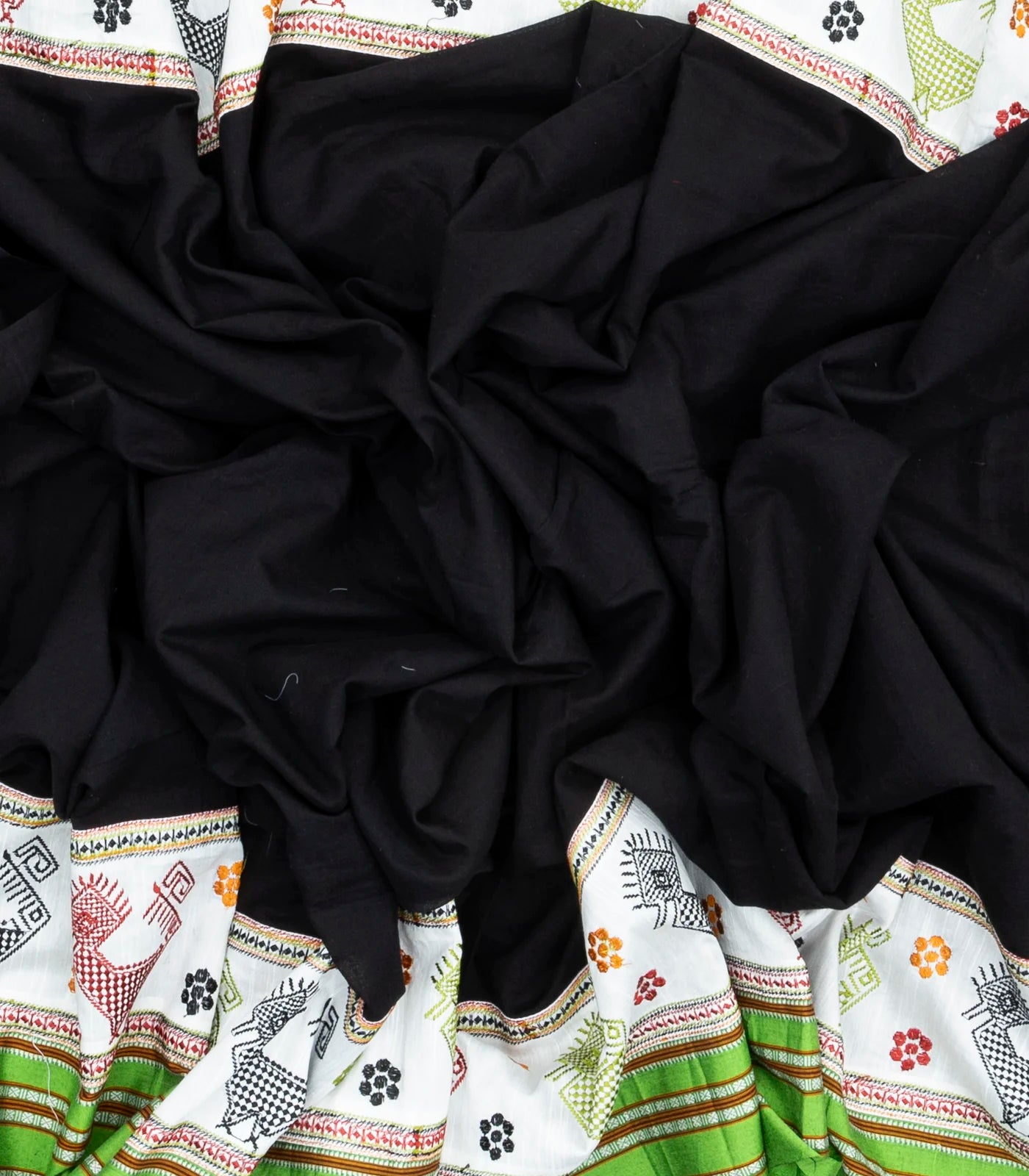 This woven cotton saree is filled with plain black body along with contrast kasuti hand embroidered motifs in border and pallu