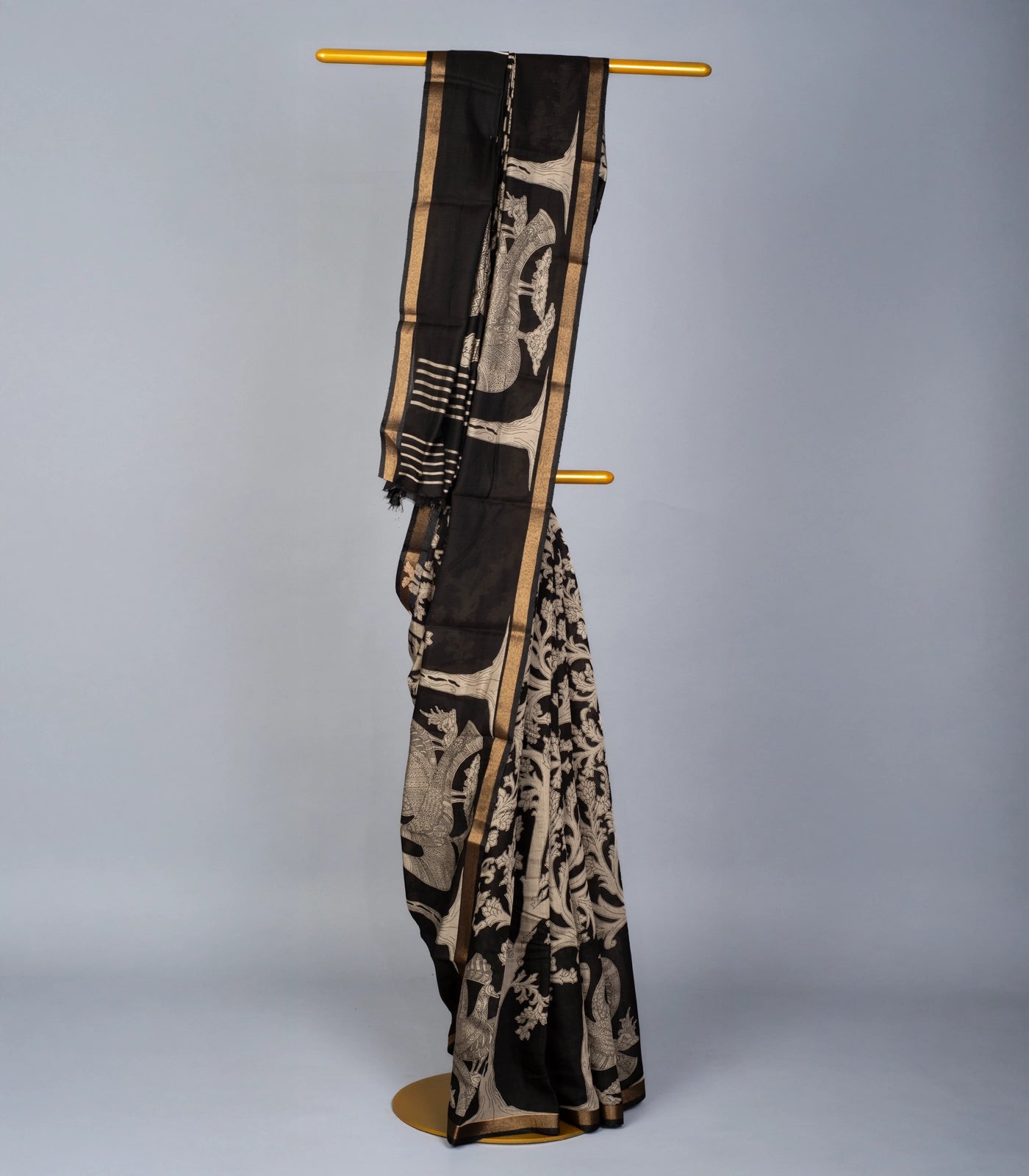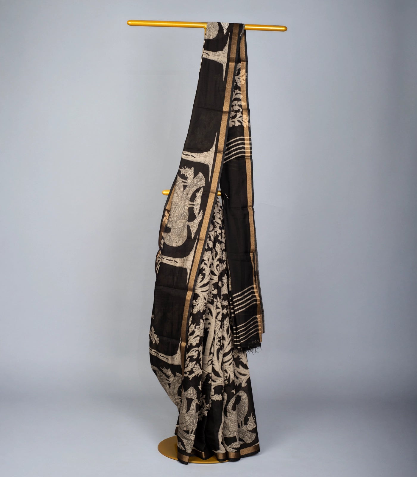 Black Woven Synthetic Chanderi Cotton Saree With Printed Kalamkari Motifs-BL3645