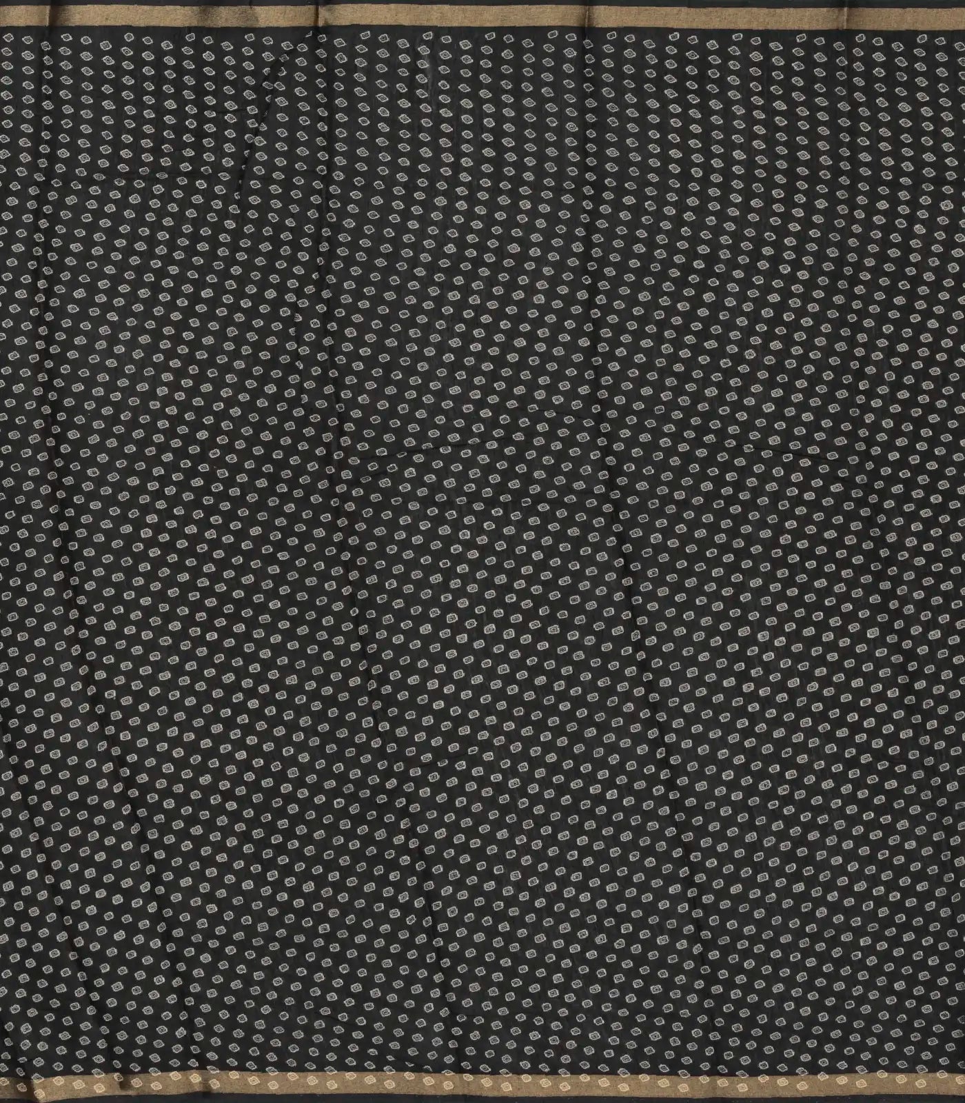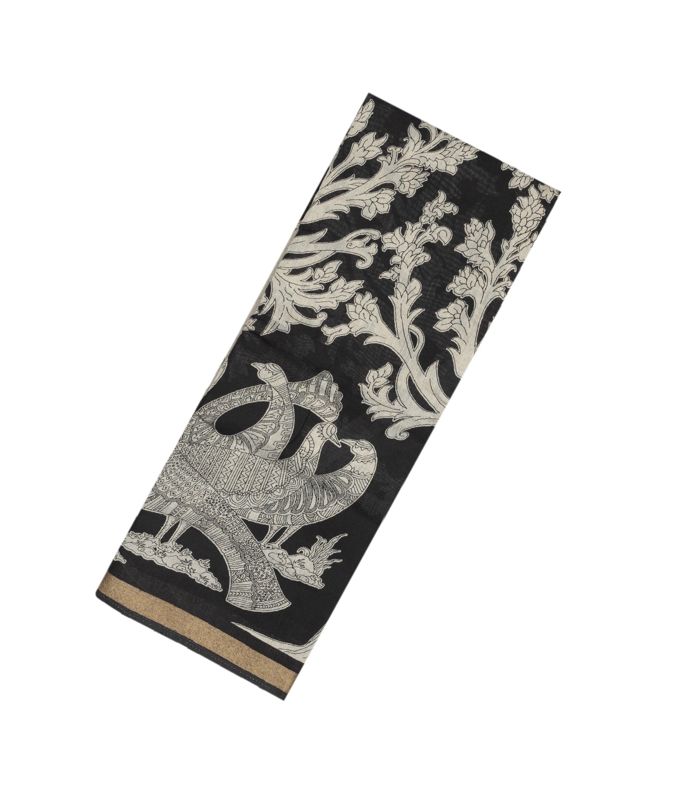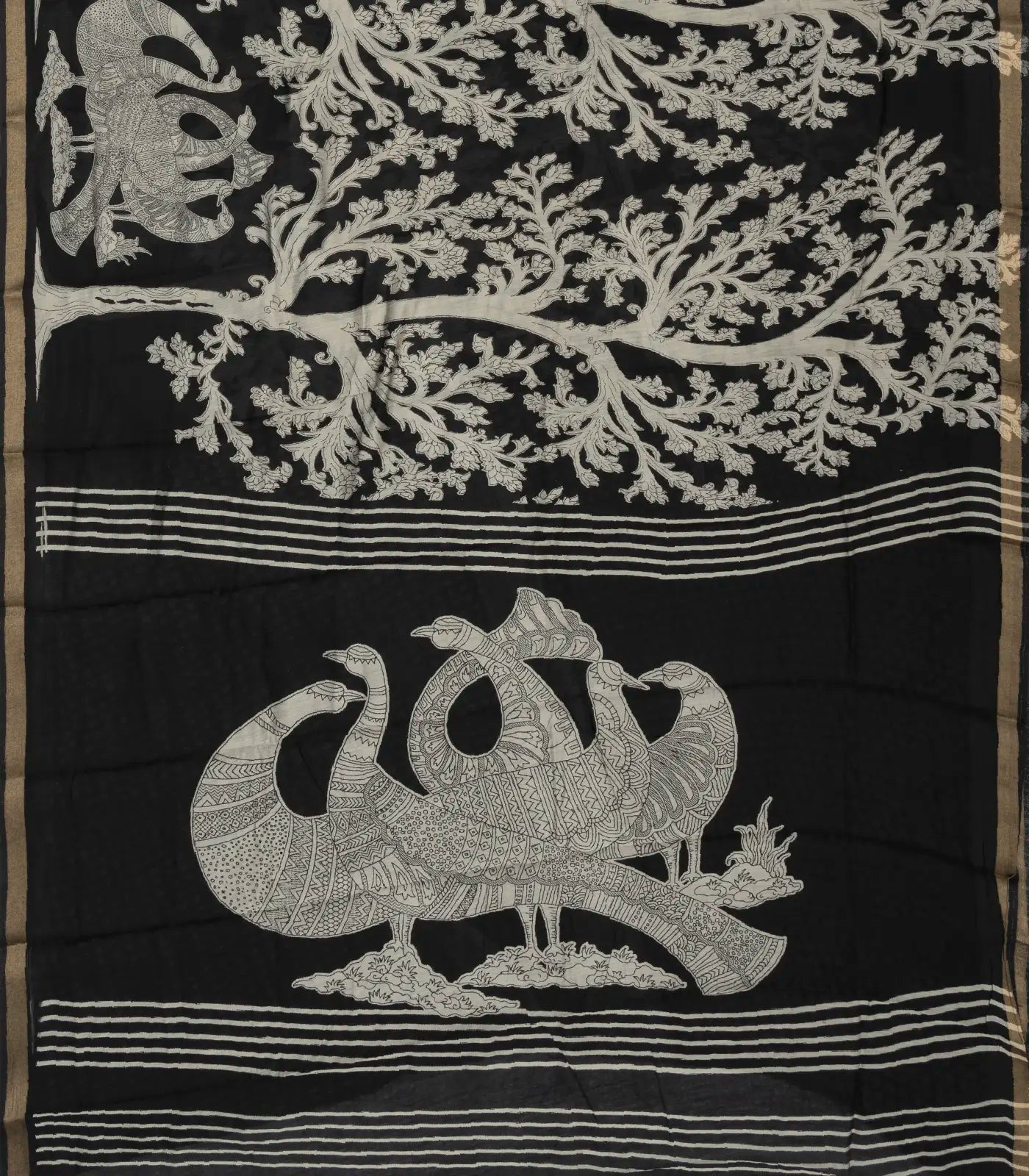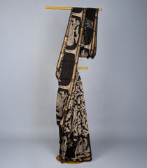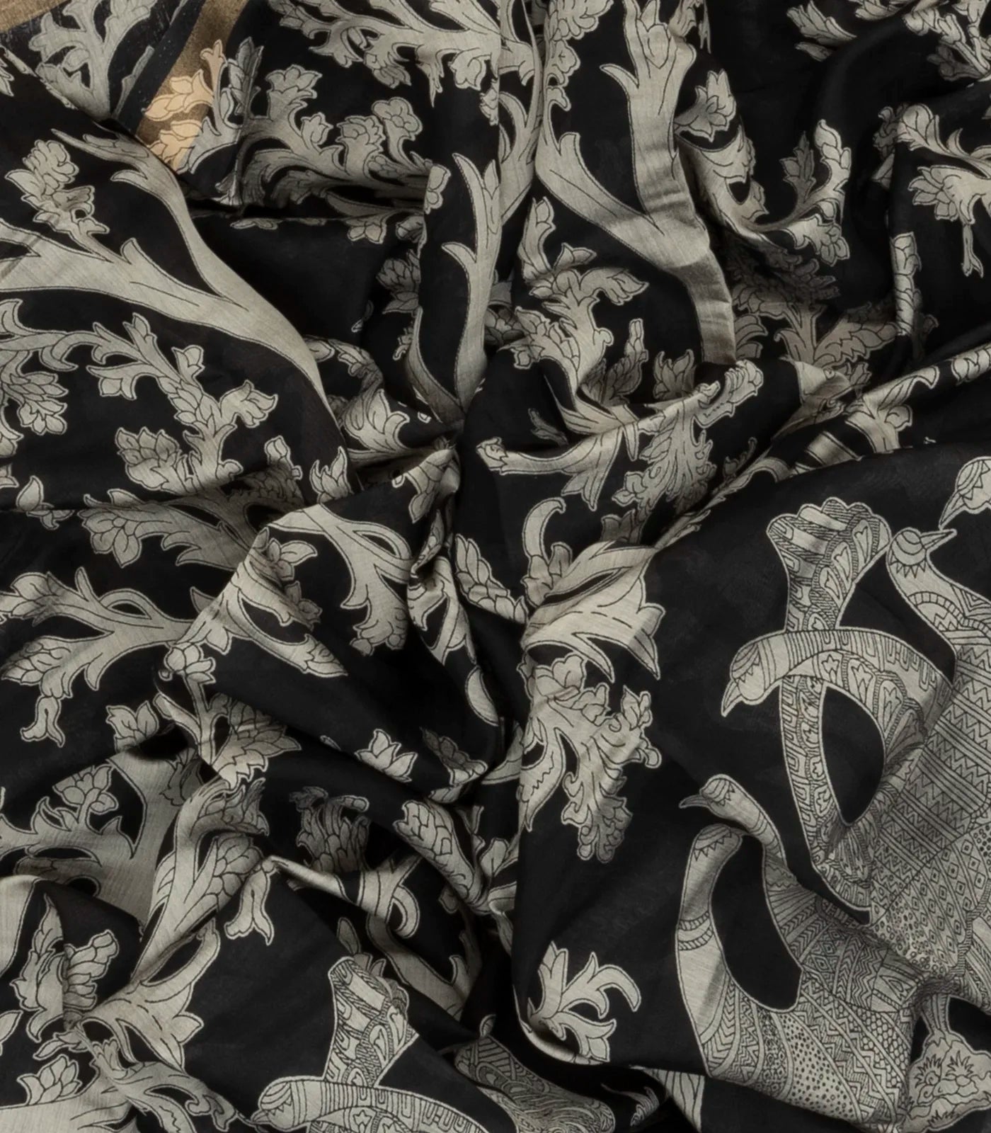 This woven synthetic chanderi cotton saree is filled with printed kalamkari motifs in black body along with border and pallu