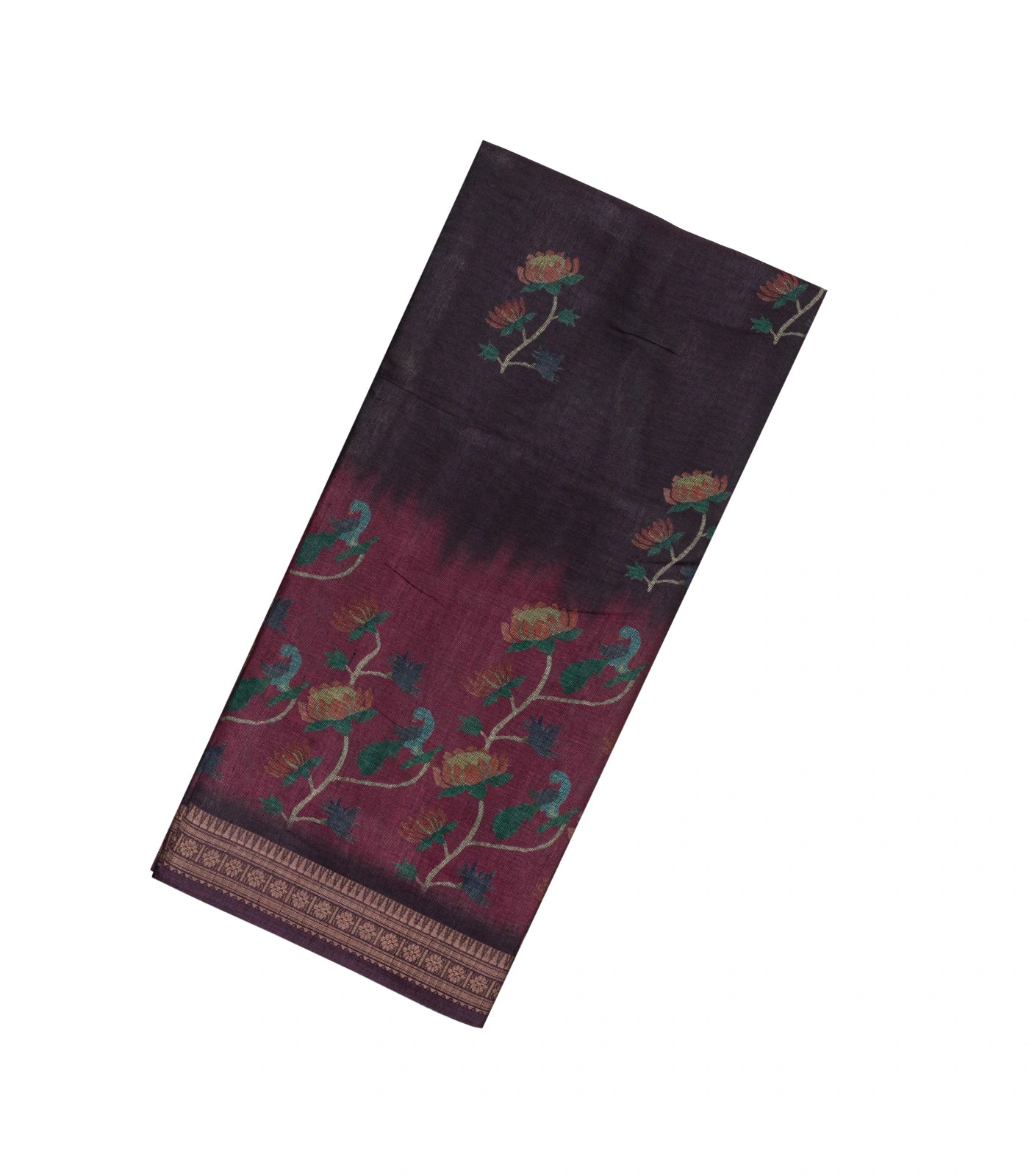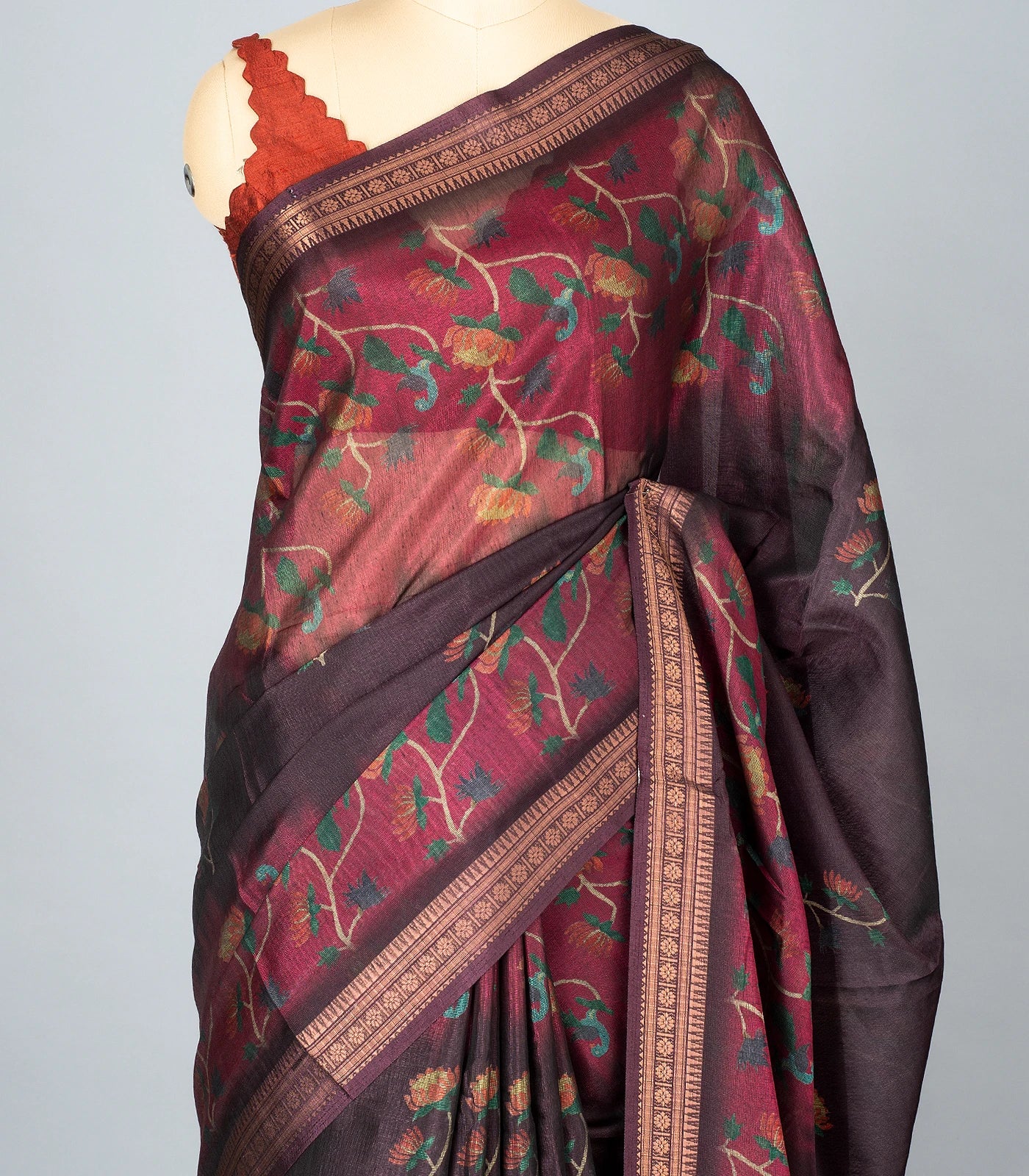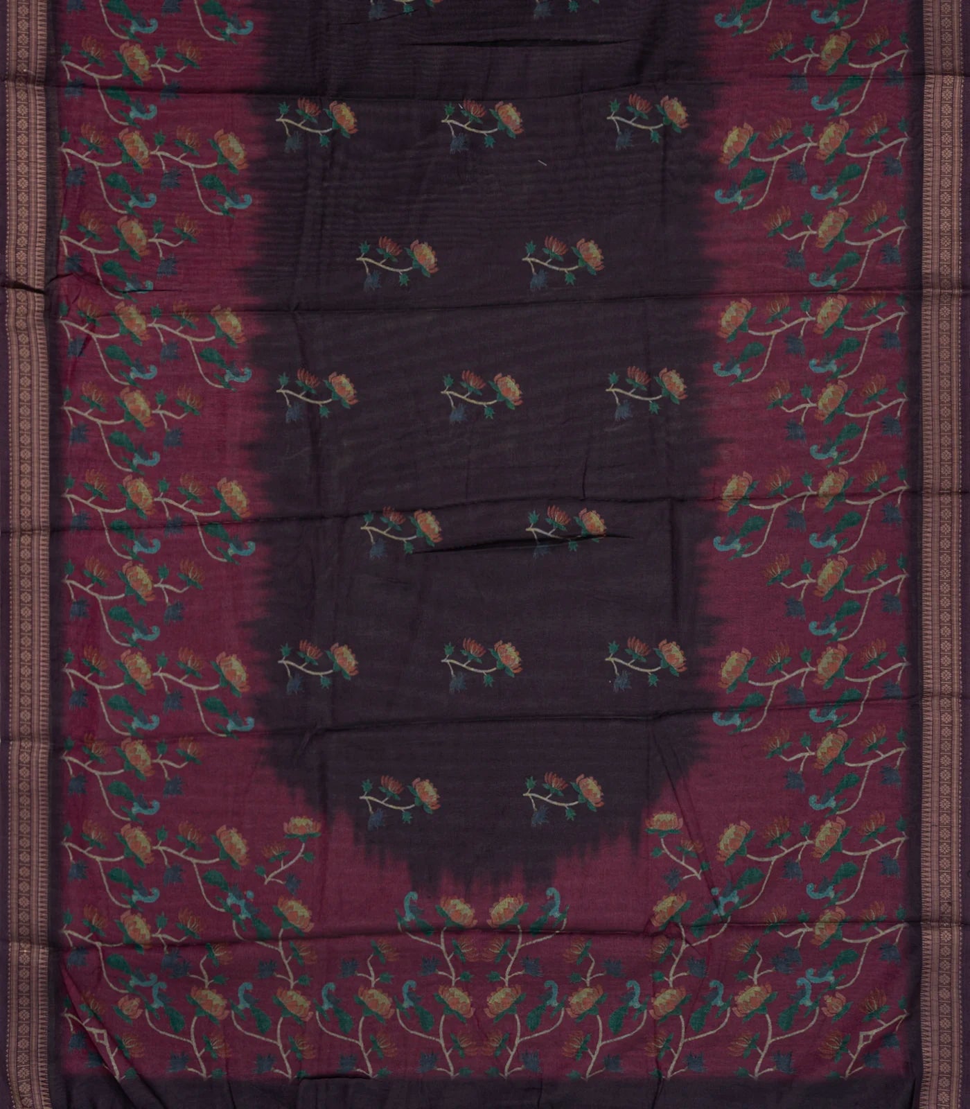This woven synthetic cotton saree is filled with printed floral motifs in black body along with border and pallu