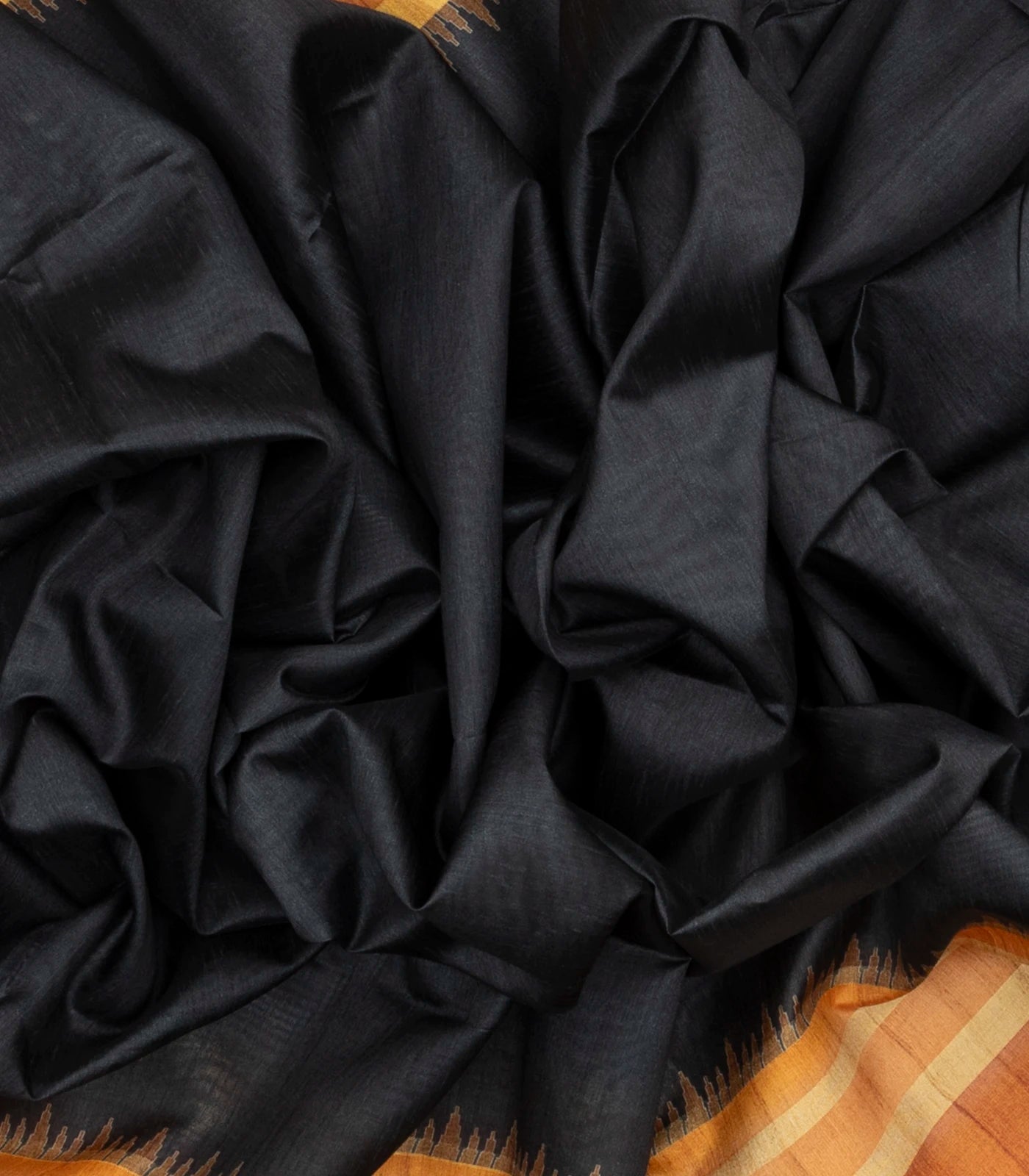 This woven synthetic dupion saree is filled with plain black body along with contrast border and pallu