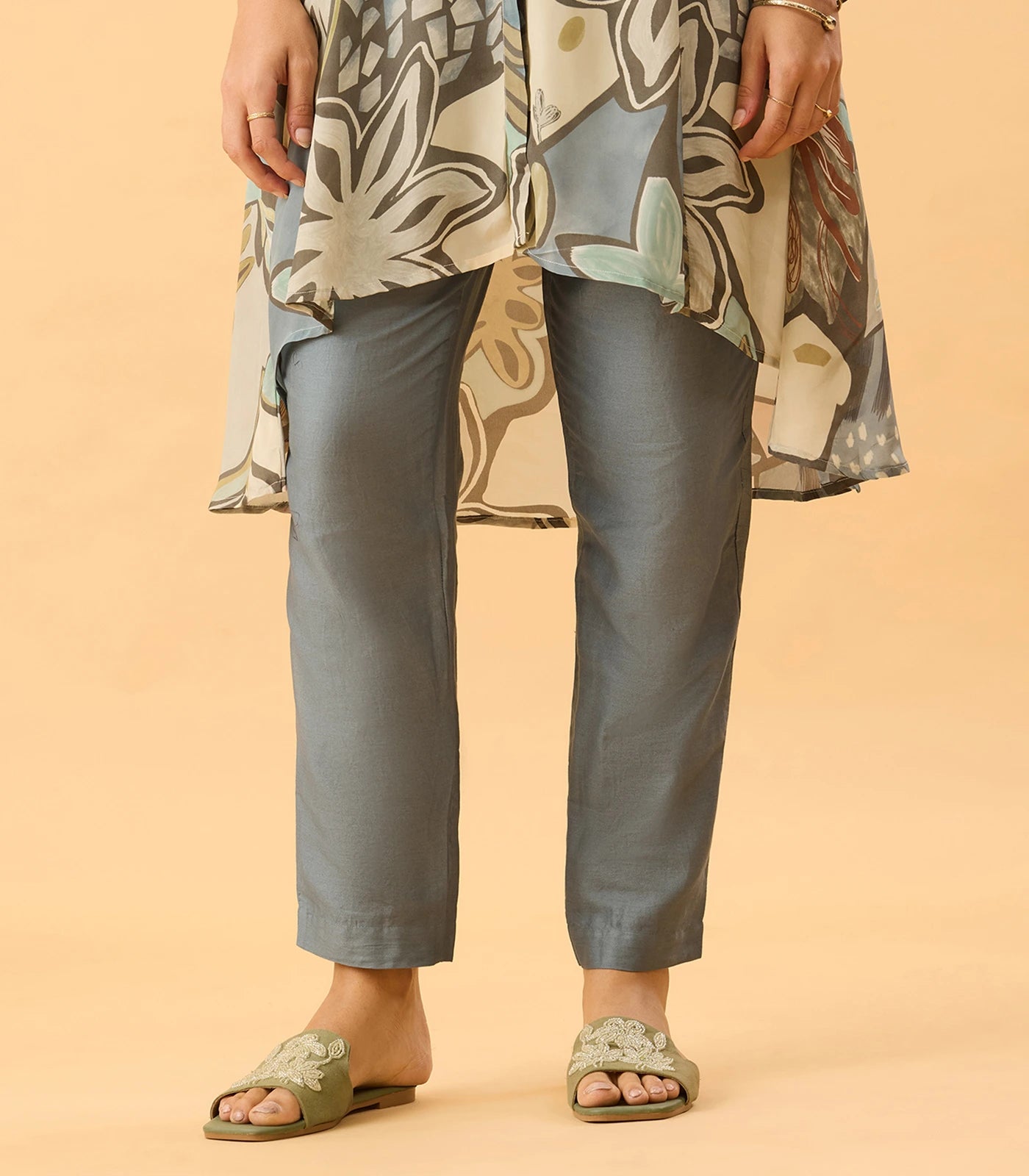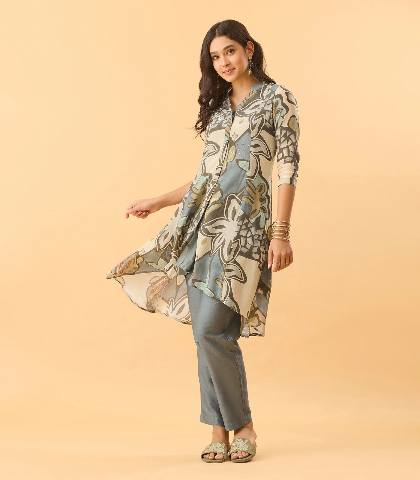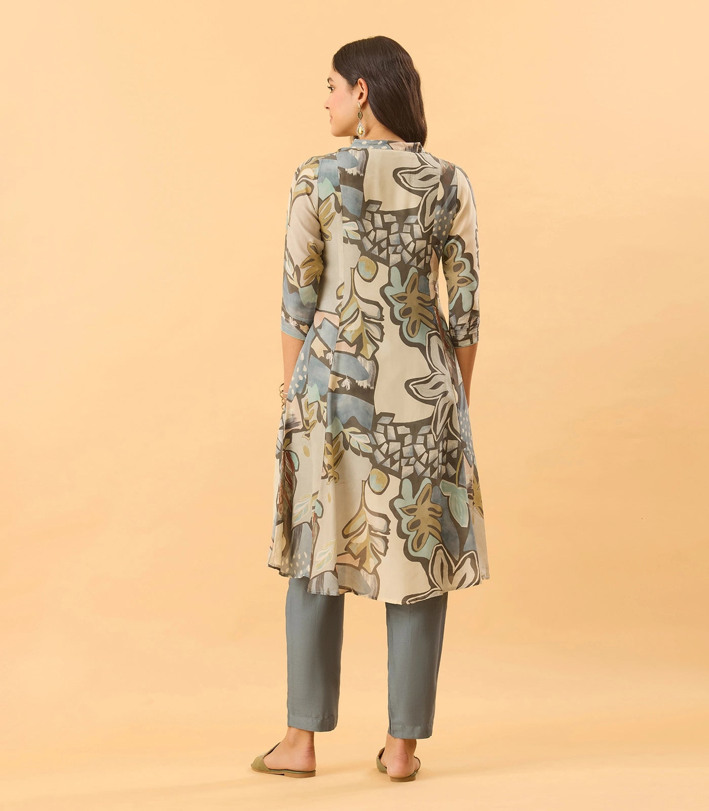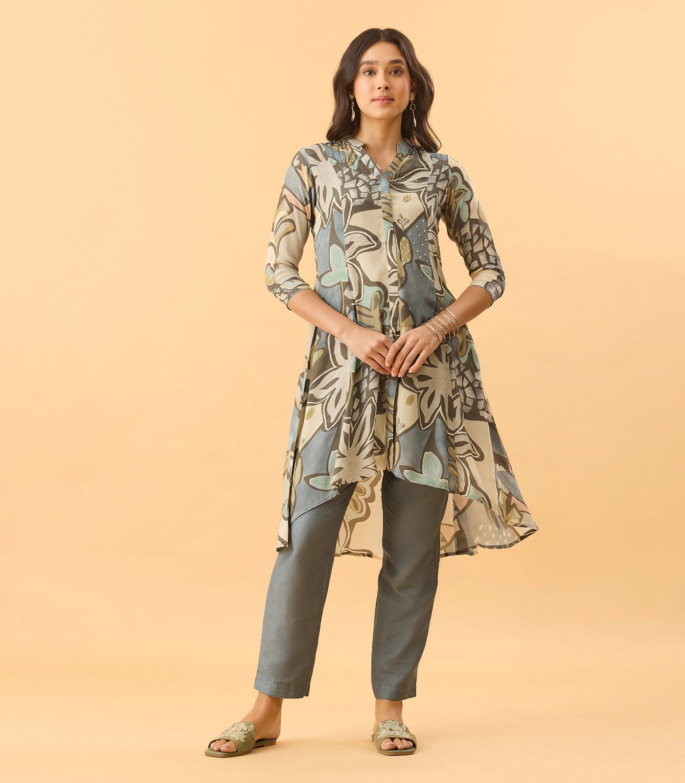 A- Line flared silhouette with asymmetrical hemline.