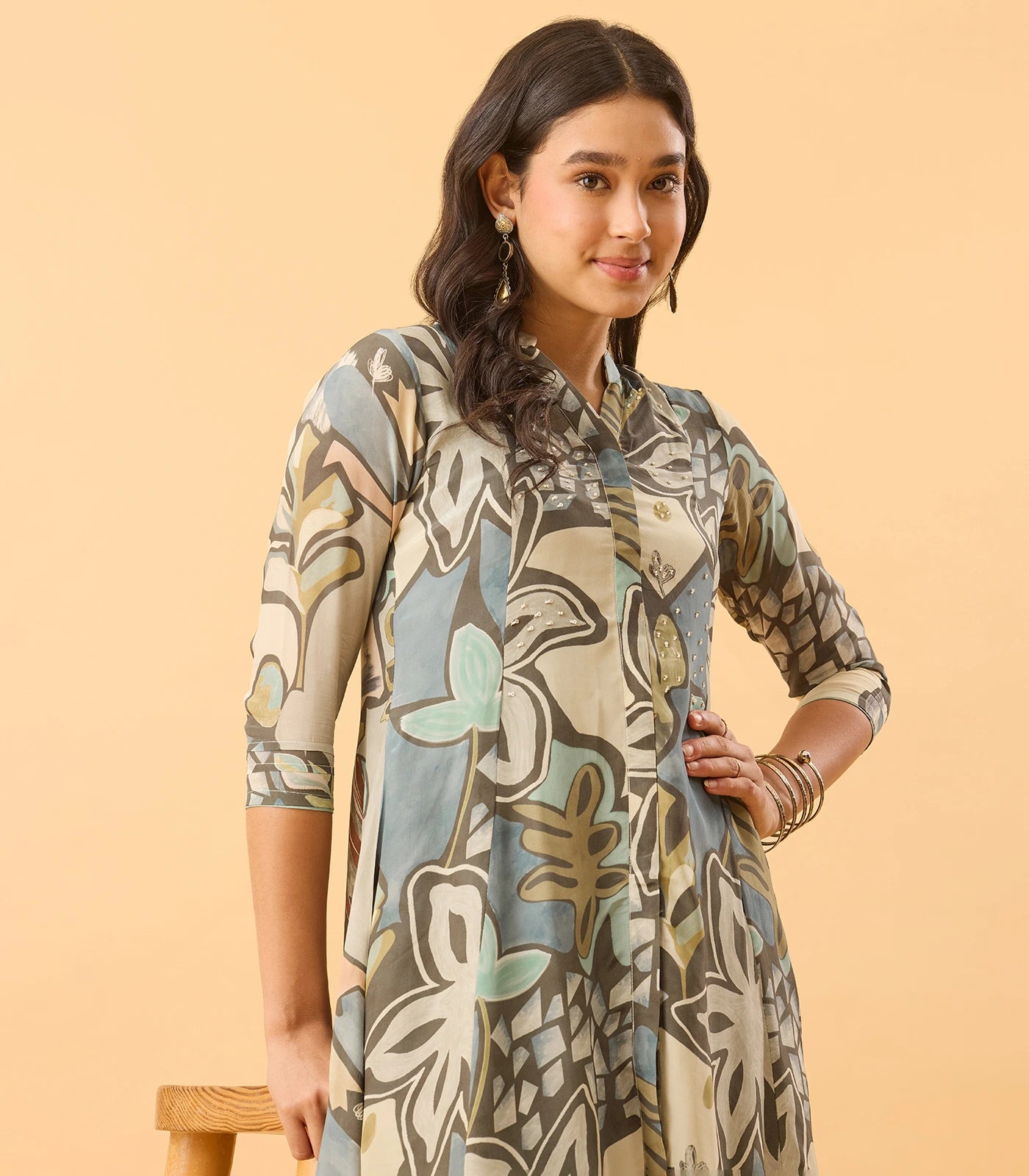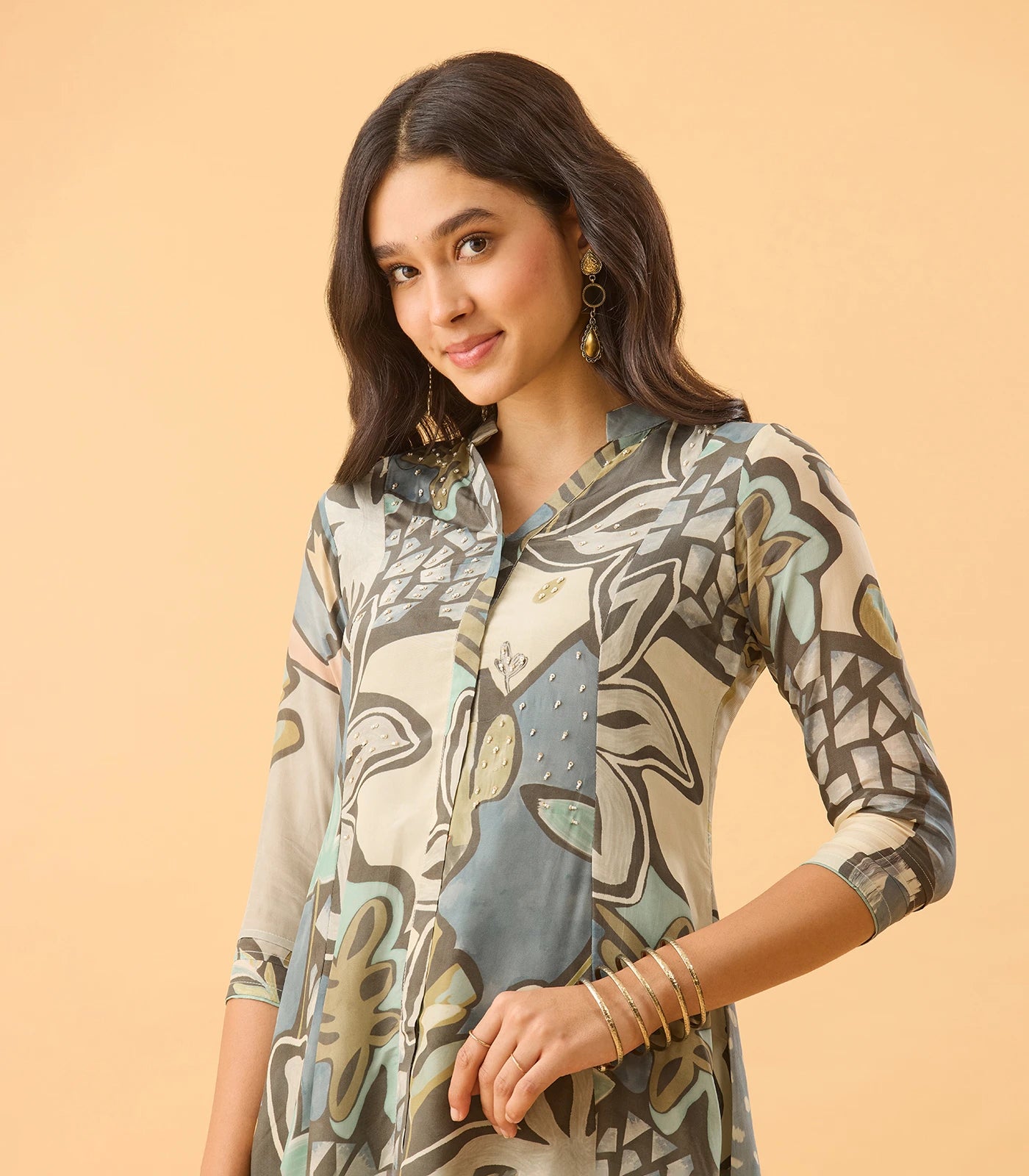 Mandarin collared neckline.