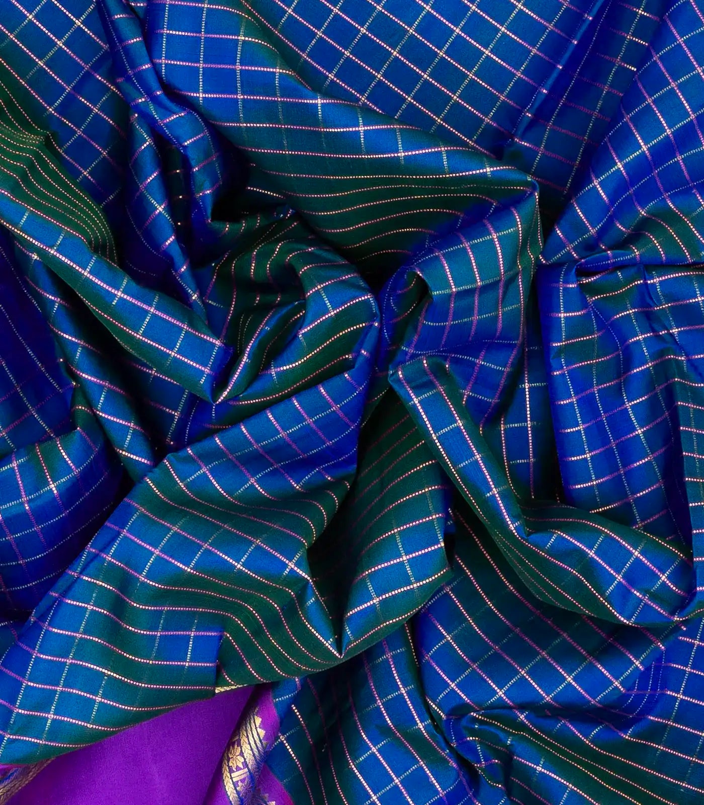 This handwoven nine yards kanchipuram silk saree with zari checks in blue body along with zari border and pallu