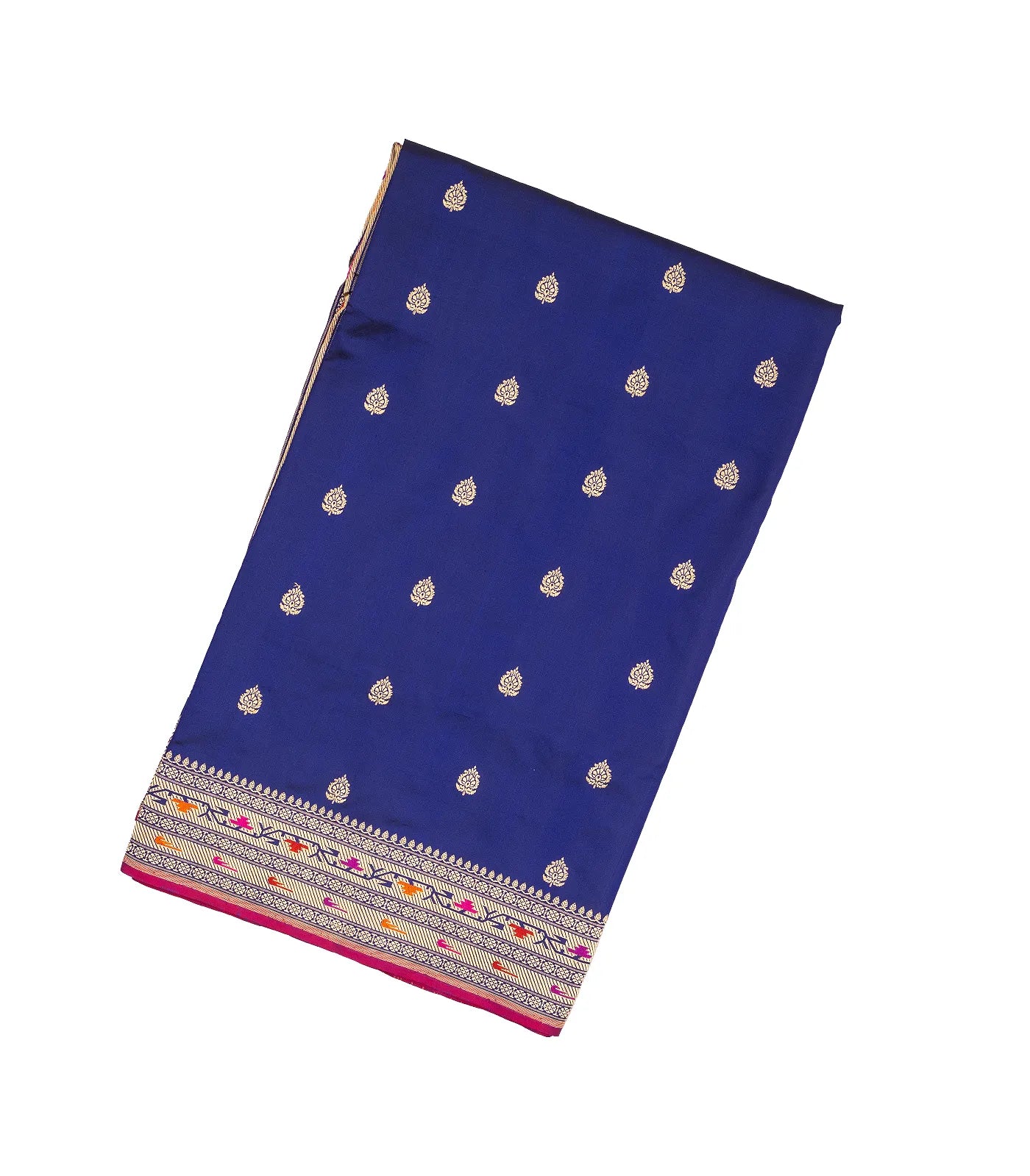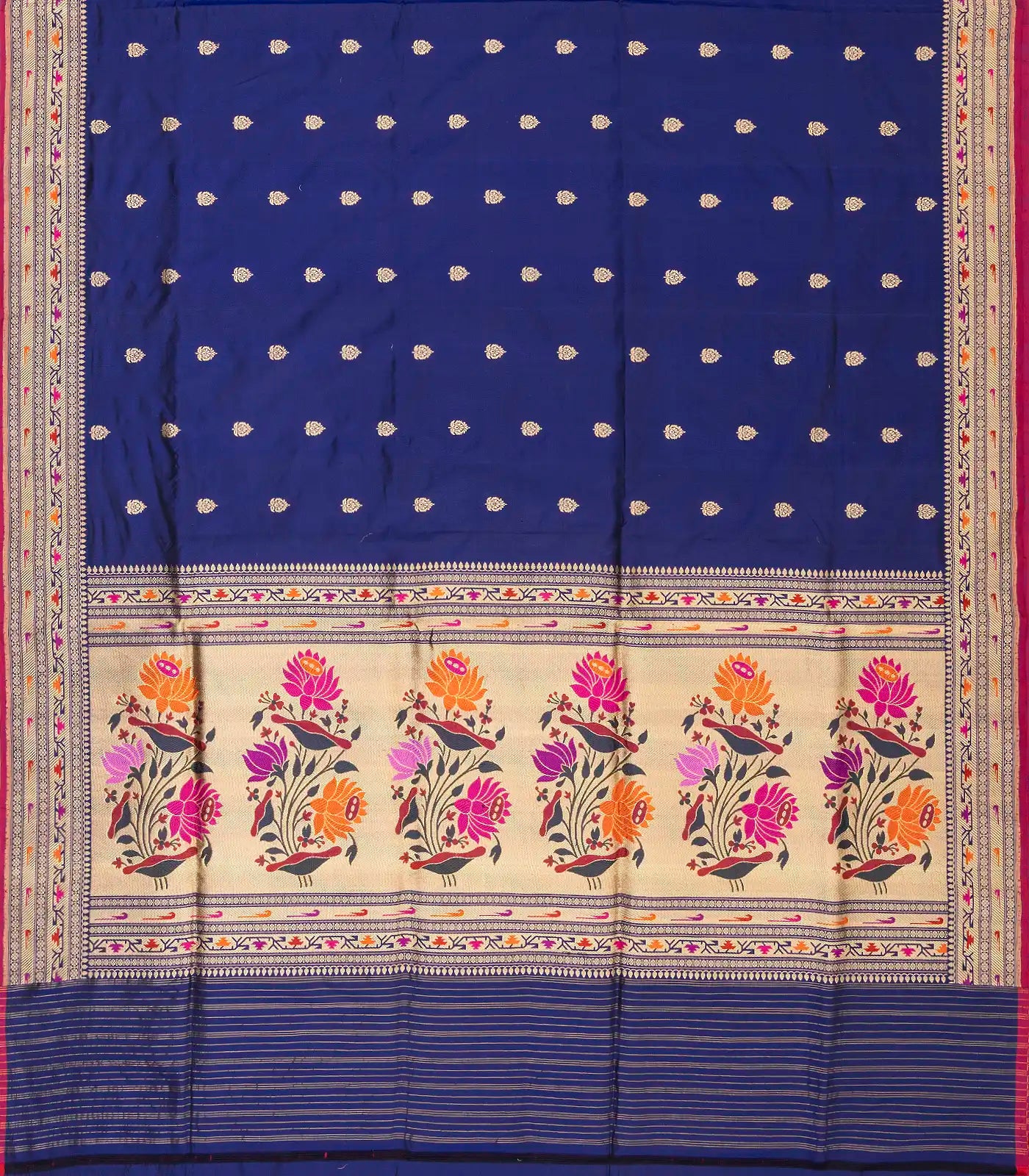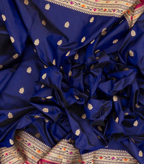This handwoven banarasi silk saree is filled with floral buttas in blue body along with contrast meena border and pallu