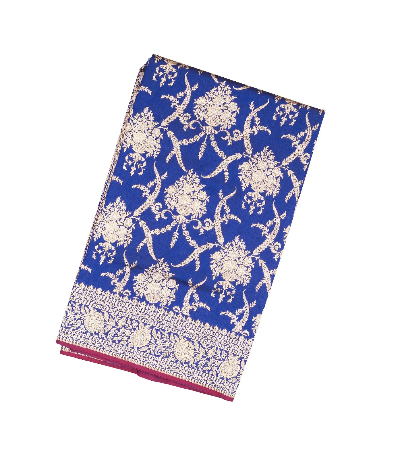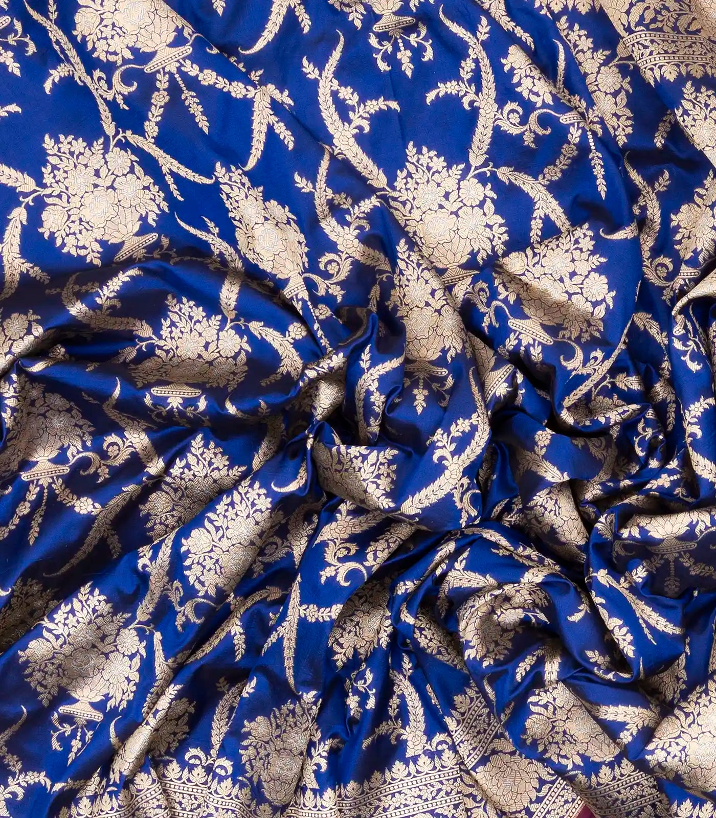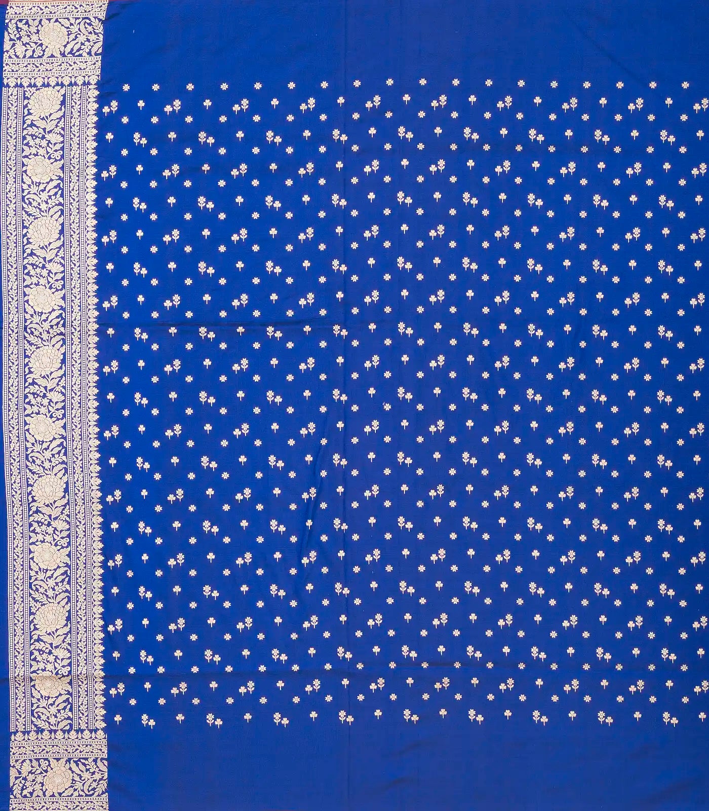 This handwoven banarasi silk saree is filled with floral motifs in blue body along with border and pallu