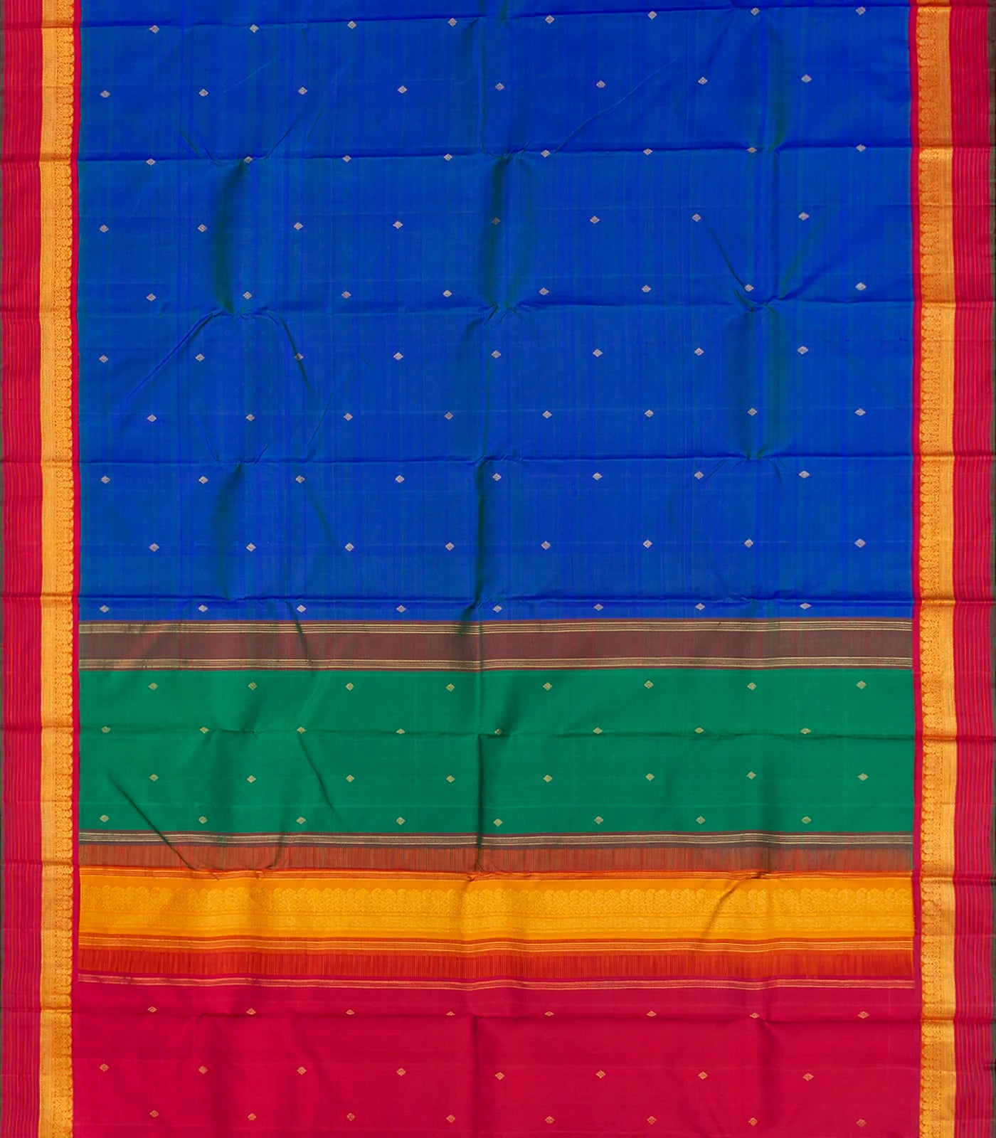 This handloom kanchipuram silk saree is filled with buttas in blue body along with contrast red border and pallu