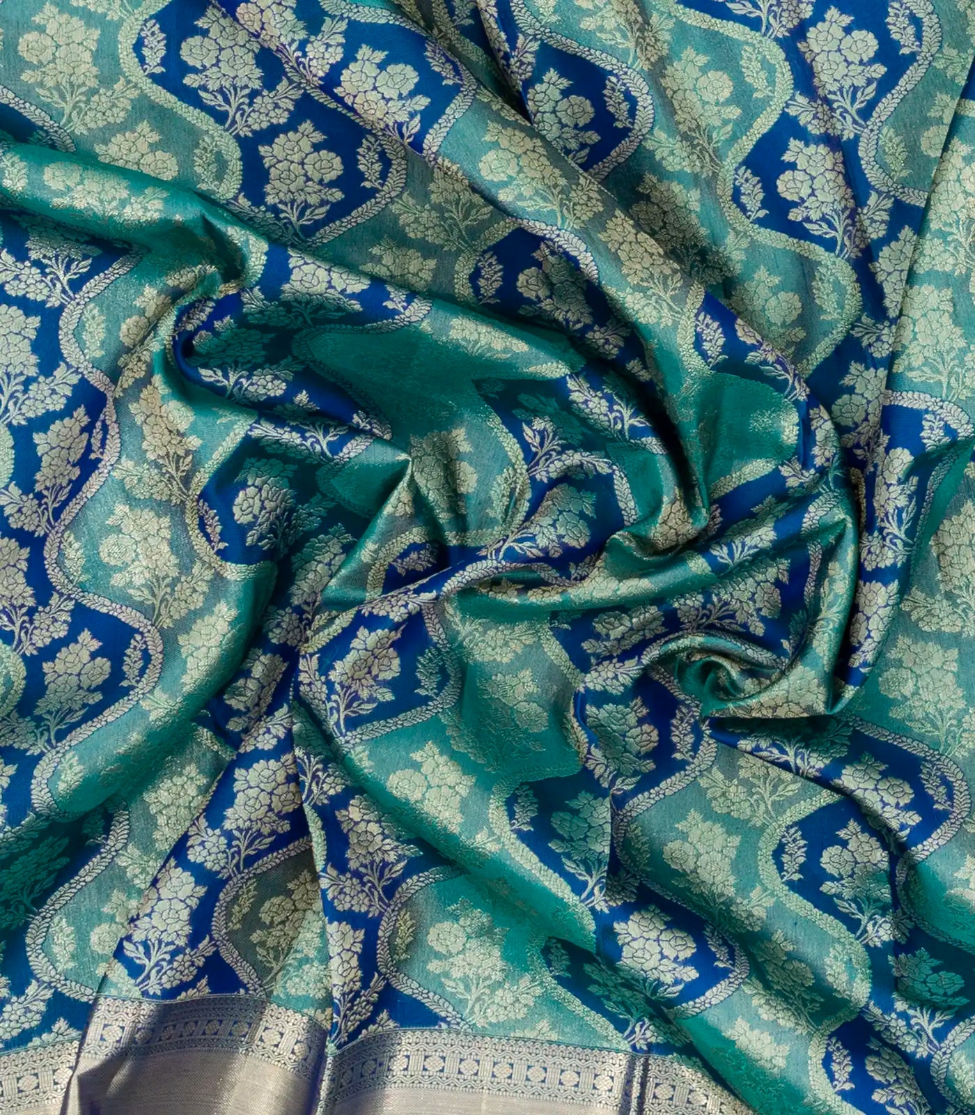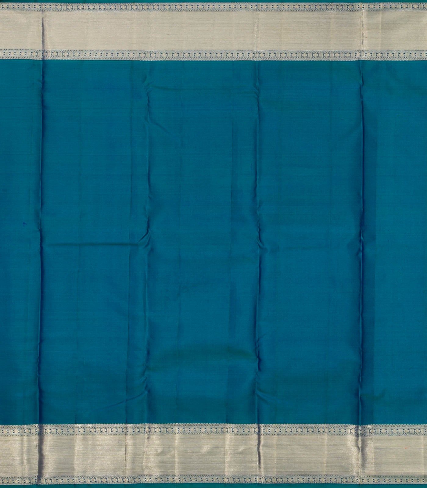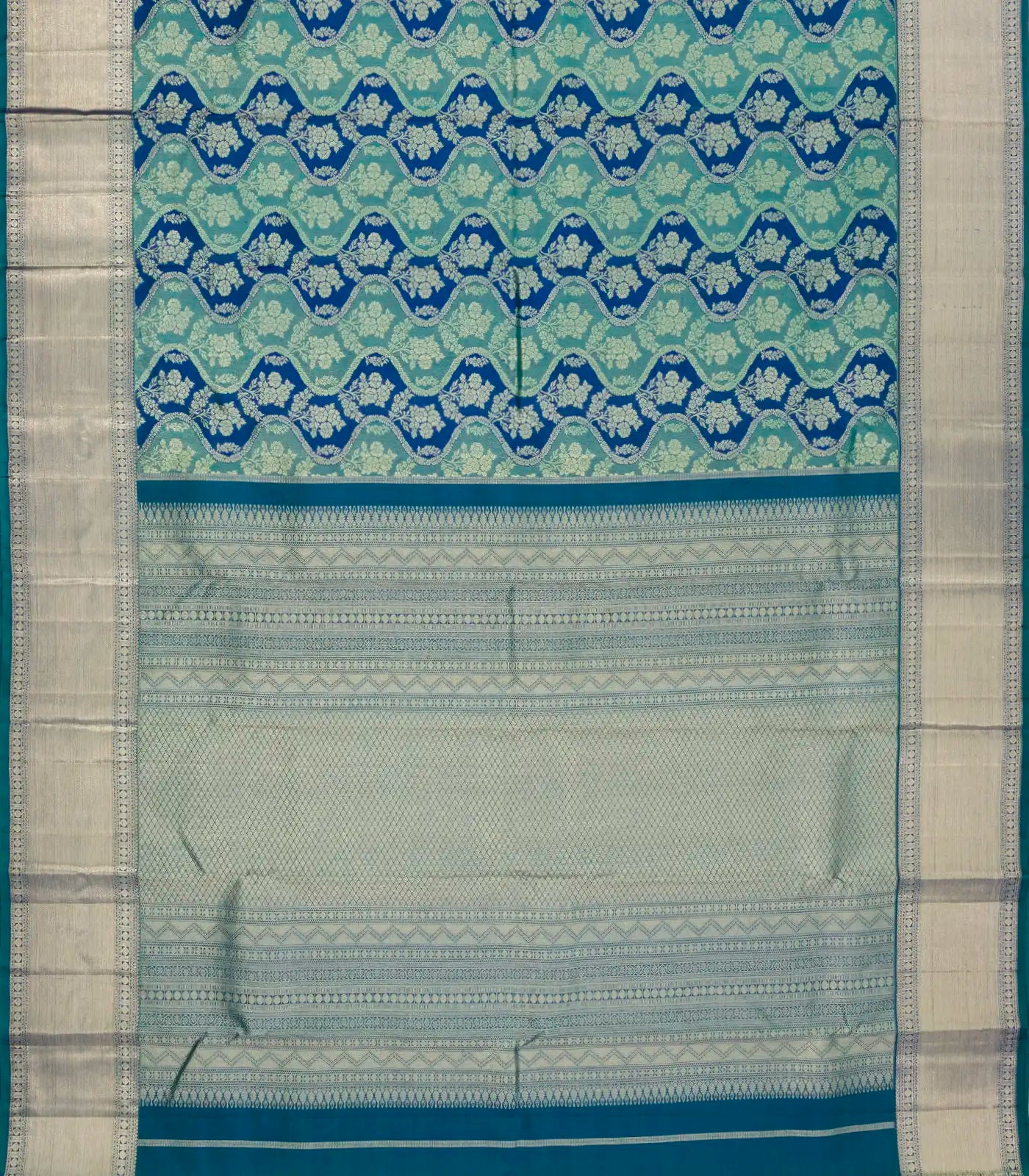 This handwoven kanchipuram silk saree is filled with meena floral motifs in blue body along with border and pallu