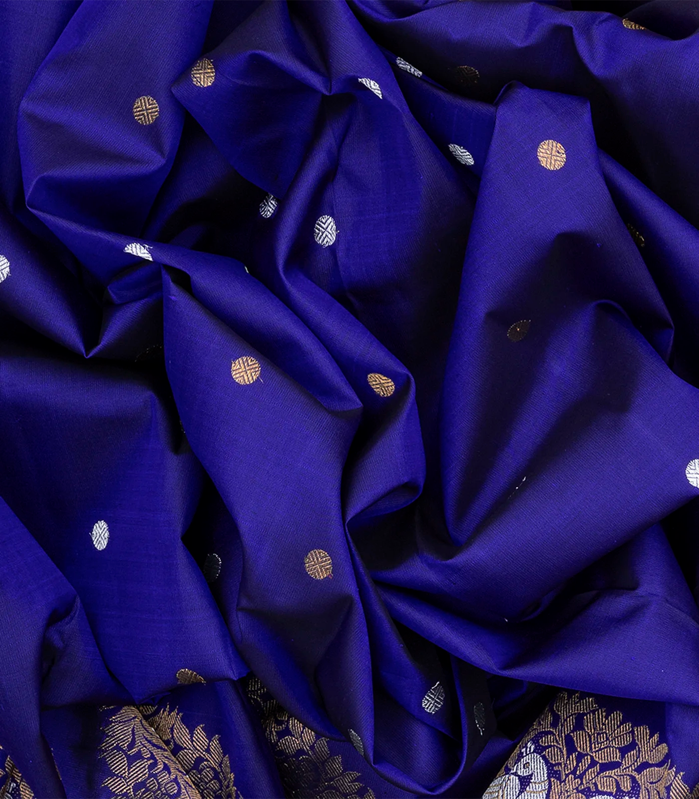 This handwoven kanchipuram silk saree is filled with rudraksham motifs in blue body along with peacock motifs in border and pallu