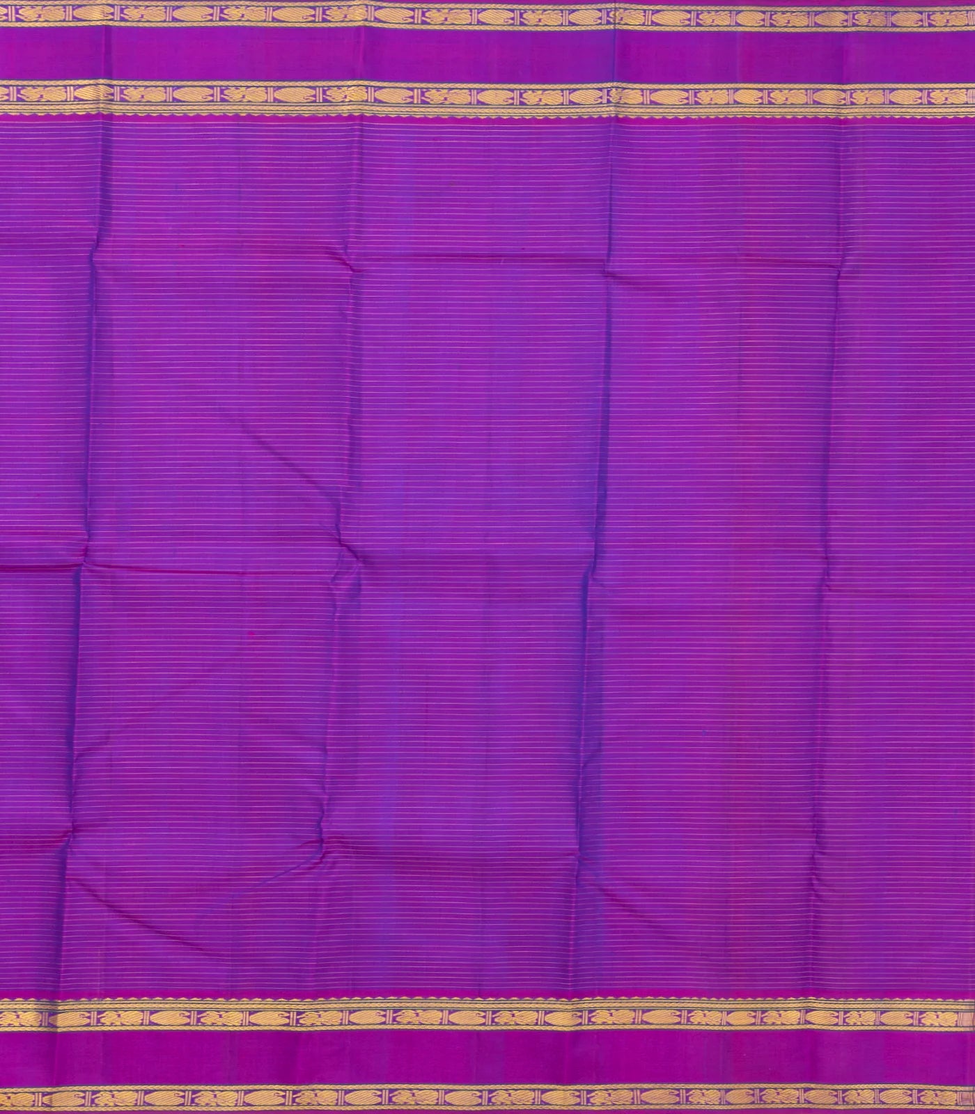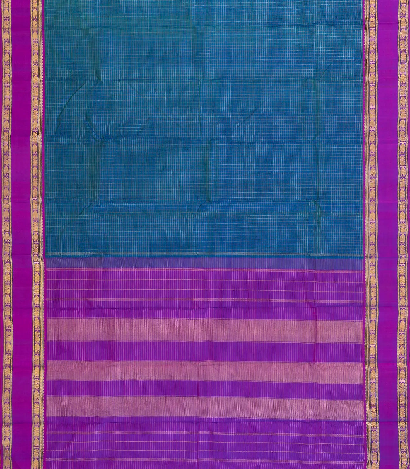 This handwoven kanchipuram silk saree is filled with checks in blue body along with purple border and pallu
