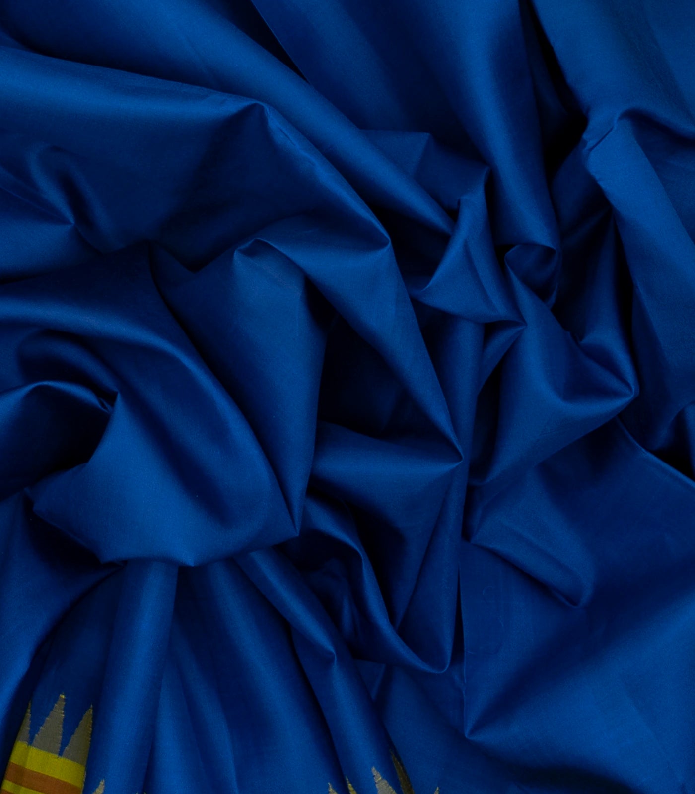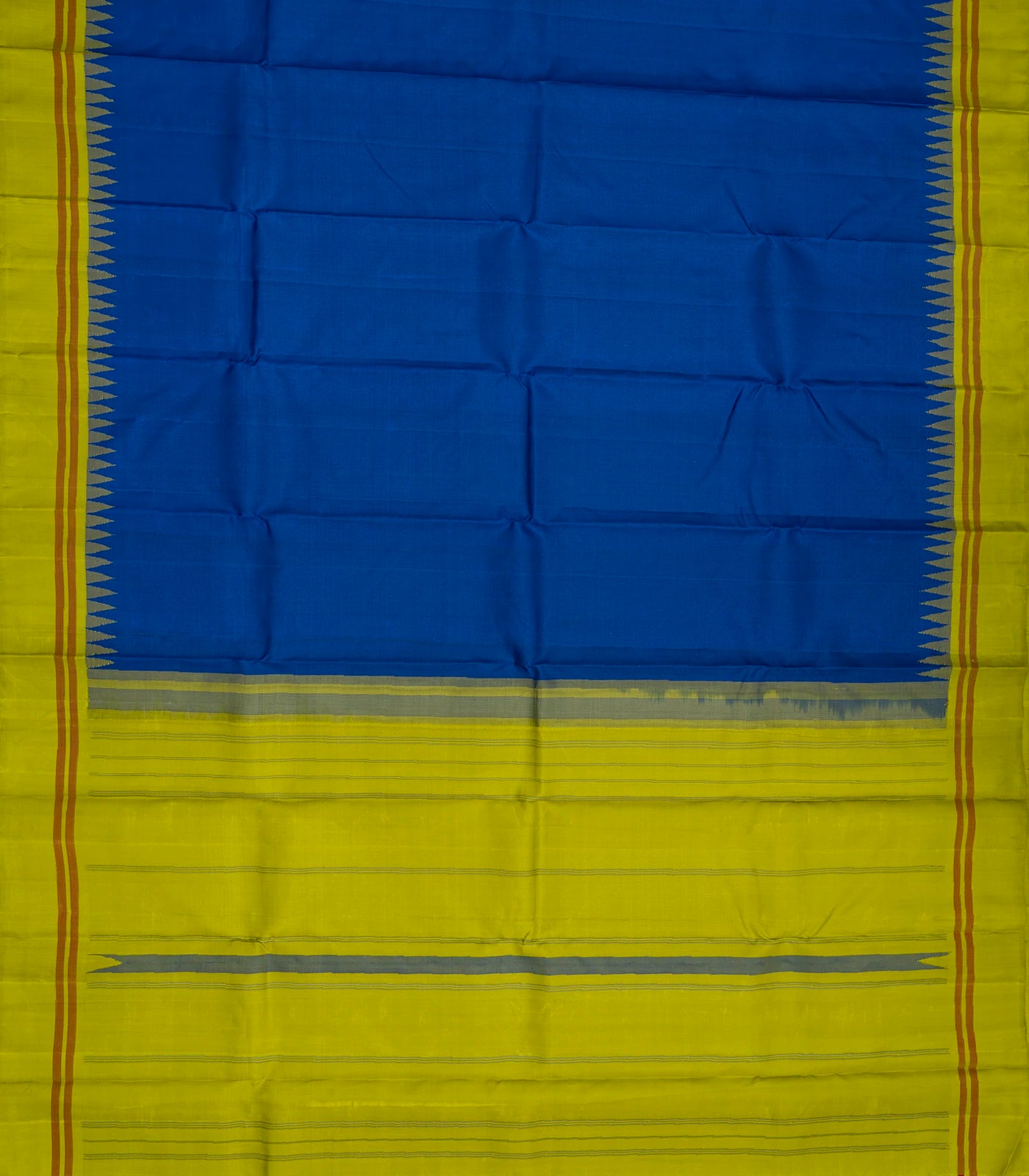This handwoven korvai kanchipuram silk saree with plain blue body along with contrast green temple border and pallu