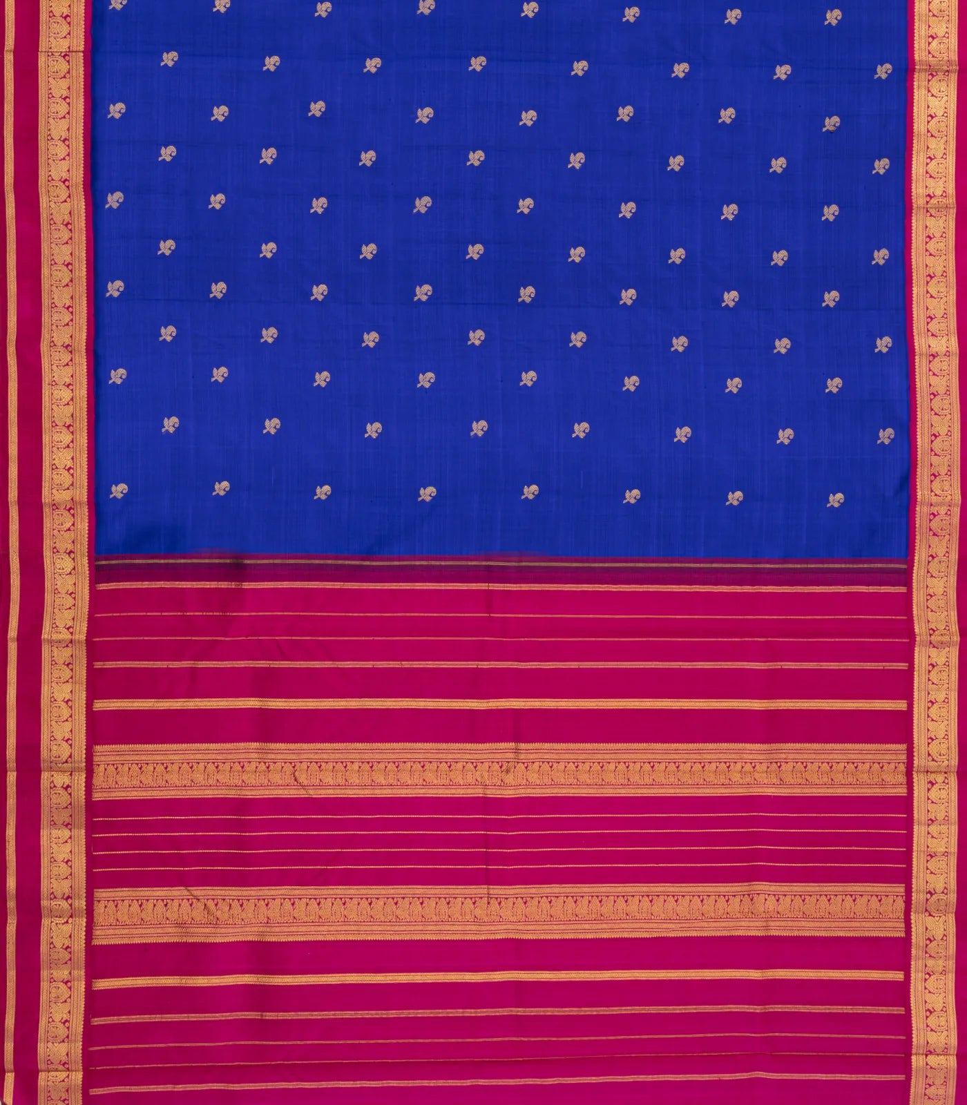 This handwoven korvai kanchipuram silk saree is filled with mango buttas in blue body along with contrast zari border and pallu