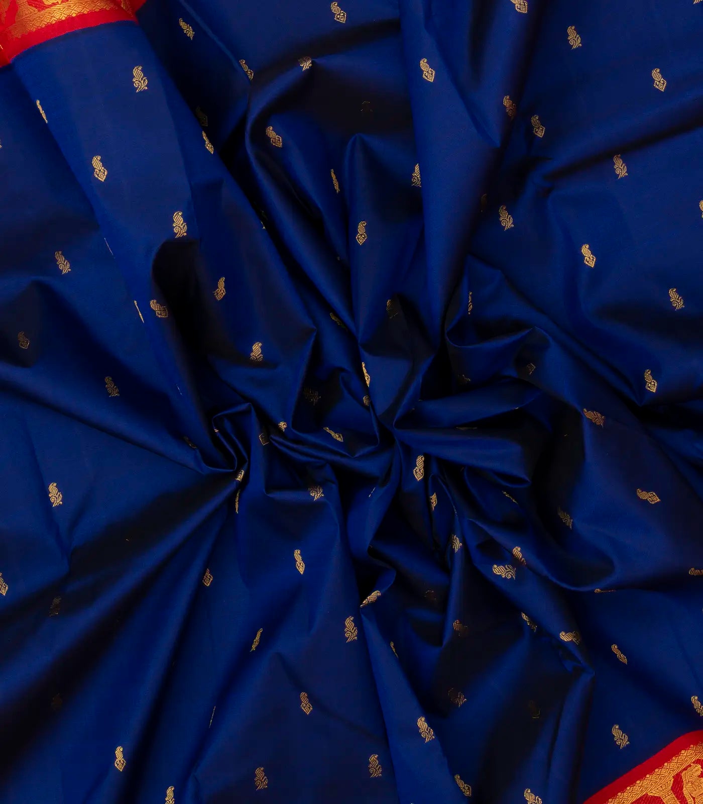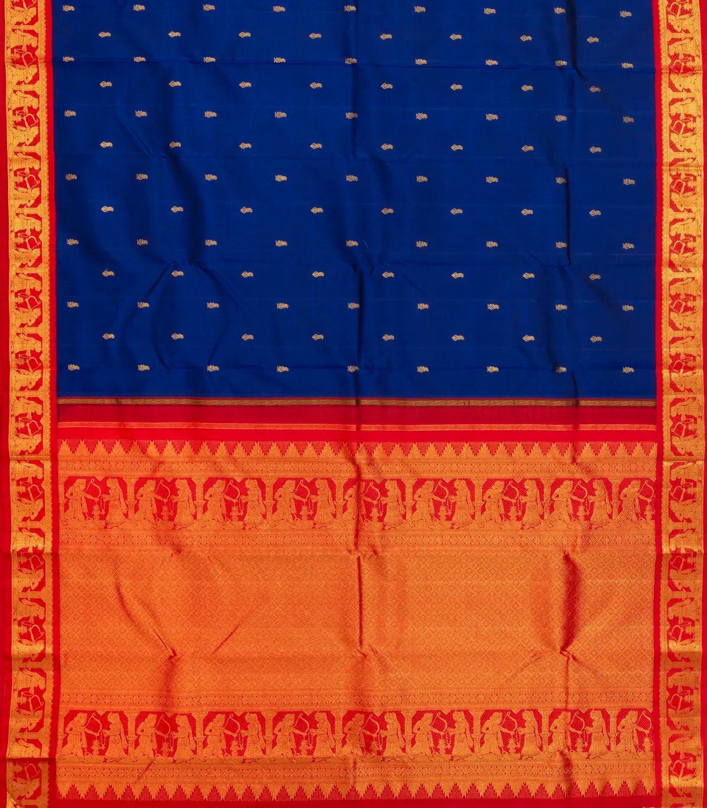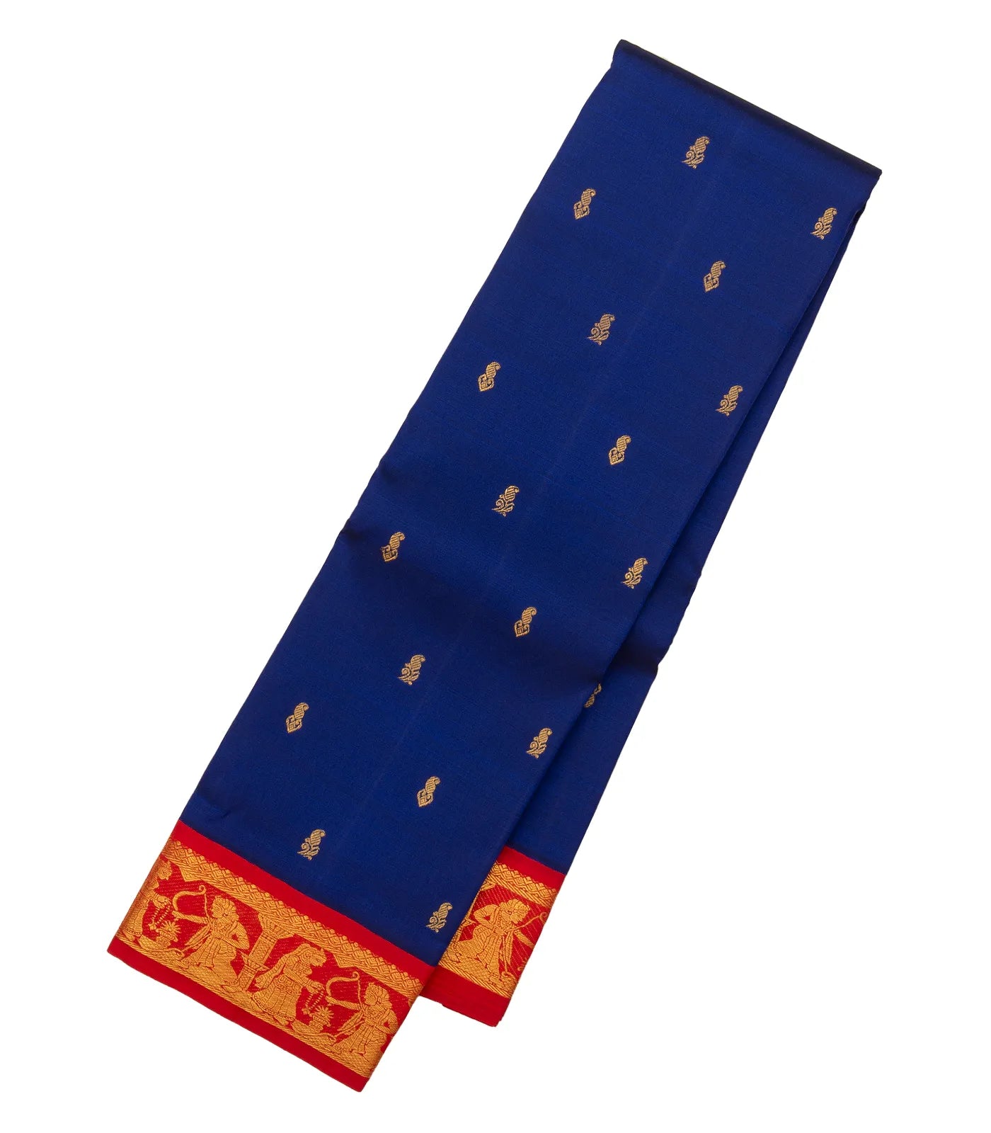 This handwoven korvai kanchipuram silk saree is filled with mango buttas in blue body along with lord ram motifs in contrast red border and pallu