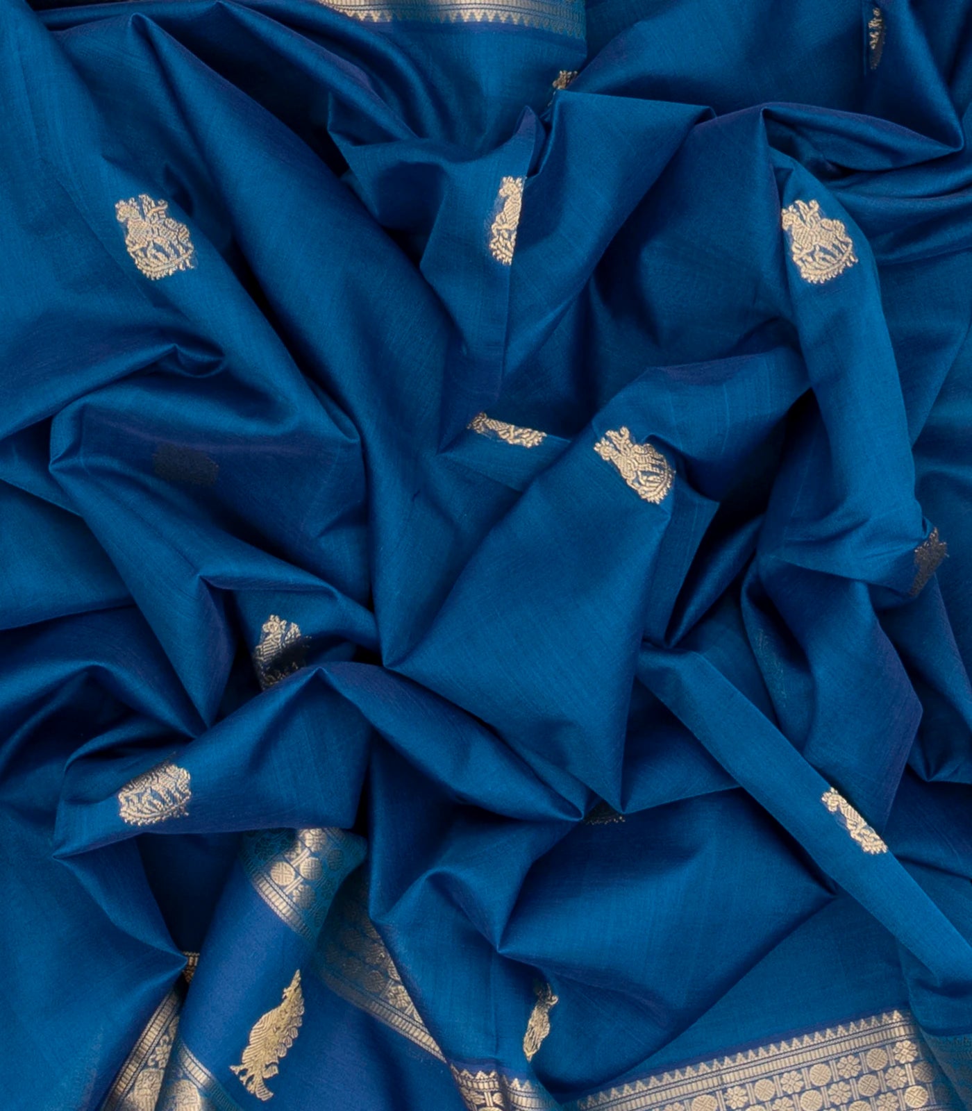 This handwoven silk cotton saree is filled with horse buttas in blue body along with border and pallu