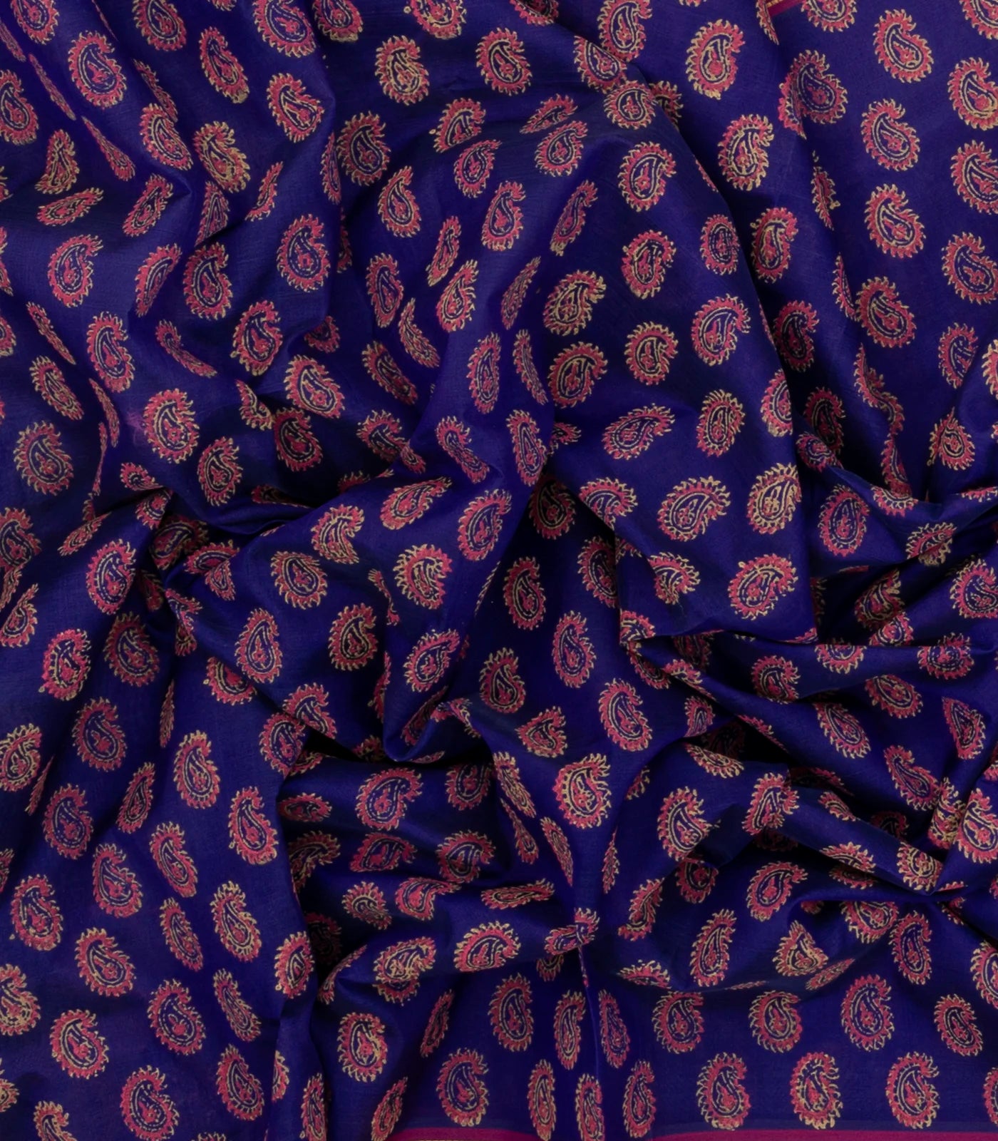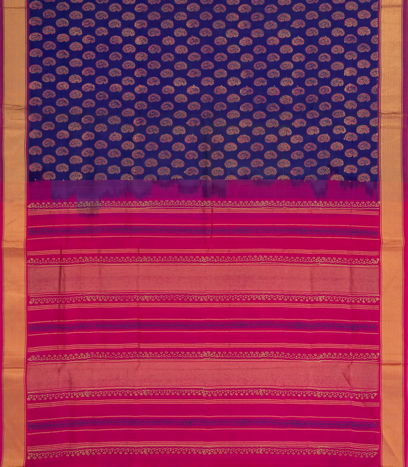 This handwoven silk cotton saree is filled with printed floral motifs in blue body along with contrast border and pallu