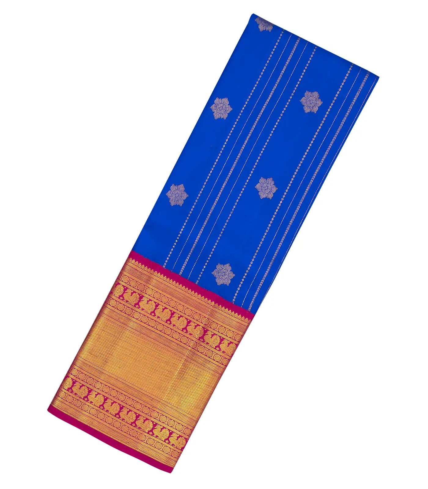 This handwoven pure silk kanchipuram korvai pattu pavadai material with zari stripes in blue body along with contrast border & blouse