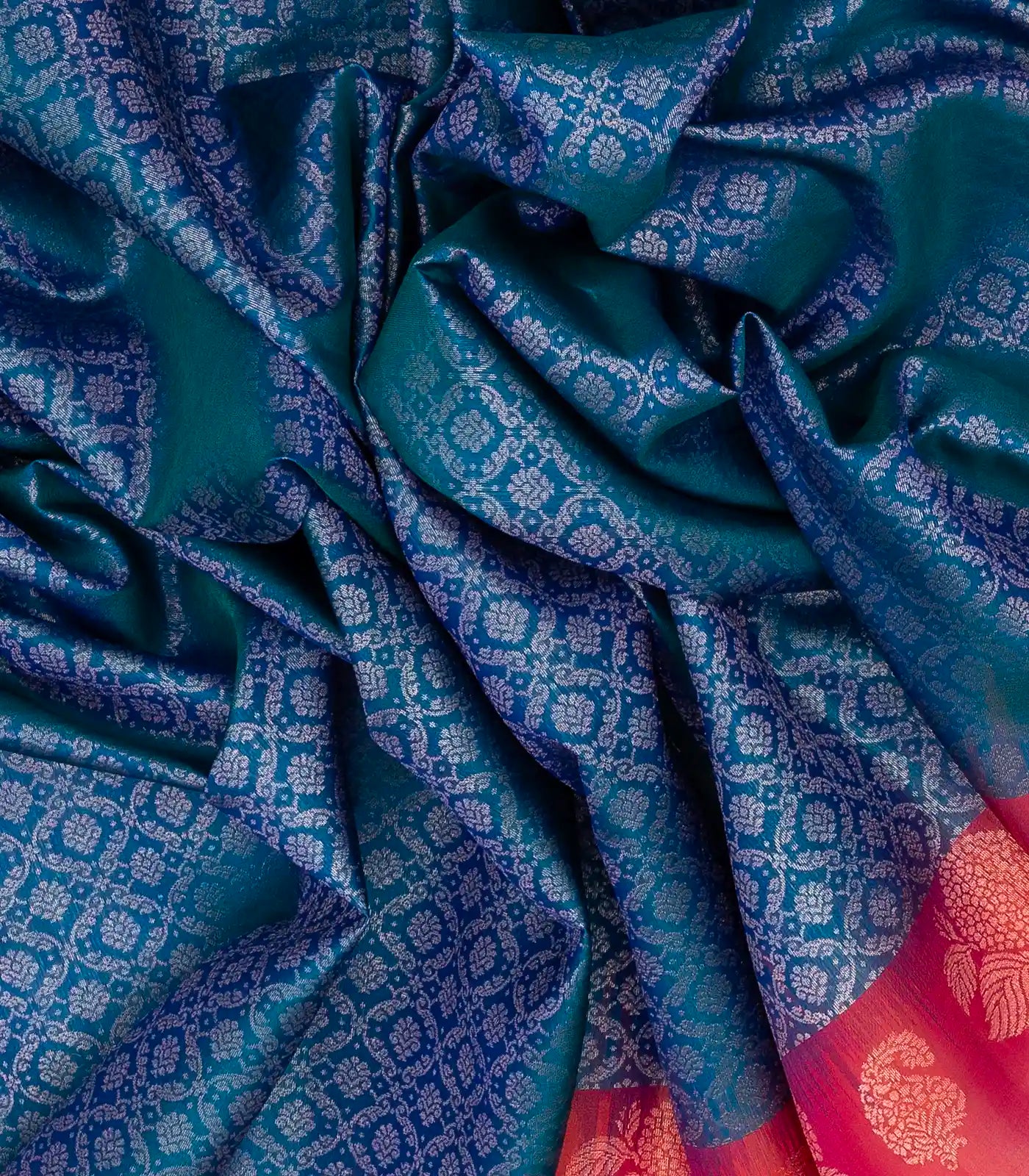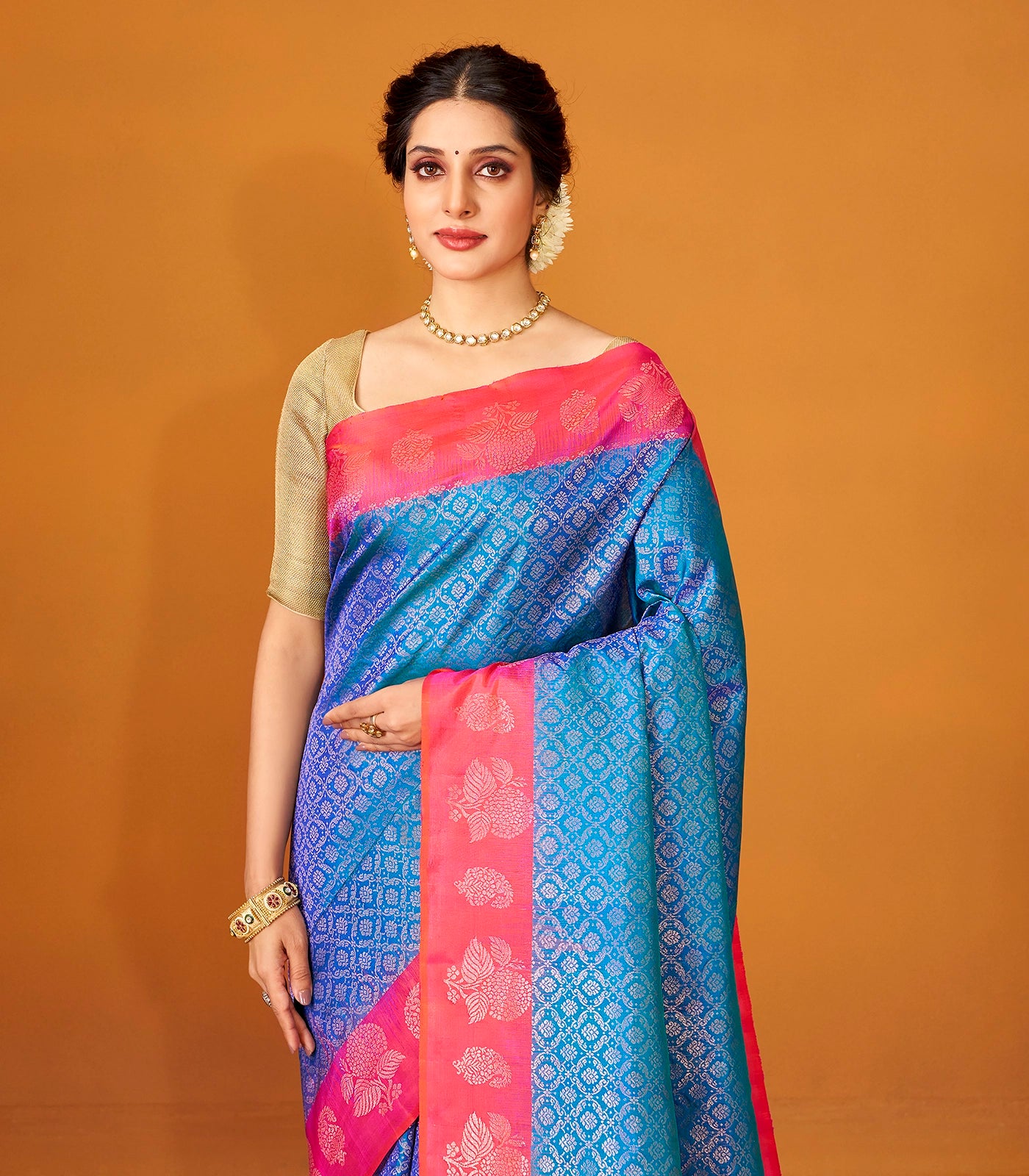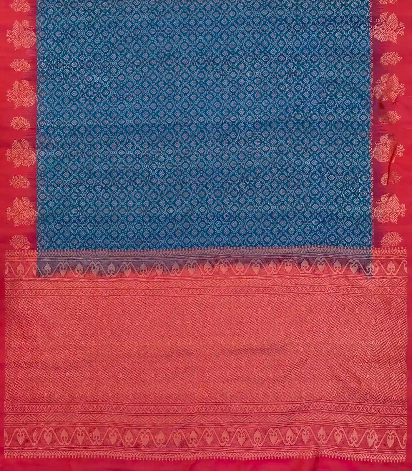 This handwoven soft silk saree is filled with floral jaal motifs in blue body along with contrast border and pallu
