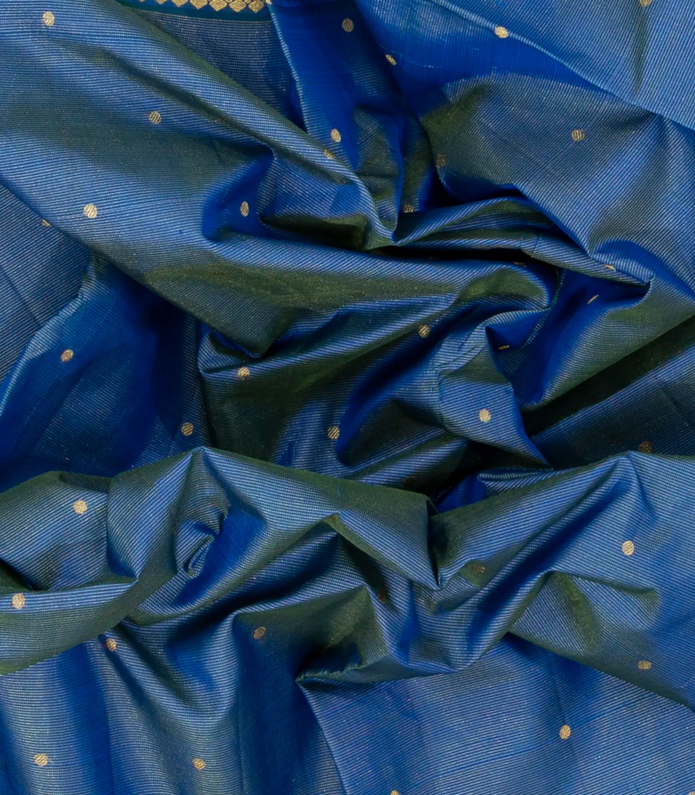 This handwoven vairaoosi kanchipuram silk saree with stripes & buttas in blue body along with zari border and pallu