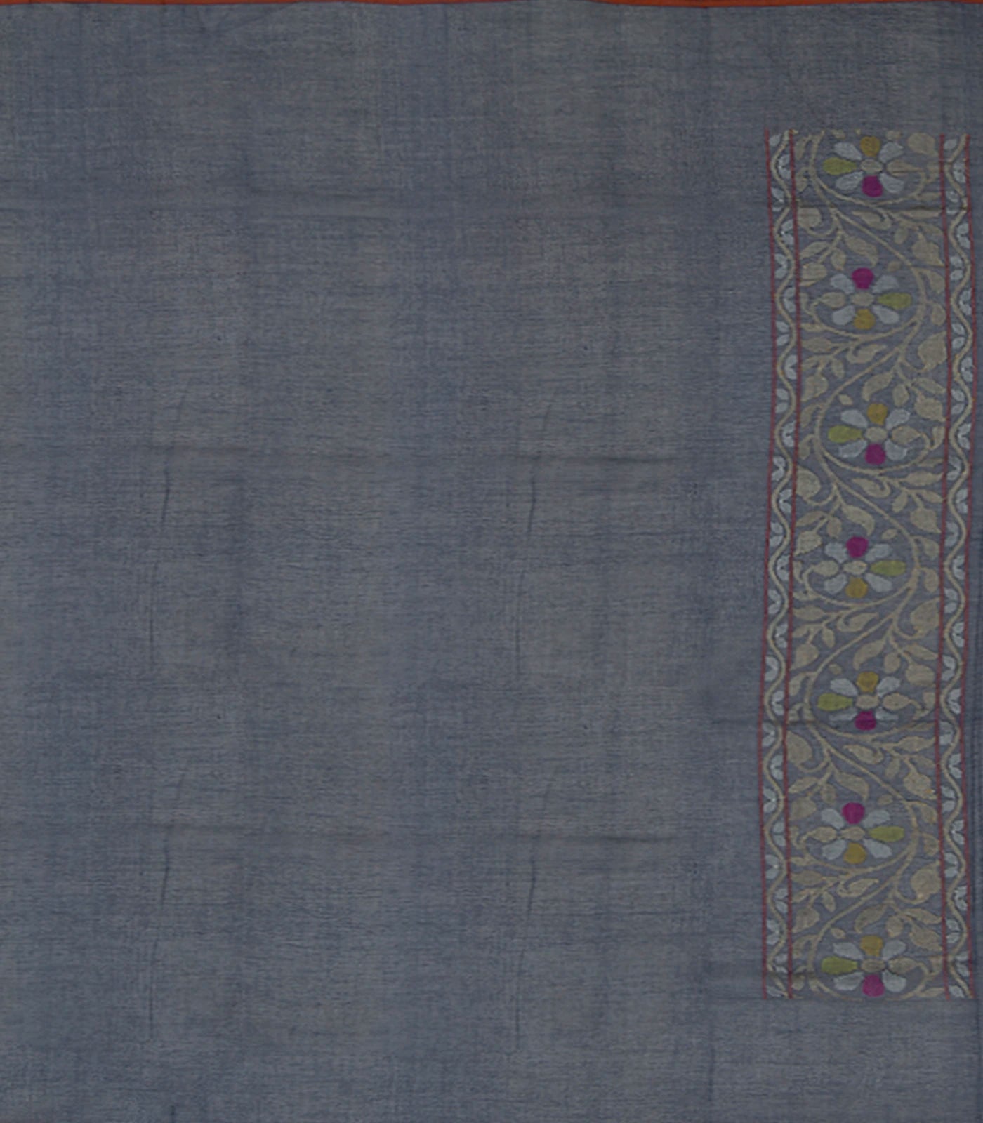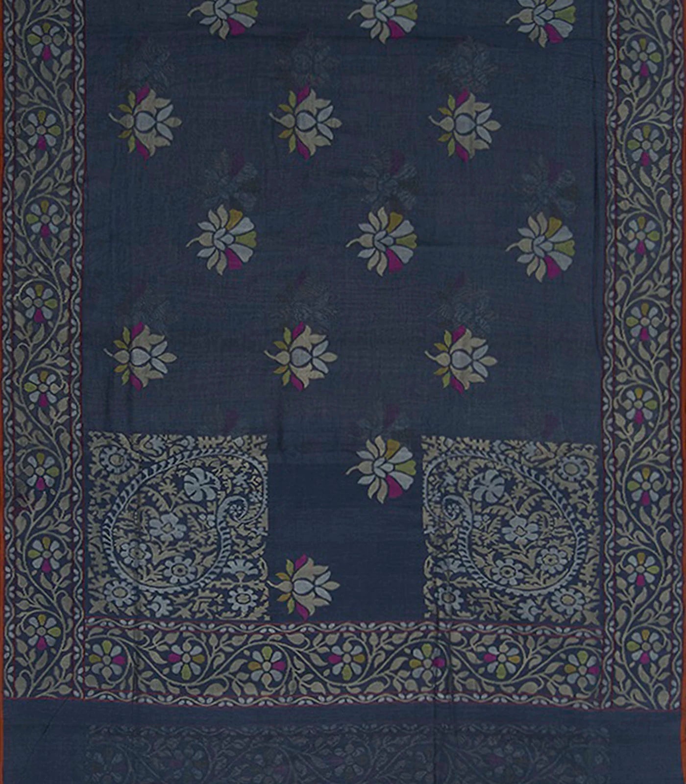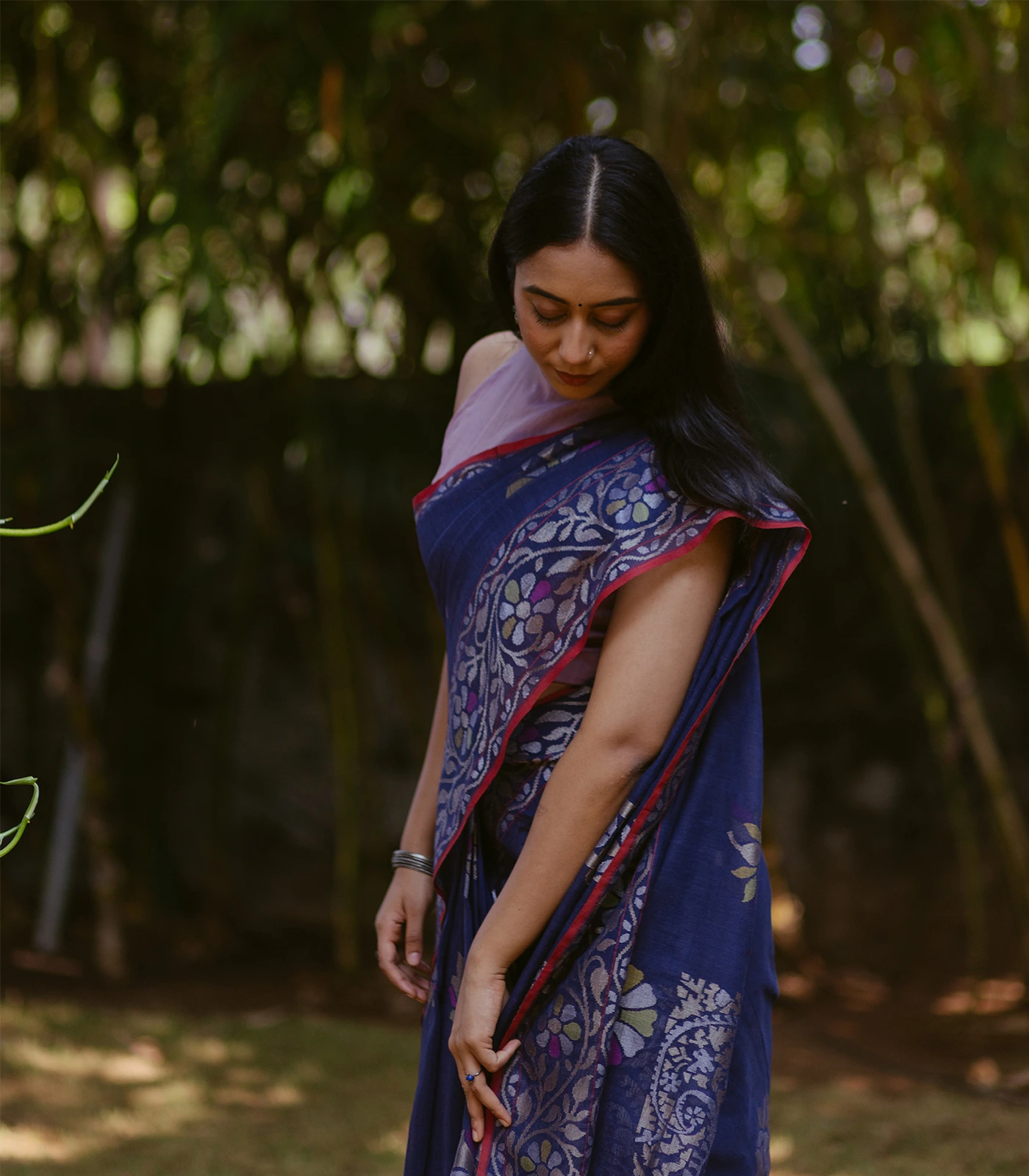 Blue Handwoven Benarasi "Neelambari" Jamdhani Saree With Floral Vine Motifs & Corner Pailsey Butta-Blue