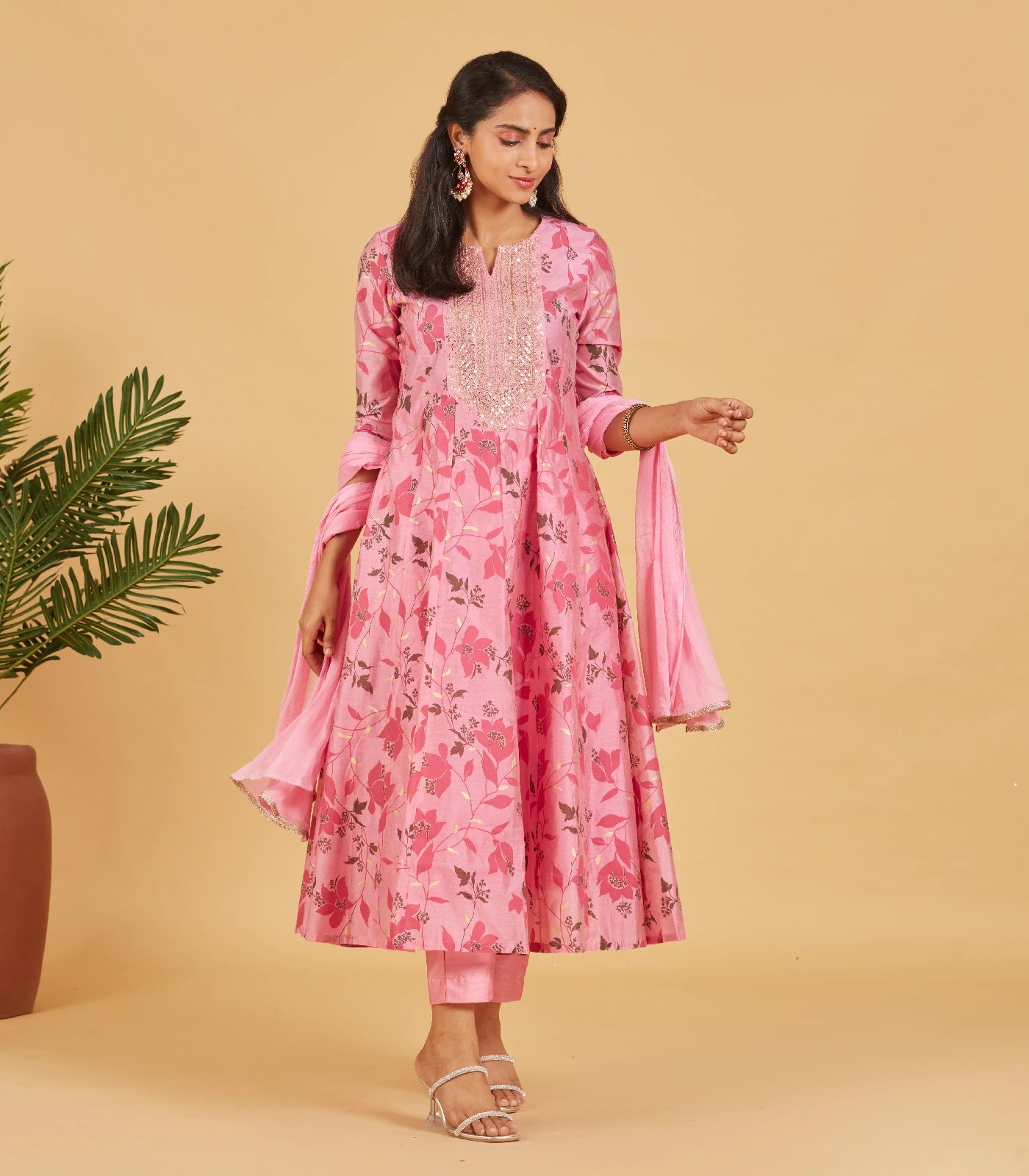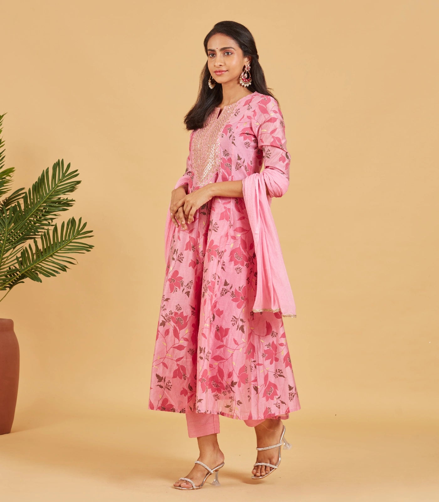 This exquisite Blush pink floral printed kurta set is an embodiment of elegance and grace. The kurta, crafted from the finest fabrics, features a captivating floral pattern across its surface. The intricate detailing in the centre front and vibrant hues create a mesmerizing visual appeal. Paired with matching palazzo pants and matching dupatta, this set is perfect for various occasions, from festive gatherings to casual outings.