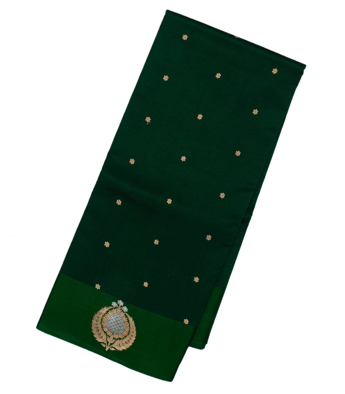 This handwoven banarasi silk saree is filled with floral buttas in bottle green body along with border and pallu