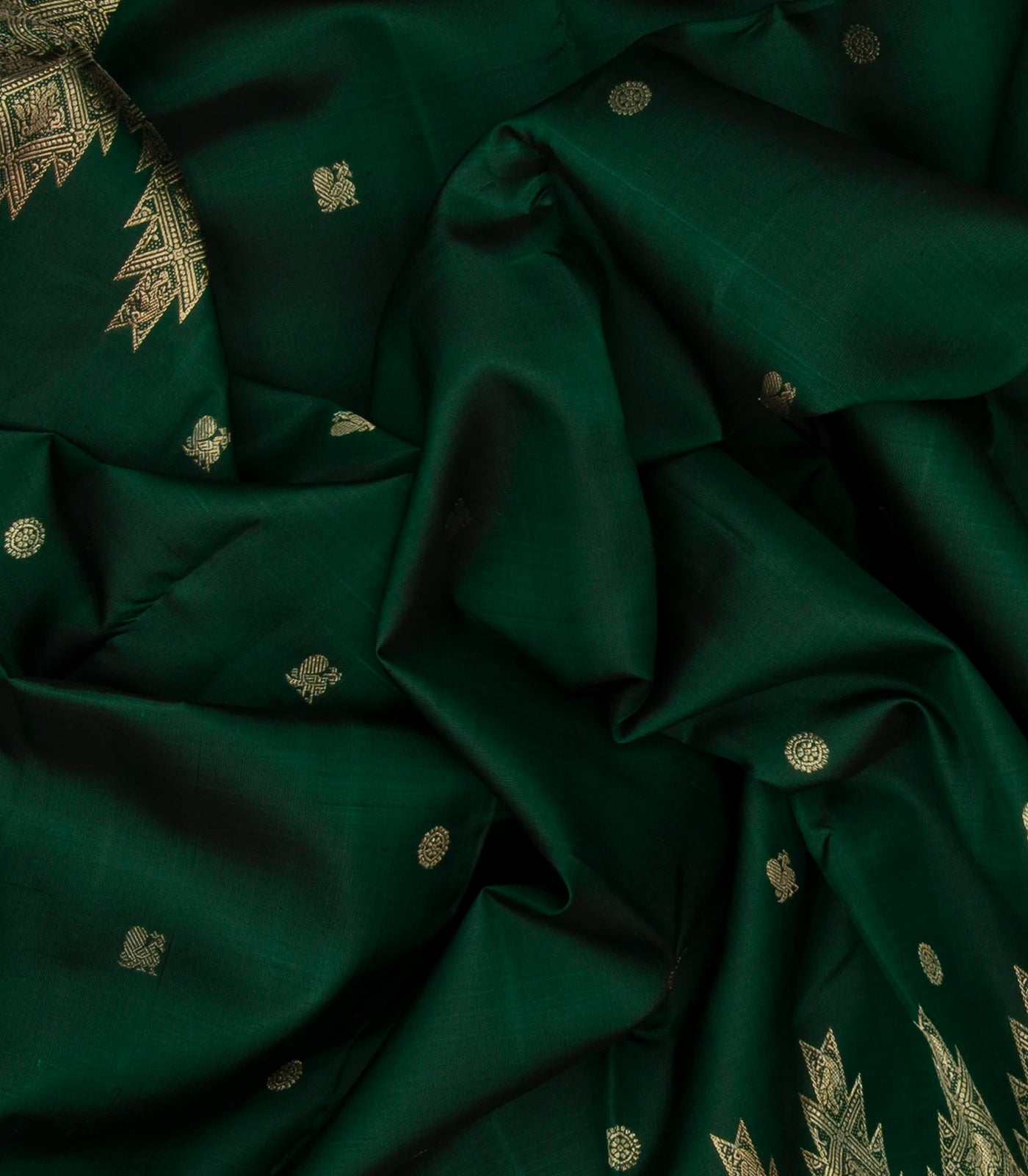 This handwoven kanchipuram silk saree is filled with annam chakaram buttas in bottle green body along with temple zari border and pallu
