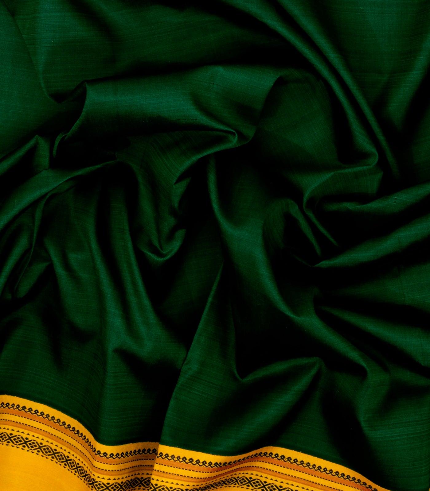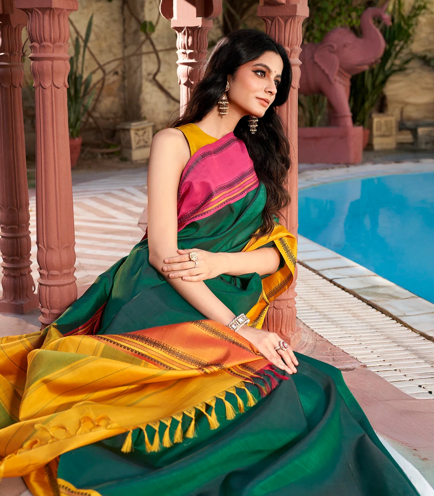 This handwoven korvai kanchipuram silk saree is filled with plain bottle green body along with contrast ganga jamuna border and pallu