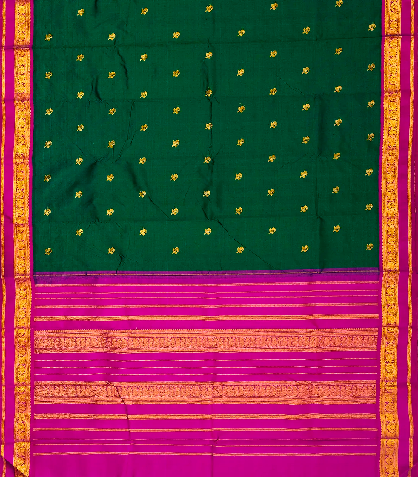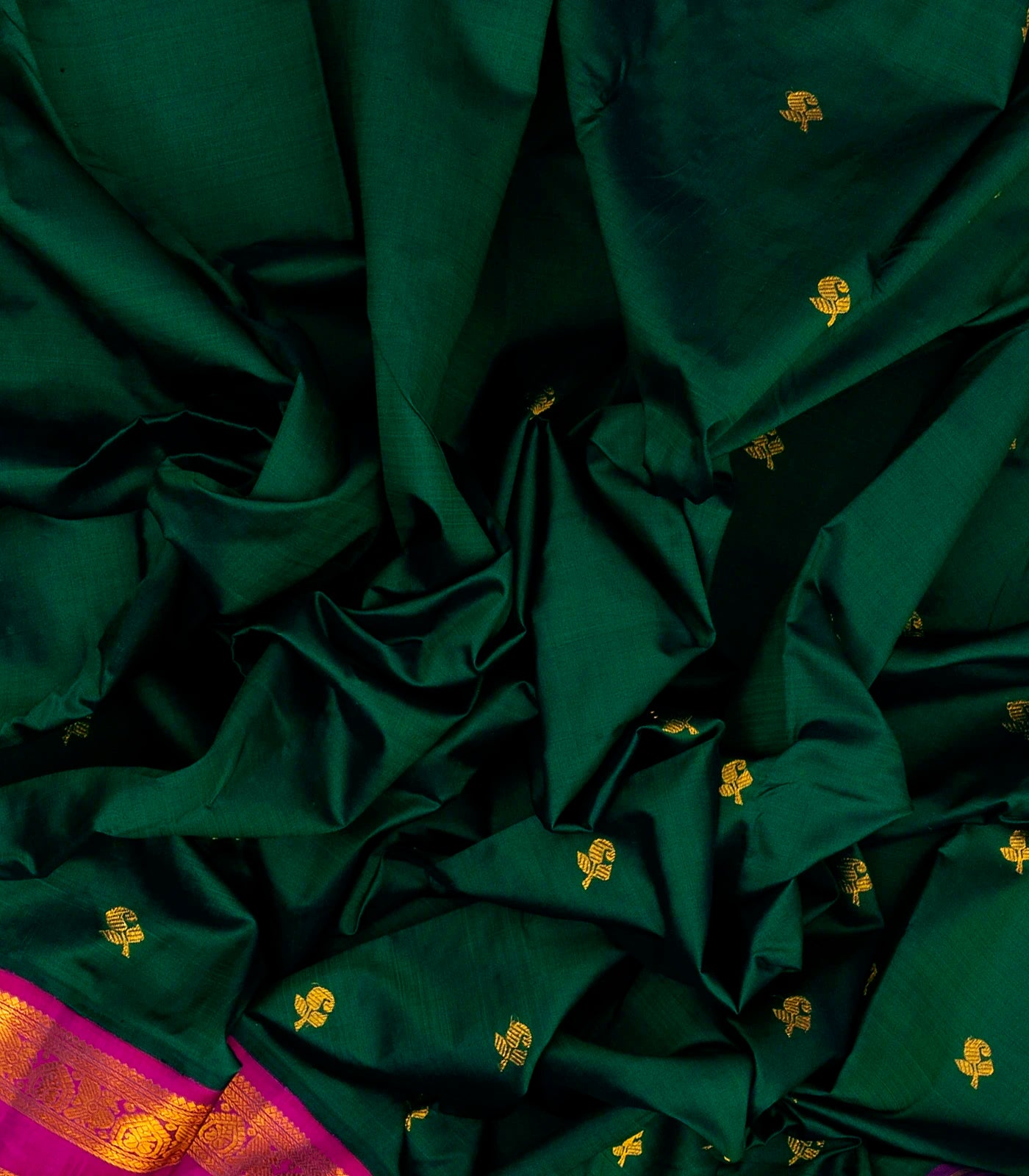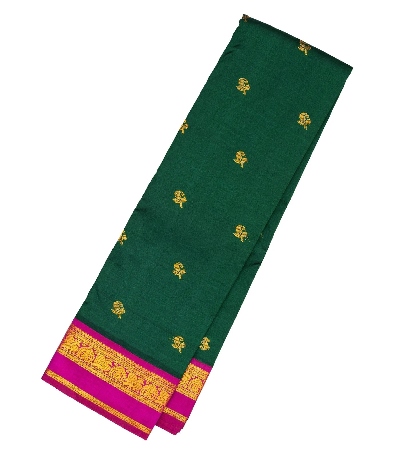 This handwoven korvai kanchipuram silk saree is filled with mango buttas in bottle green body along with contrast border and pallu