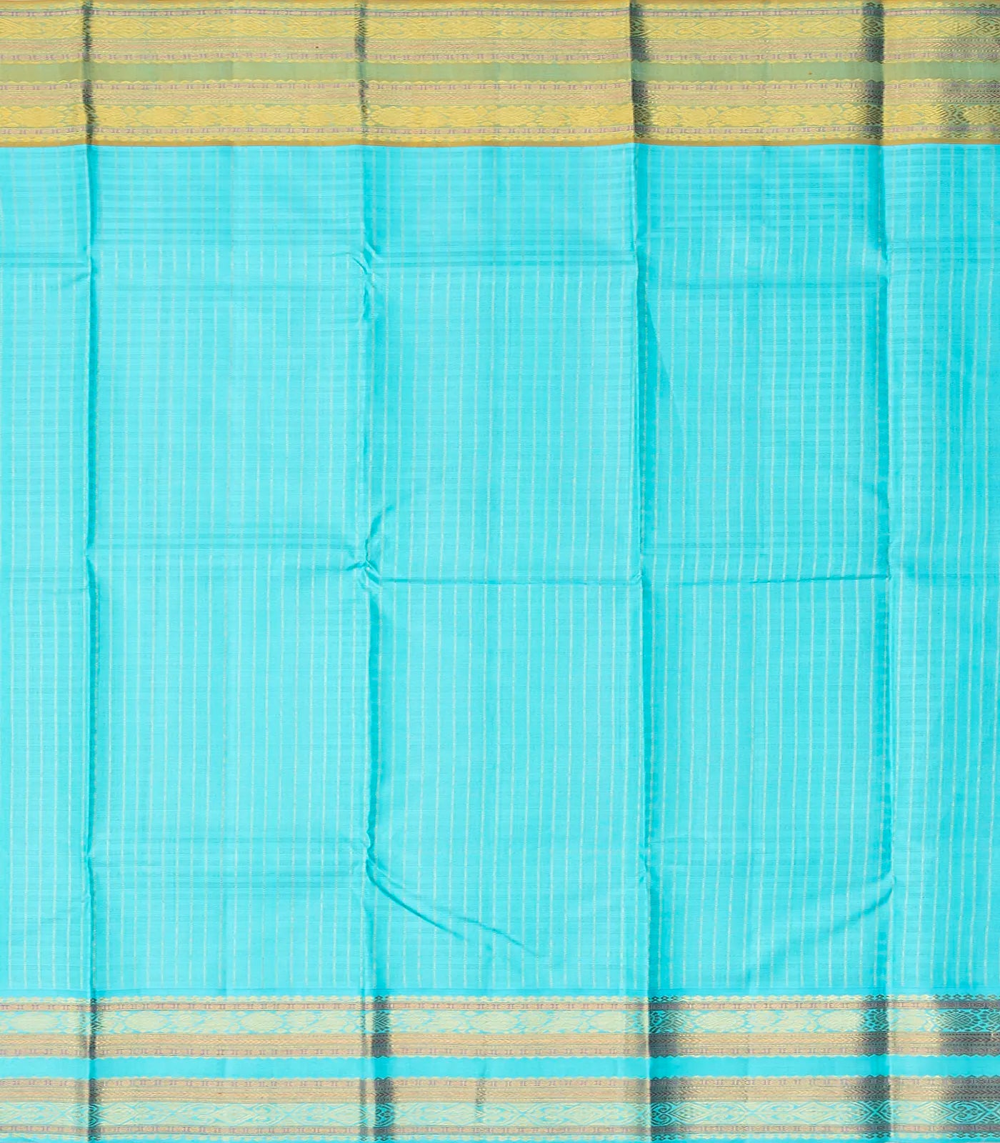 This handwoven korvai kanchipuram silk saree is filled with zari stripes in bottle green body along with contrast ganga jamuna border and pallu