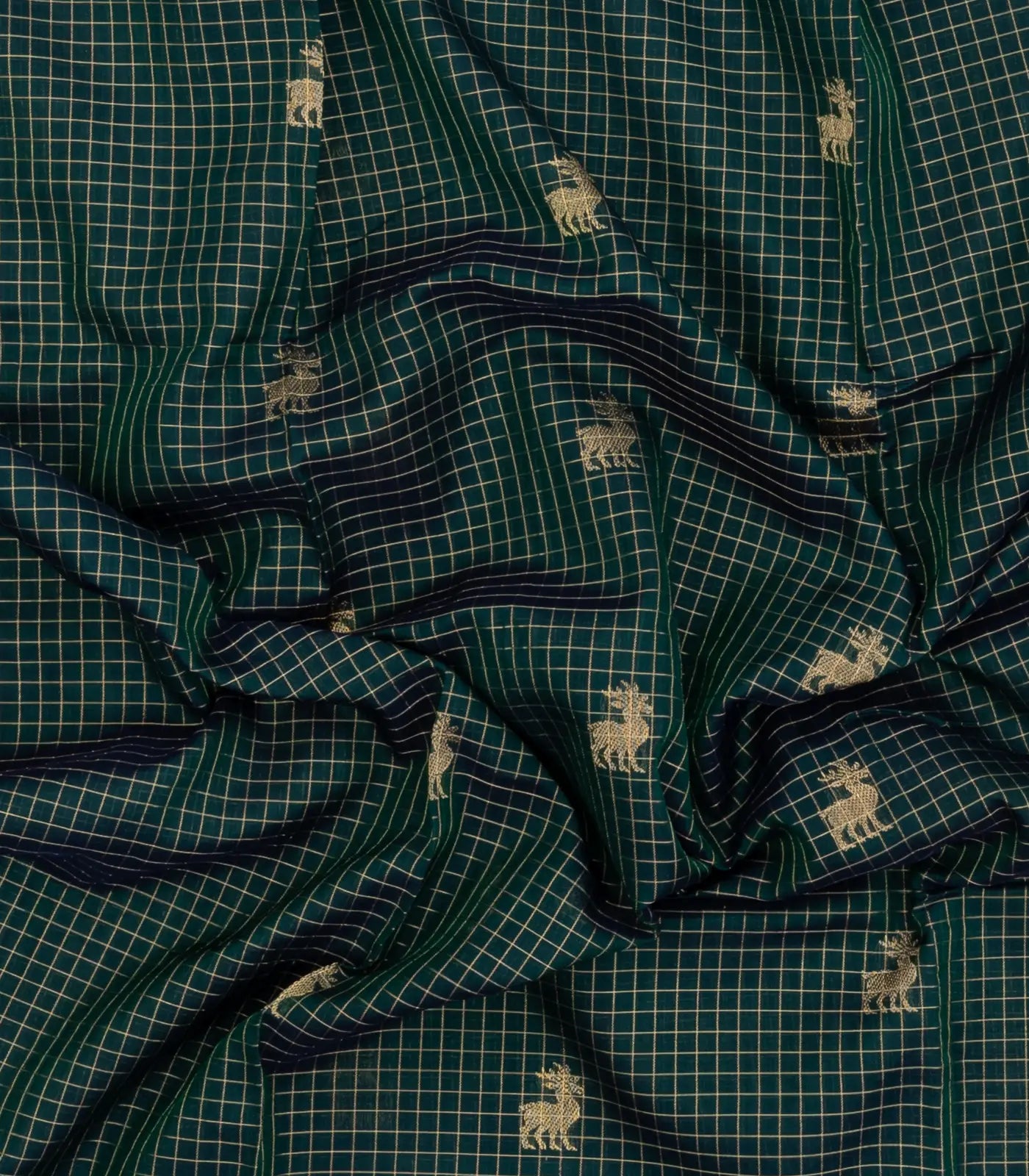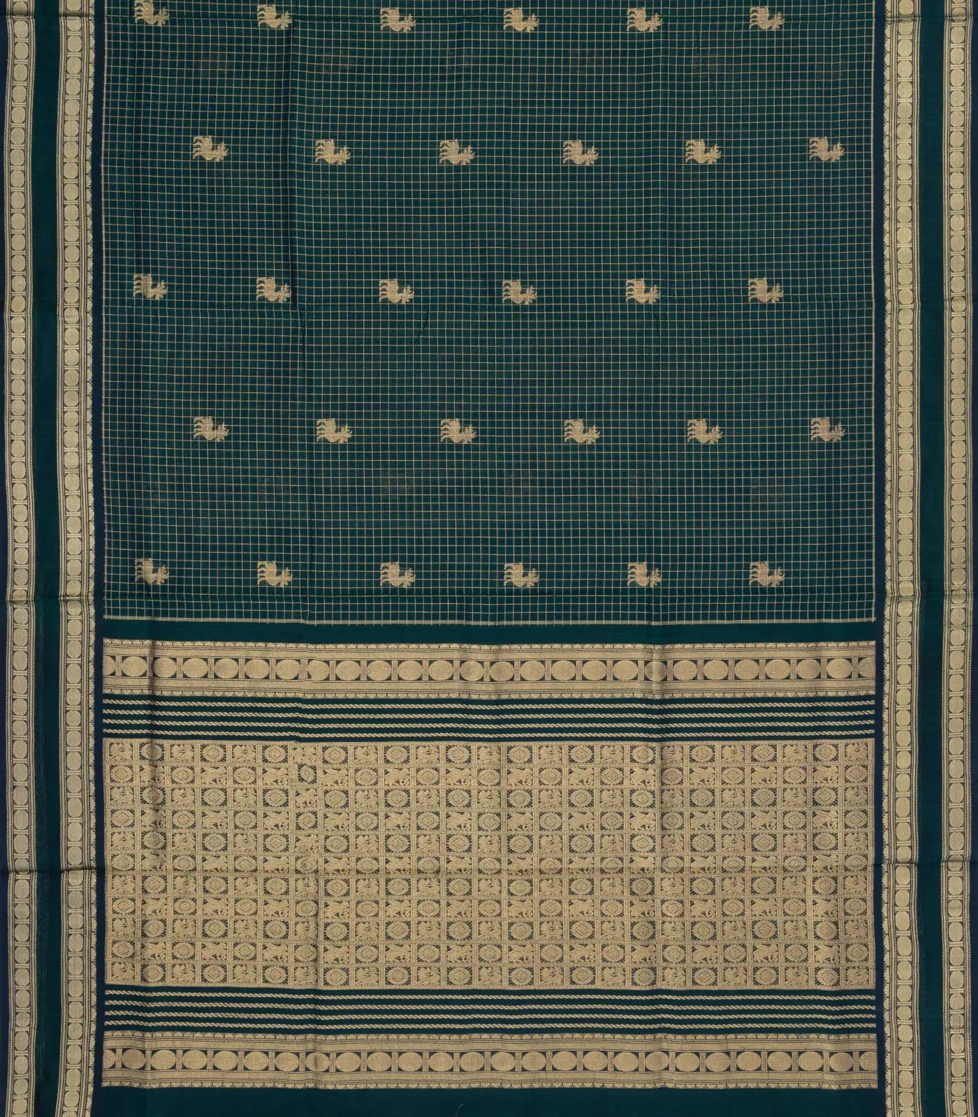 Bottle Green Handloom Silk Cotton Saree With Checks & Buttas-SC4233