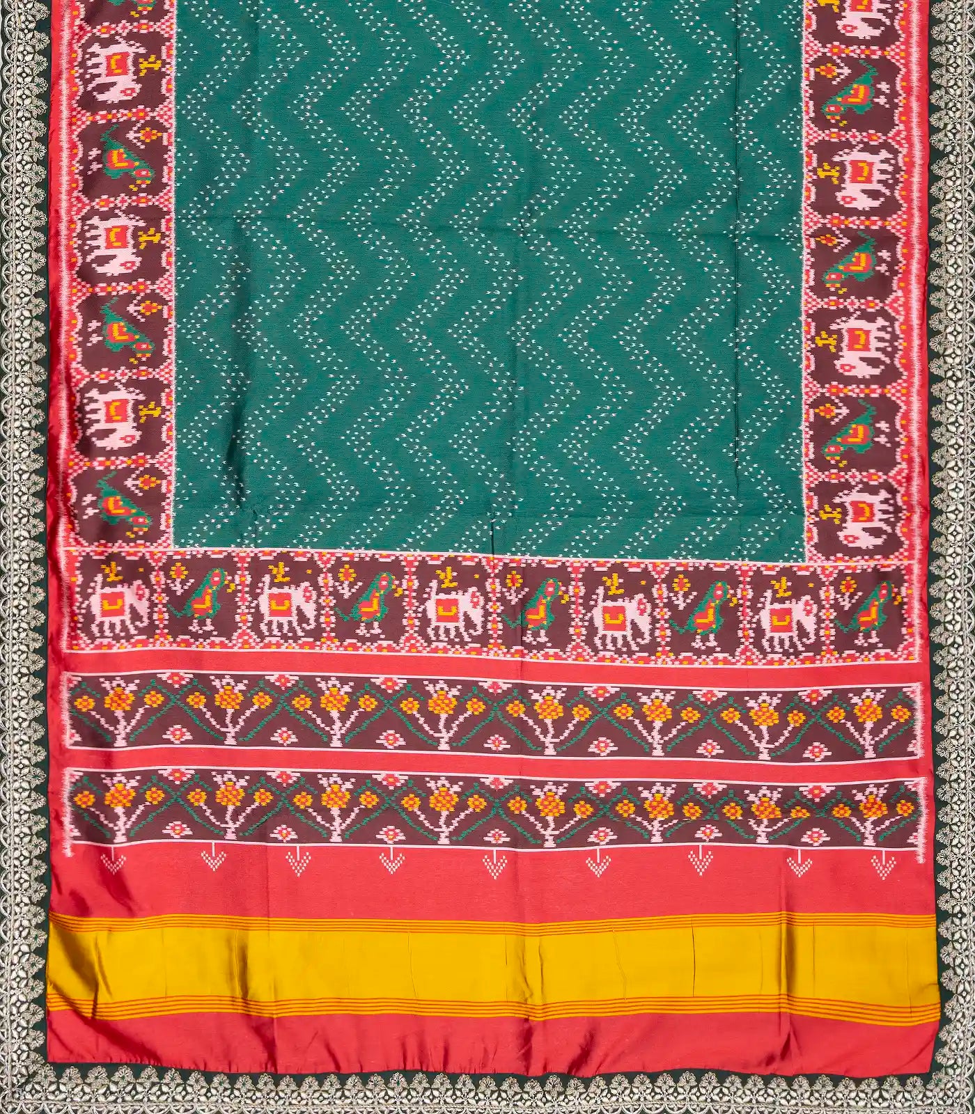 Bottle Green Woven Blended Silk Saree With Ikat Motifs & Hand Embroidered Selvage-EN1703