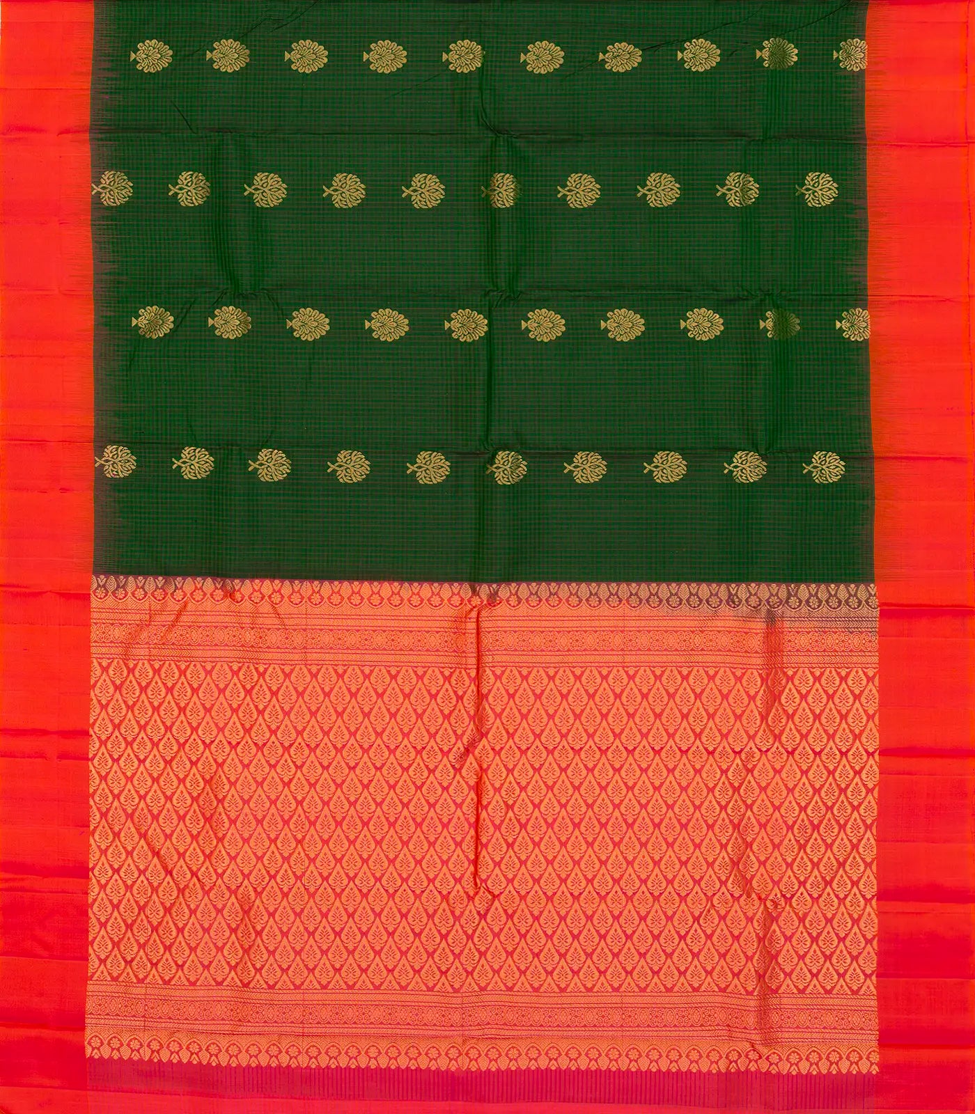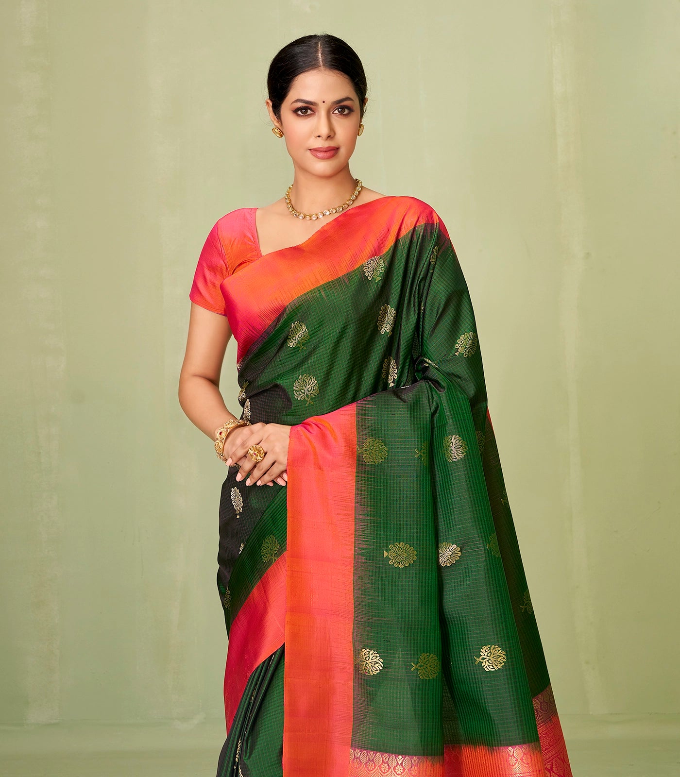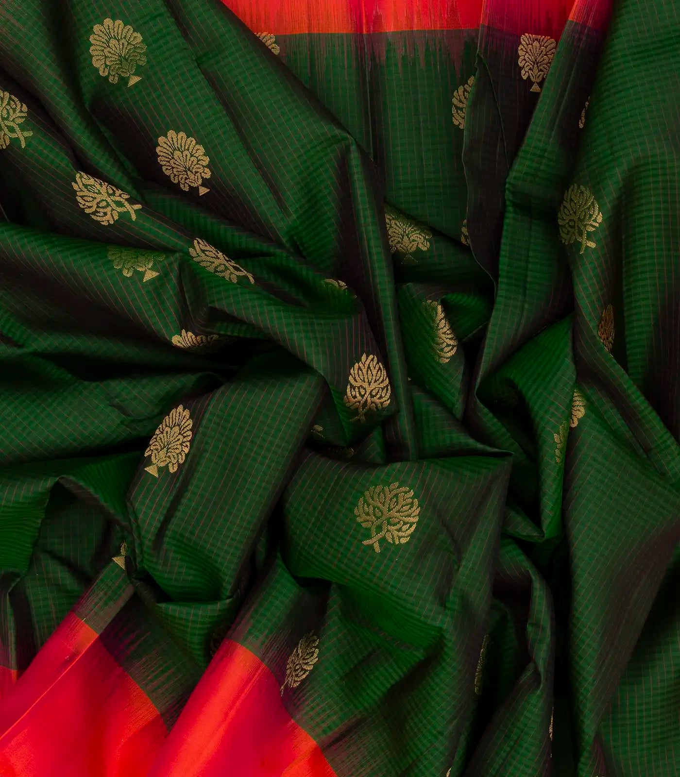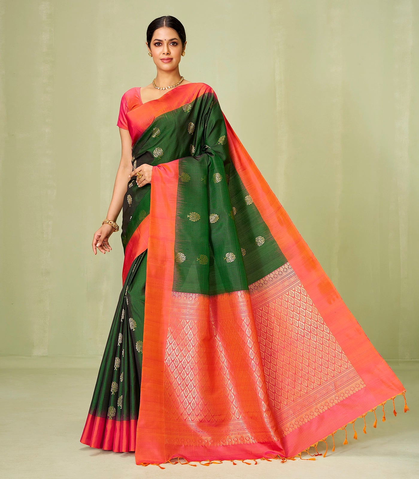 This handwoven soft silk saree is filled with zari buttas in bottle green body along with contrast border and pallu