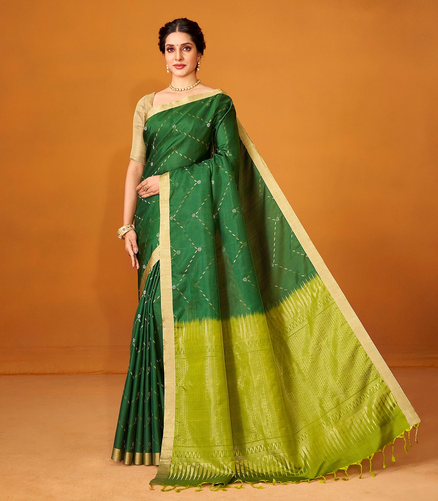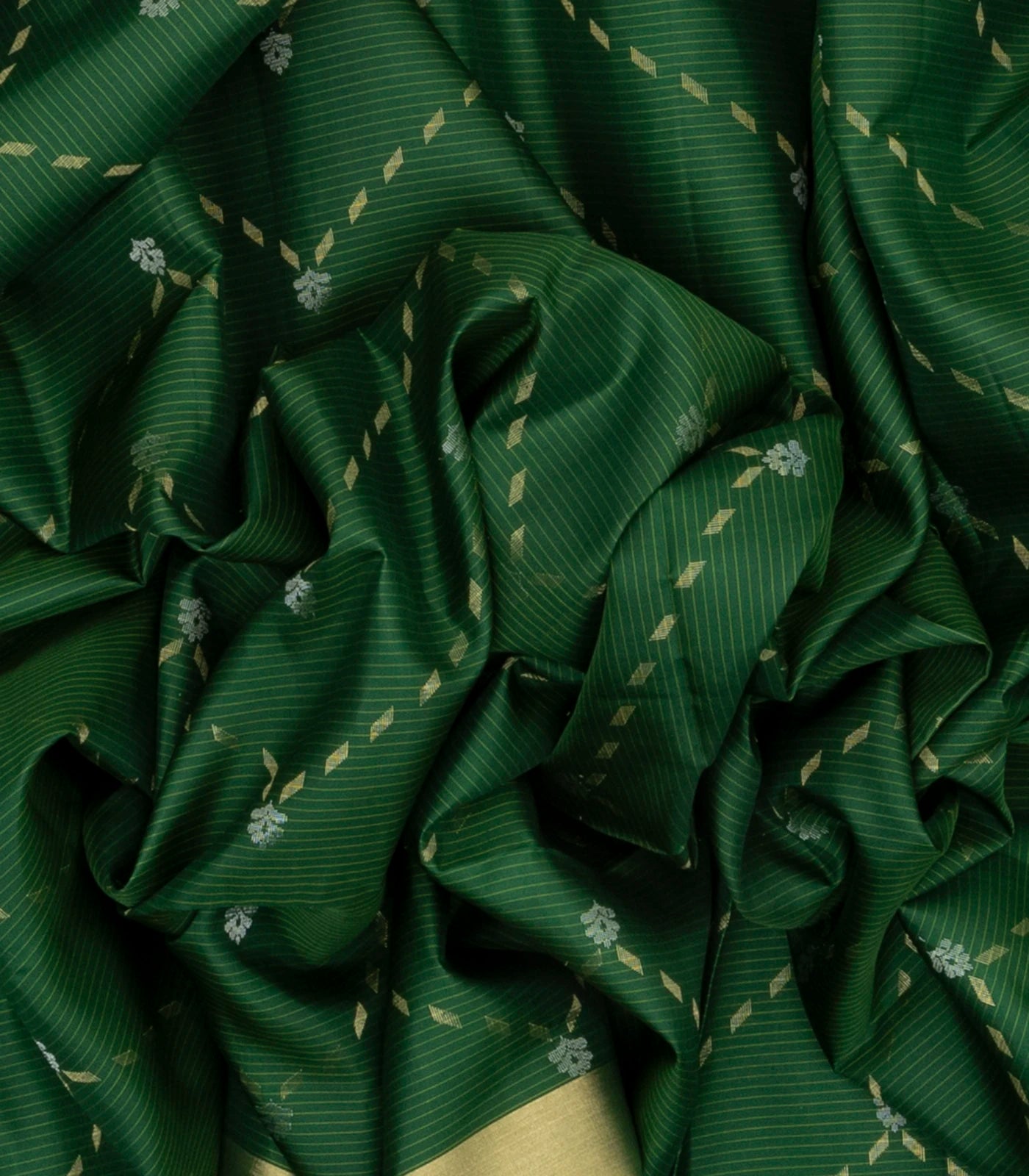 This handwoven soft silk saree is filled with stripes & floral motifs in bottle green body along with zari border and pallu