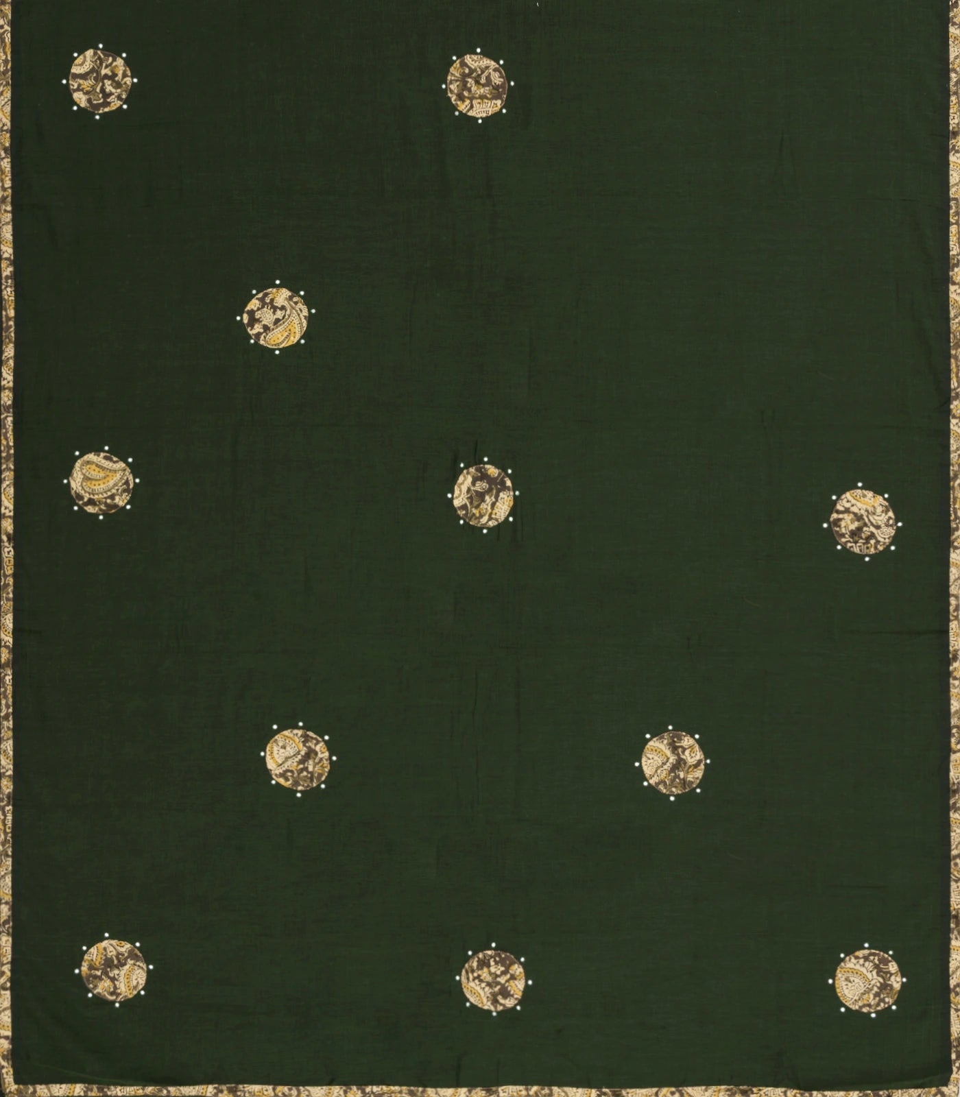 This woven chirala cotton saree is filled with printed floral motifs in bottle green body along with border and pallu