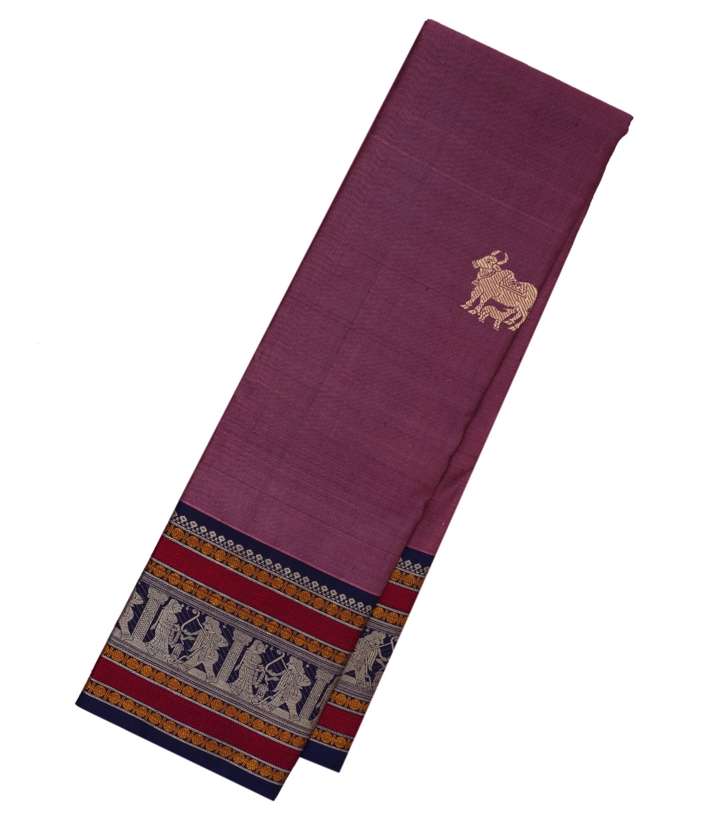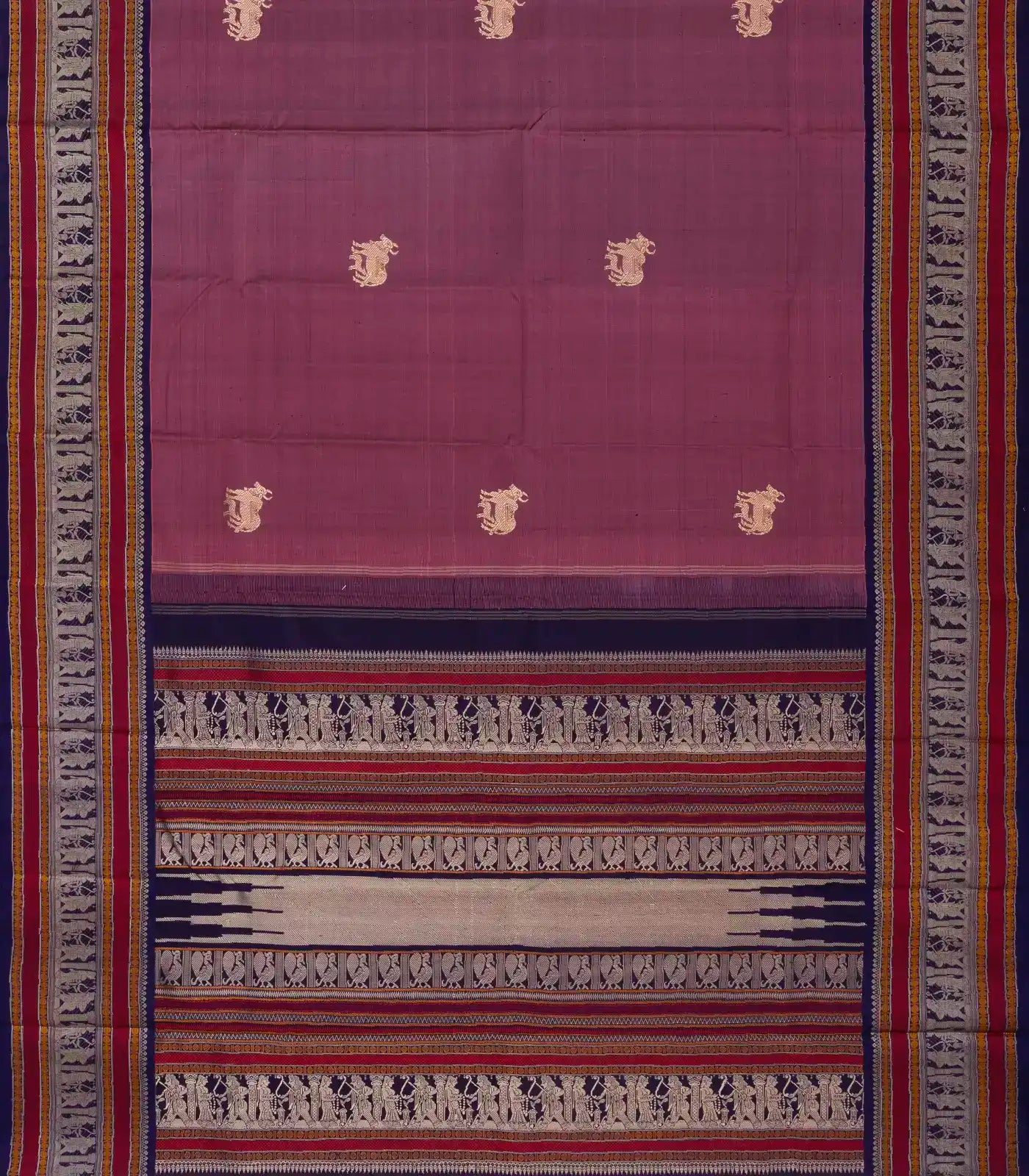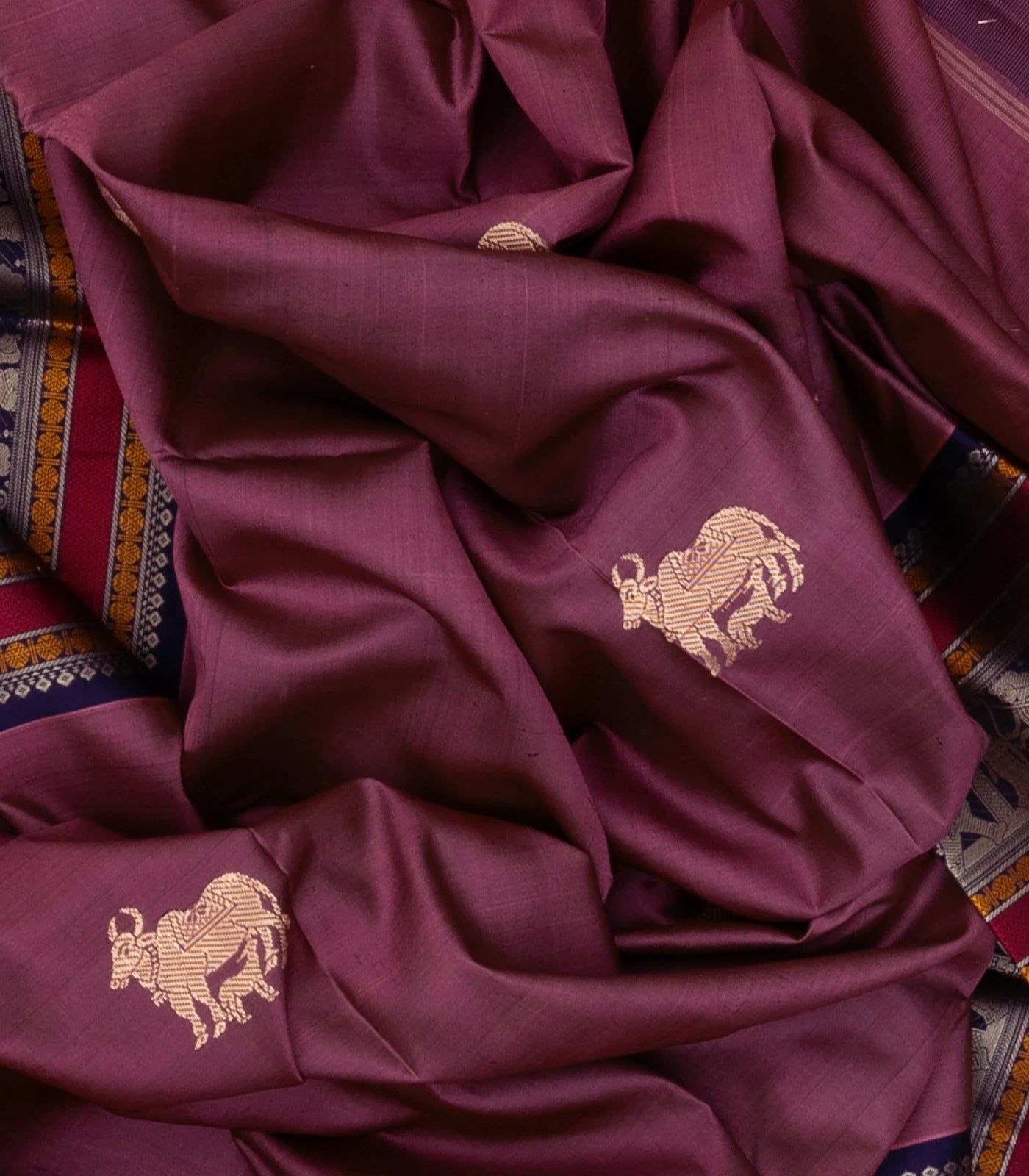 This handwoven kanchipuram silk saree is filled with ox buttas in brown body along with lord ram motifs in contrast border and pallu