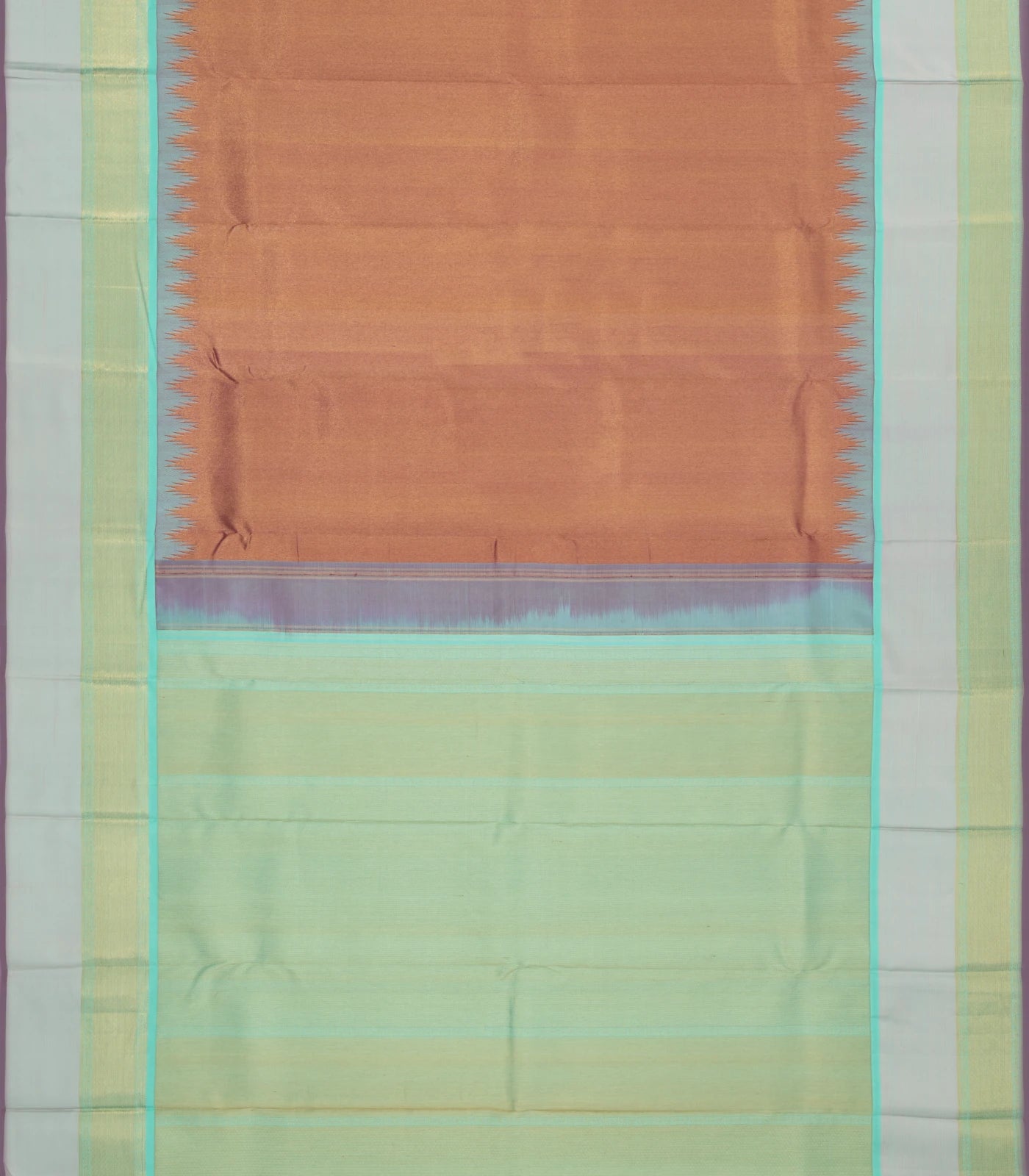 This handwoven korvai kanchipuram tissue silk saree is filled with plain brown body along with contrast temple border and pallu