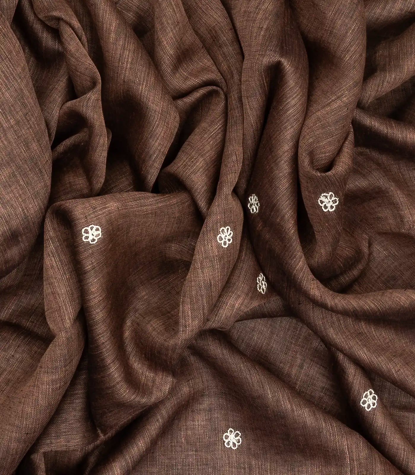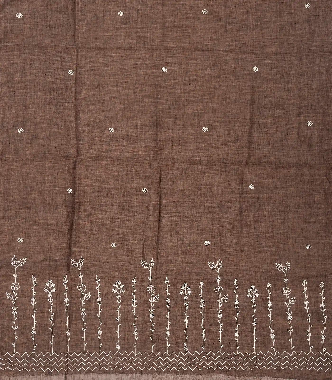 Brown Handloom Linen Saree With Embroidered Floral Motifs
