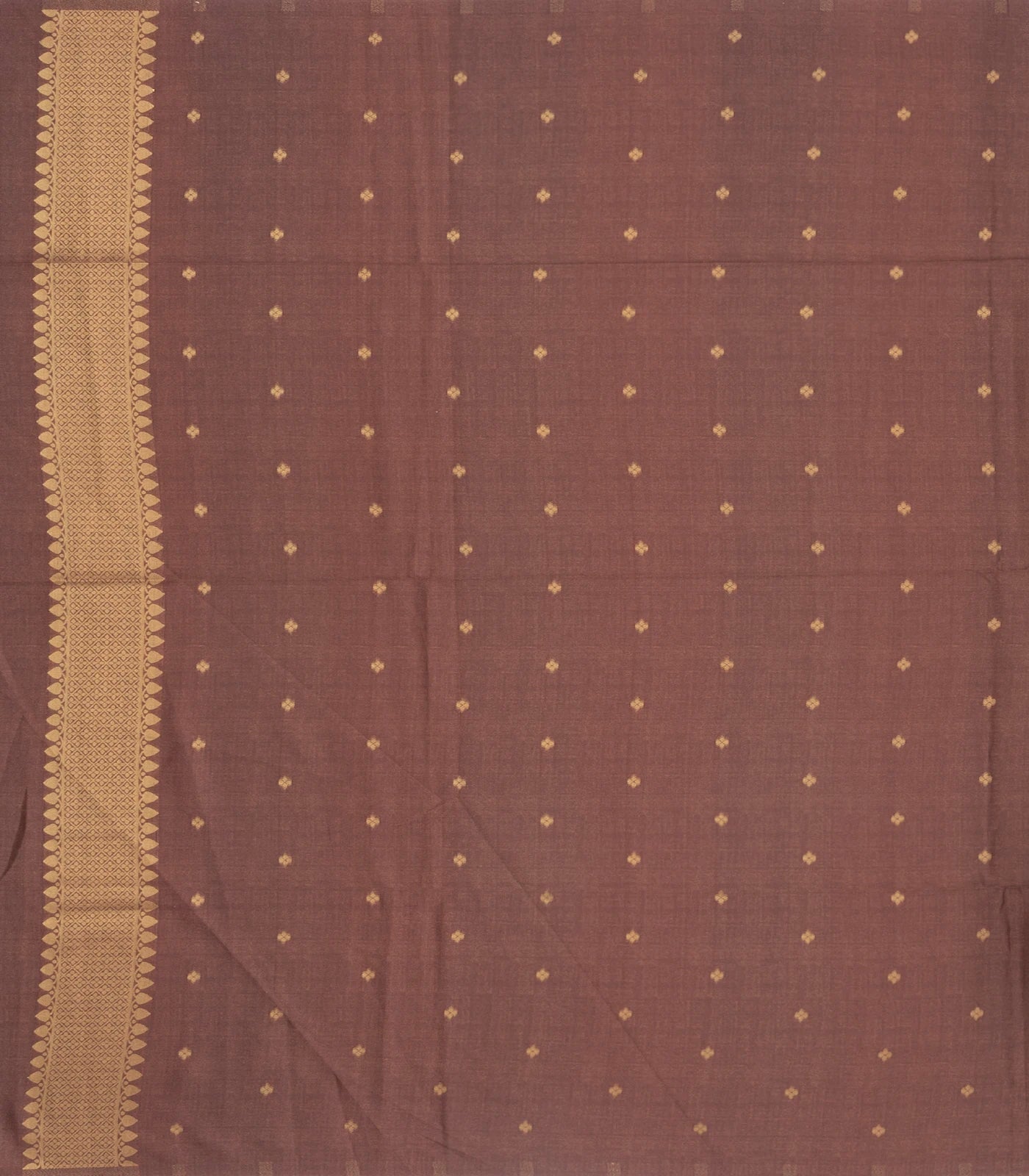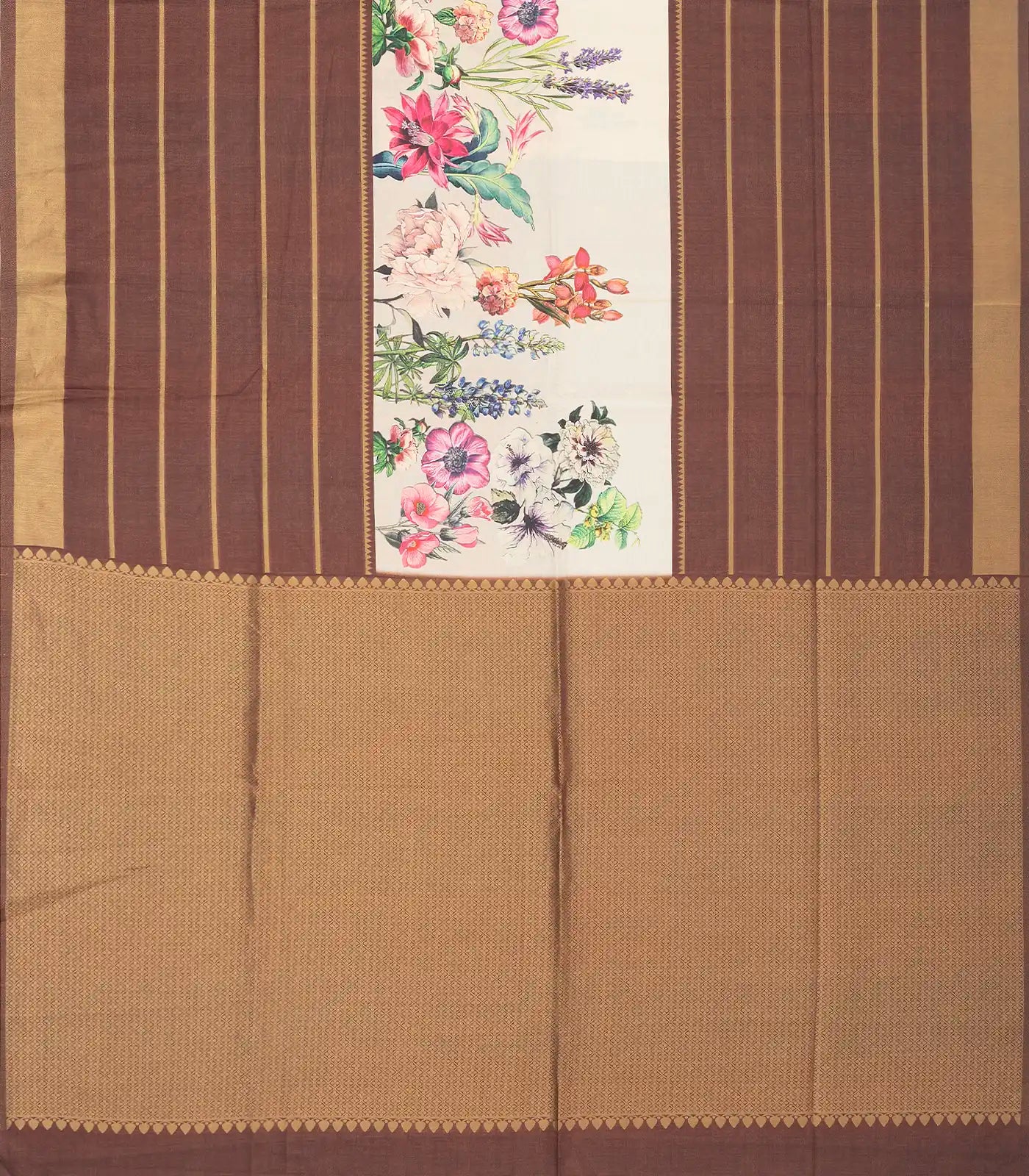 This woven blended tussar saree is printed with floral motifs in brown body along with border and pallu