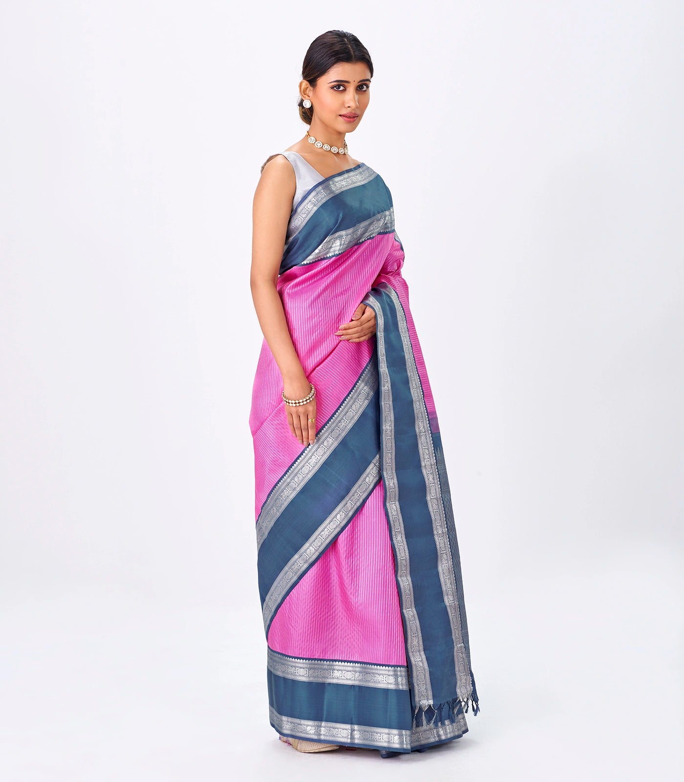This handwoven kanchipuram korvai silk saree is filled with zari stripes in bubble-gum pink body along with contrast grey border and pallu