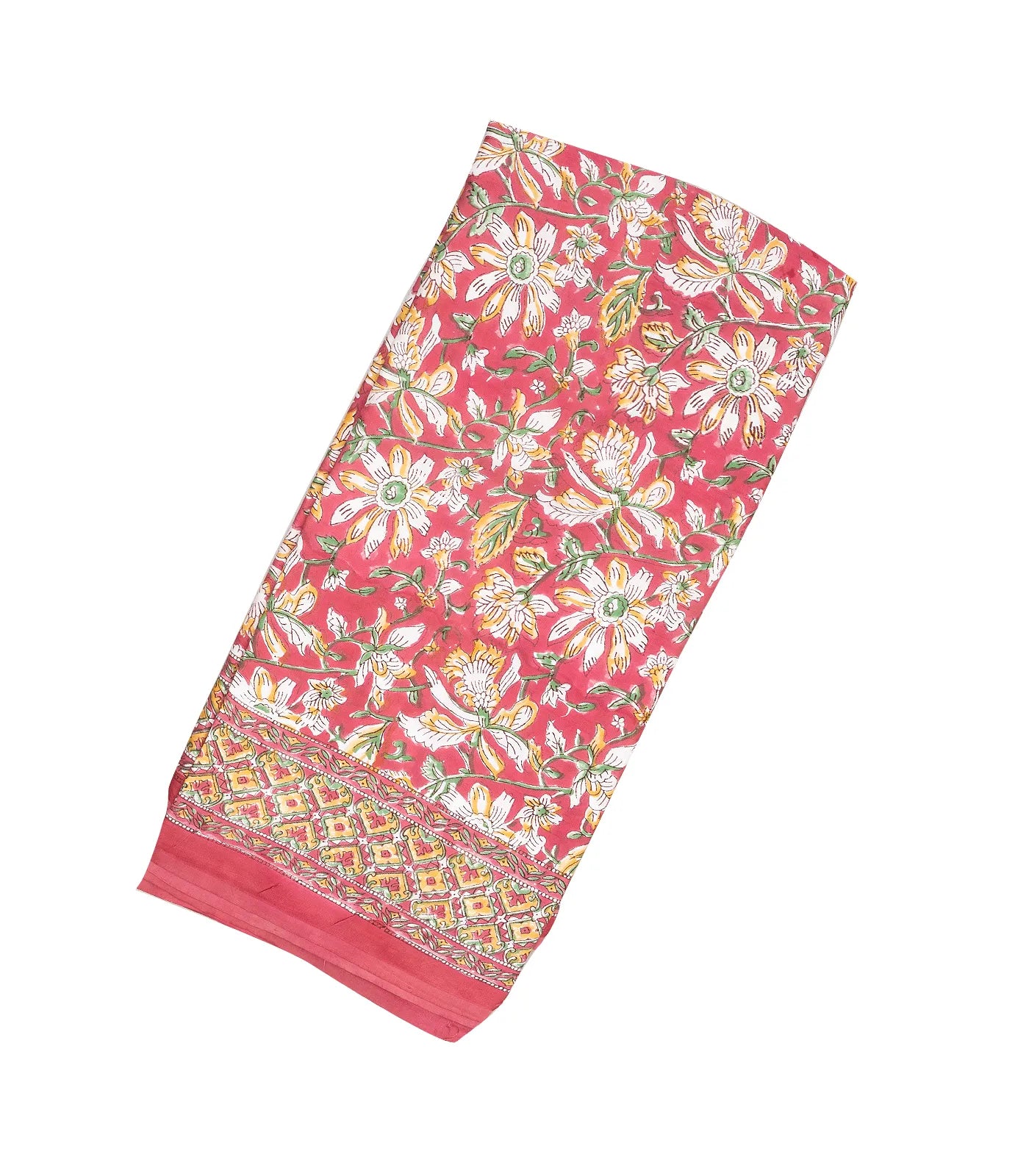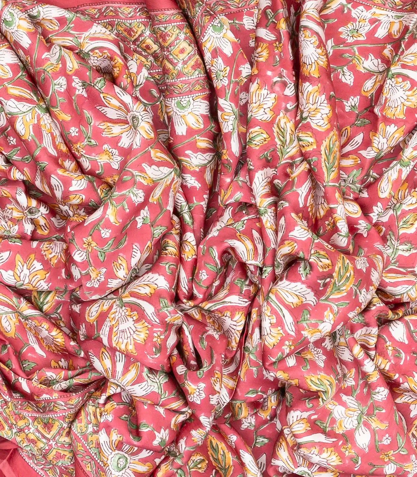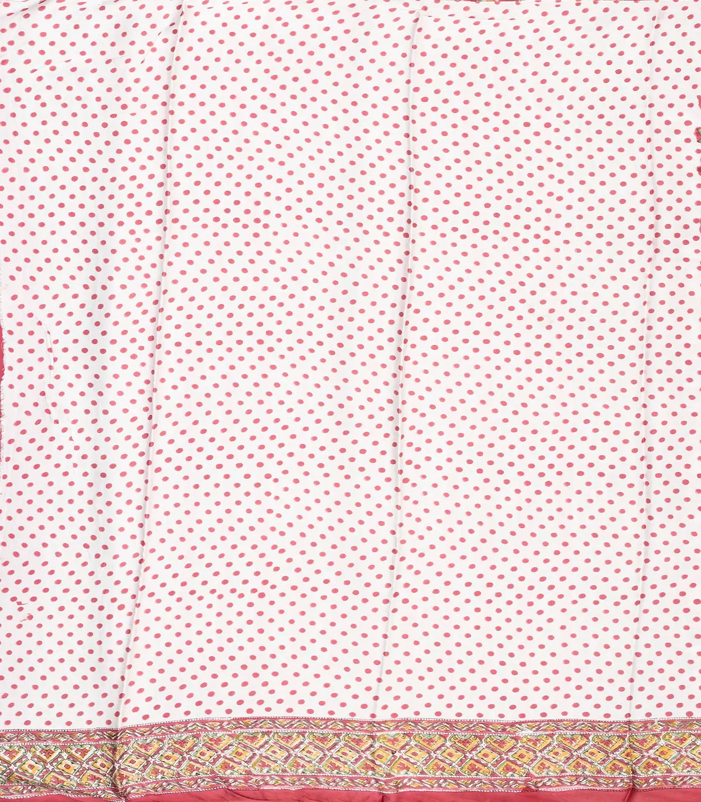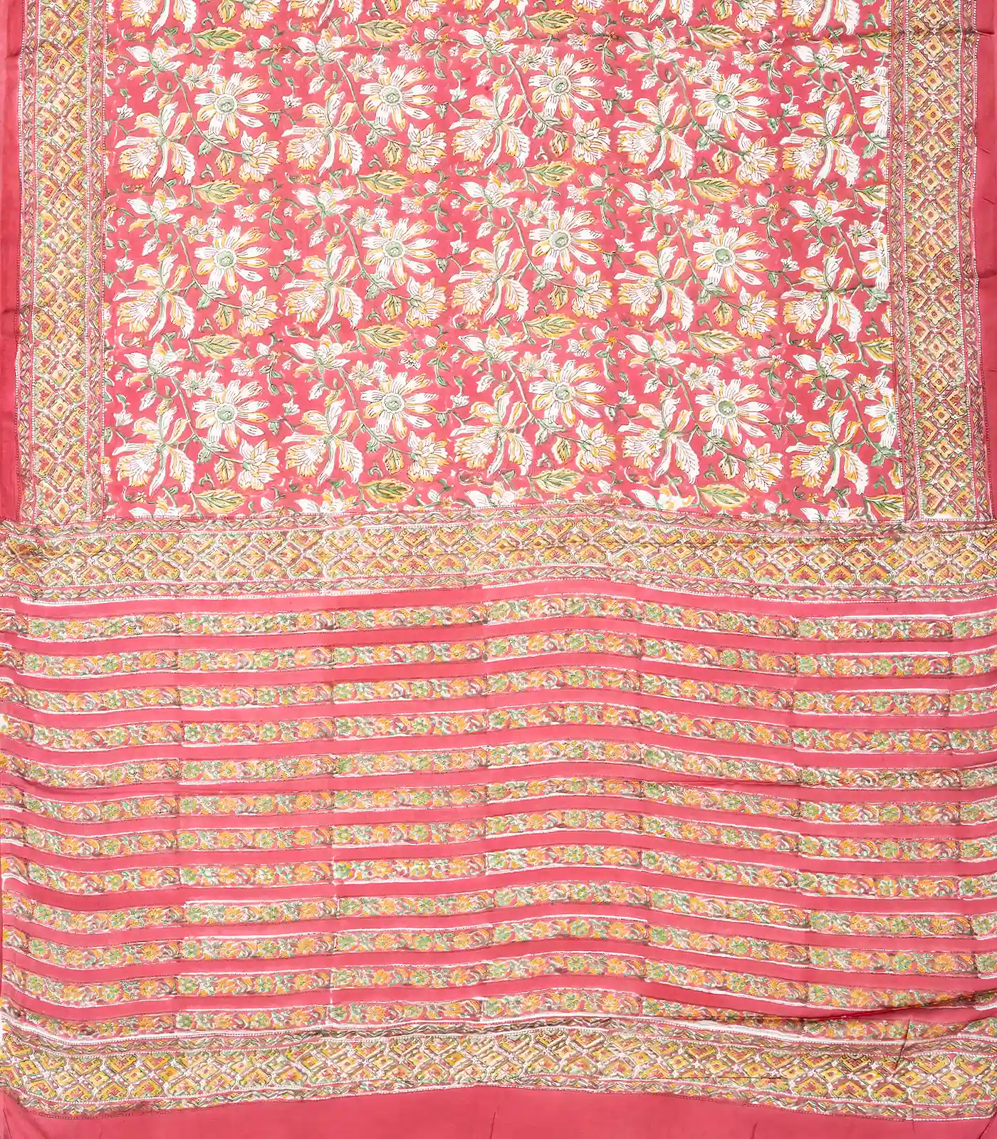 This woven modal silk saree is filled with ajrakh printed motifs in bubble-gum pink body along with border and pallu