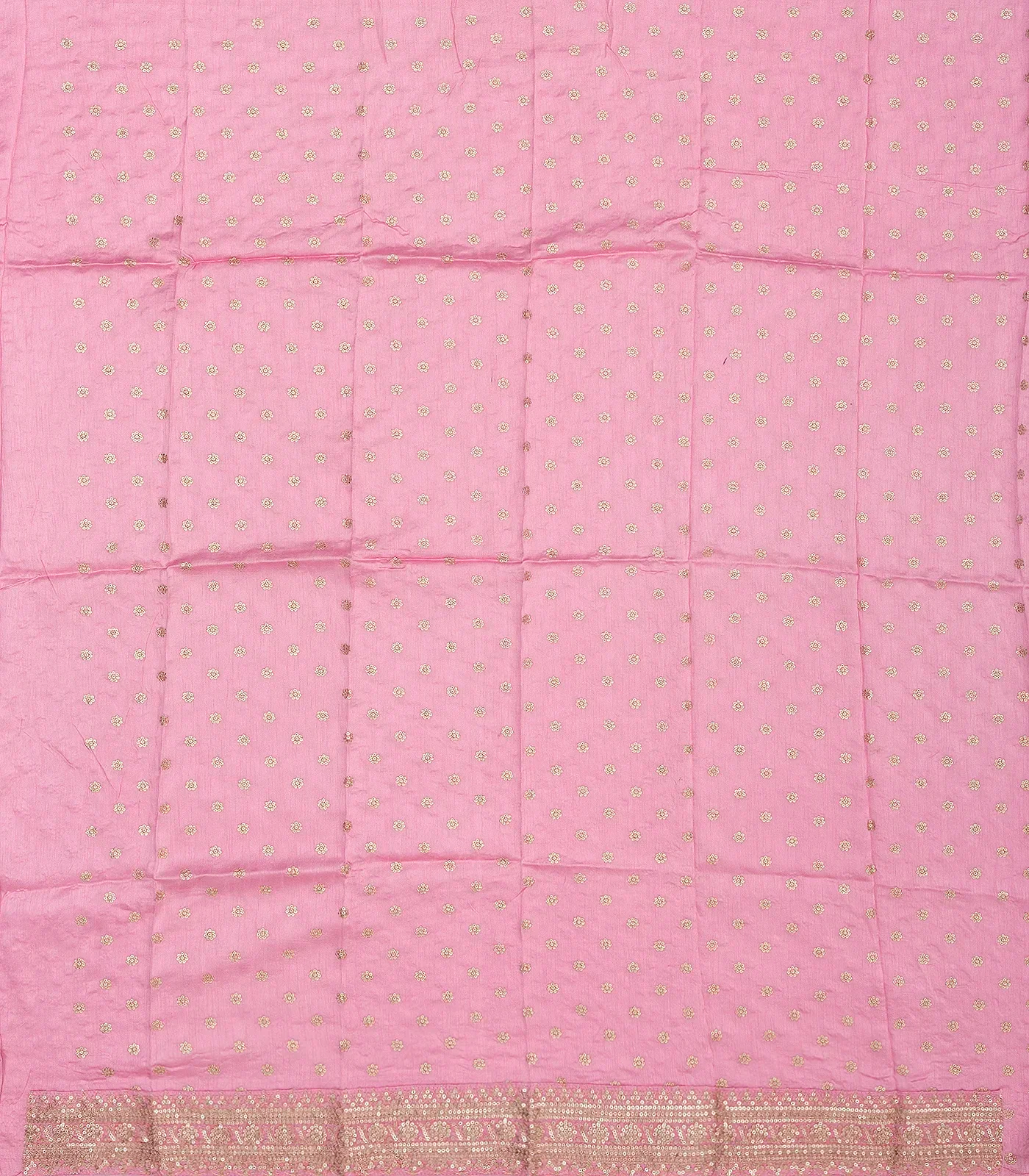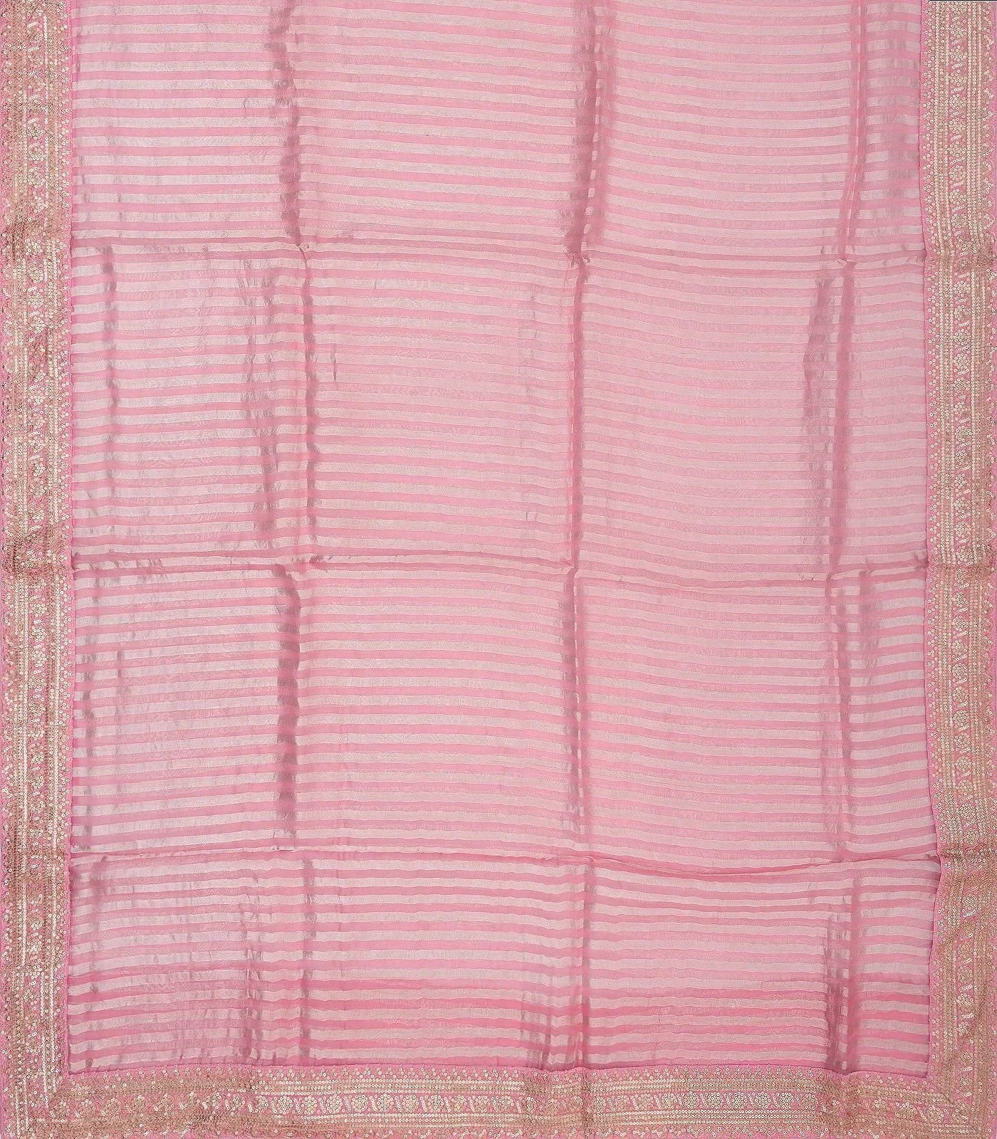 This woven pure organza silk saree is filled with zari stripes in bubble-gum pink body along with embroidered motifs in border and pallu