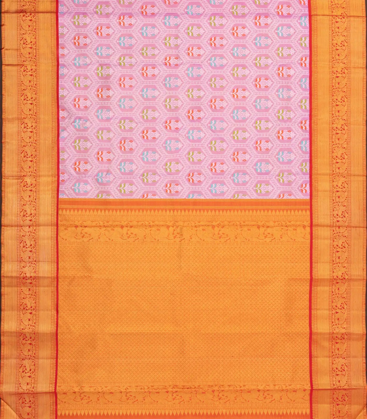 This handwoven kanchipuram silk saree is filled with meena floral motifs in BubbleGum pink body along with contrast zari border and pallu