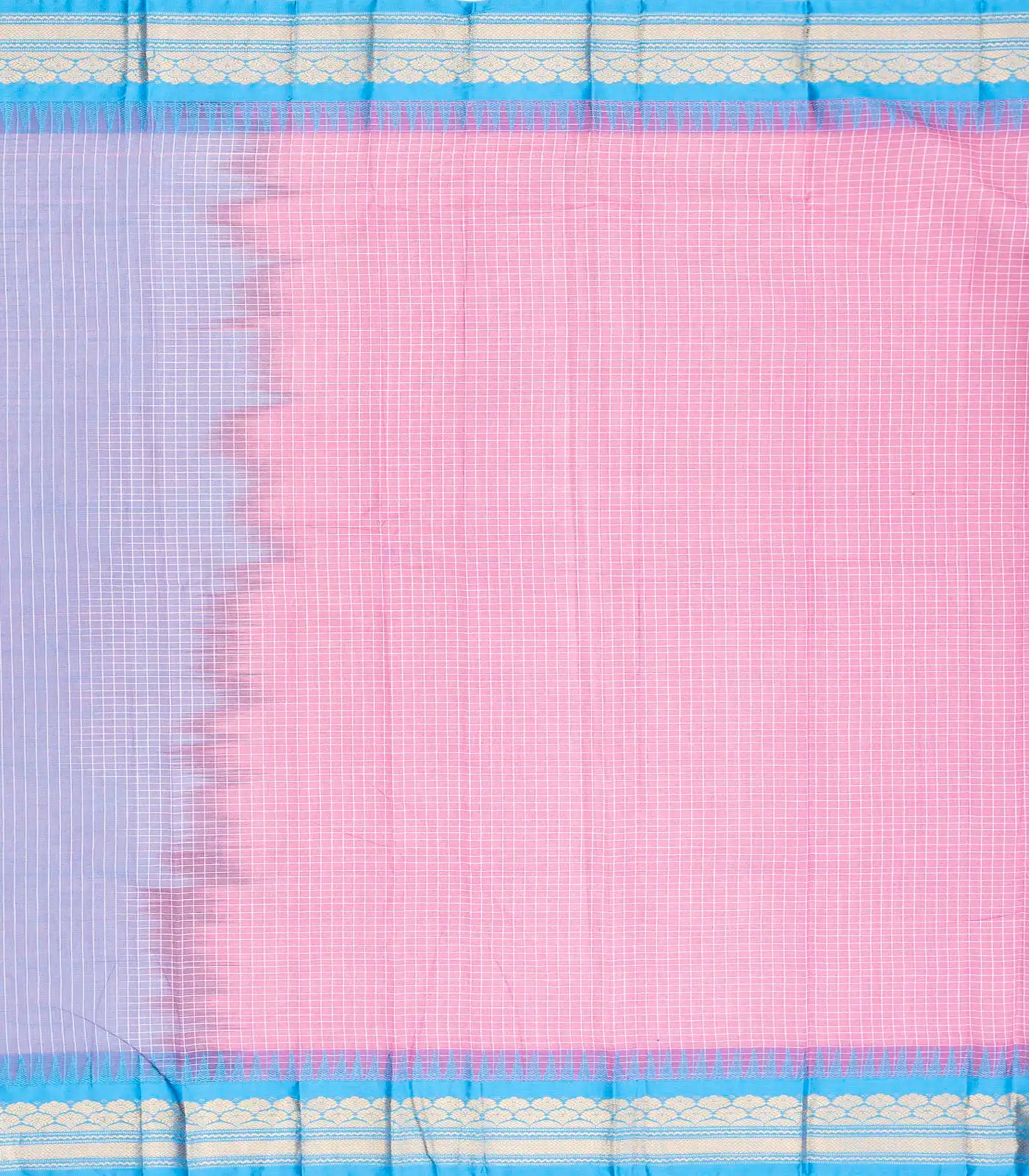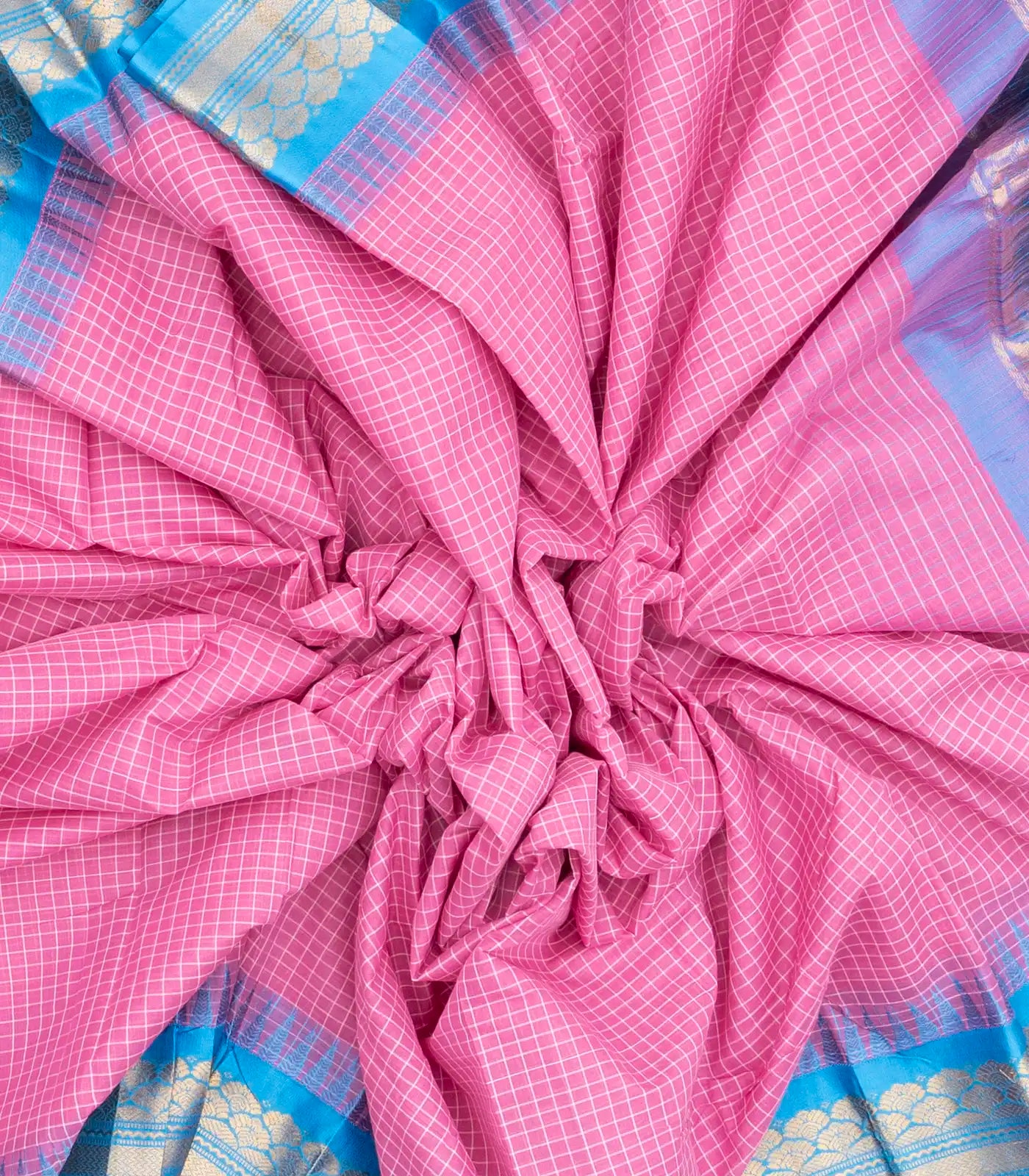This woven chirala cotton saree is filled with zari checks in BubbleGum pink body along with contrast temple border and pallu