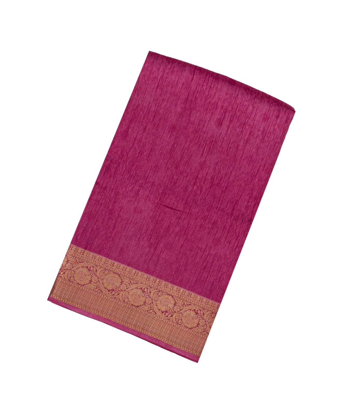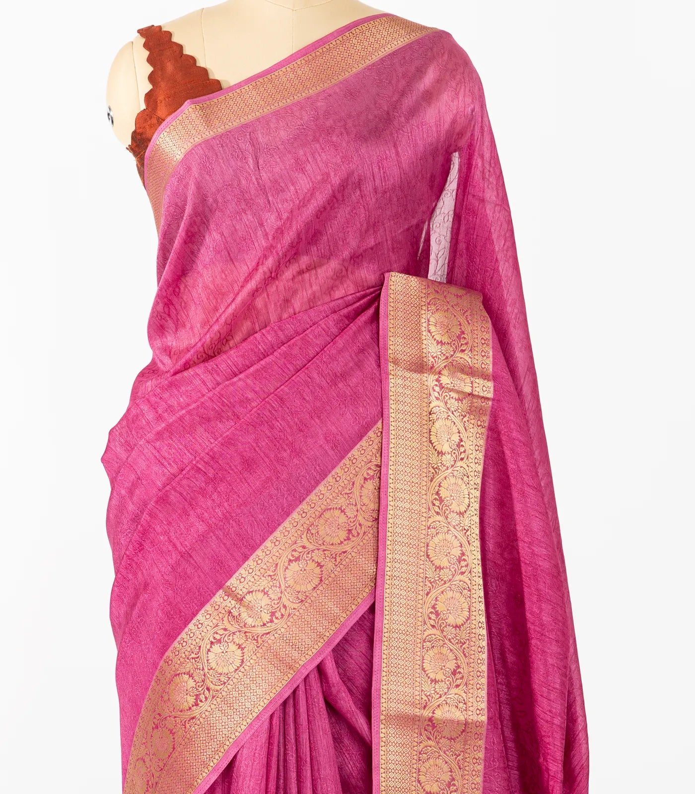 This woven synthetic dola silk saree is filled with floral motifs in BubbleGum pink body along with floral motifs in zari border and pallu