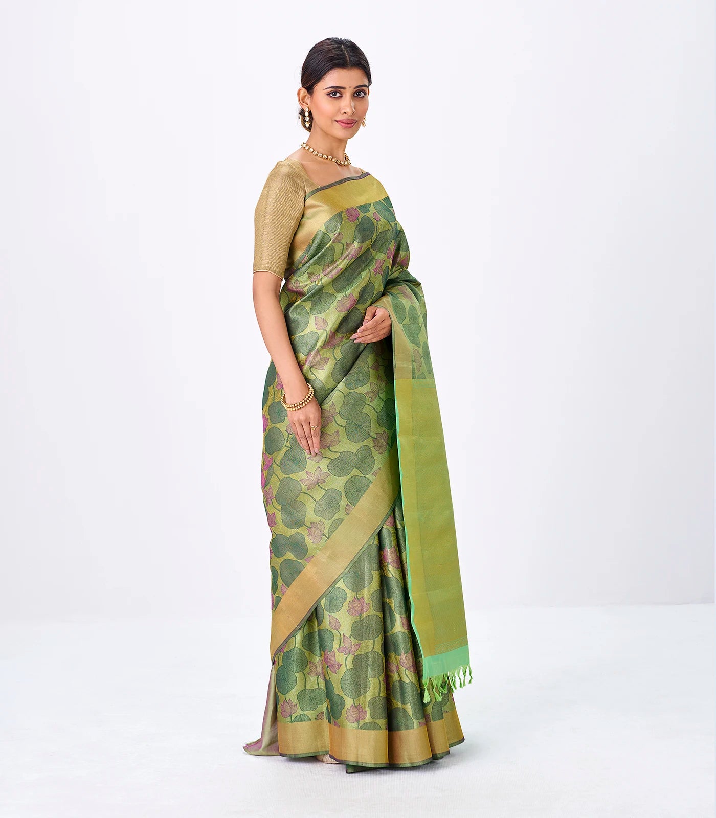 This handwoven kanchipuram silk saree is filled with lotus floral motifs in cardamom green body along with zari border and pallu