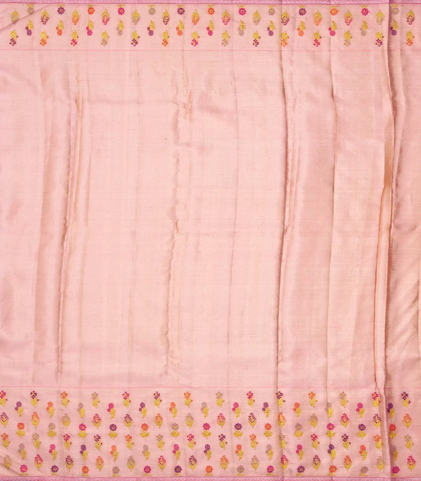 This handwoven kanchipuram tissue silk saree with zari tissue body along with floral motifs in contrast dusty pink border and pallu